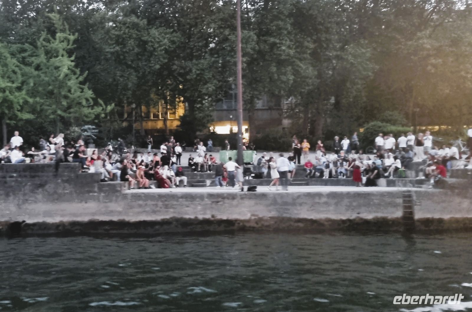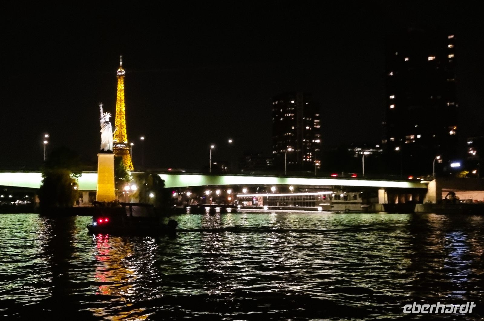 Abends entern wir zu Füßen des Eiffelturms eines der eleganten Restaurantschiffe von Bateaux Parisien, um bei einem Diner auf der Seine gemächlich an den angestrahlten Monumenten vorbeizugleiten. Zurück am Eiffelturm legt das Schiff im perfekten Moment wieder an, um die glitzernde Beleuchtung der Eisernen Lady zur vollen Stunde zu erleben.