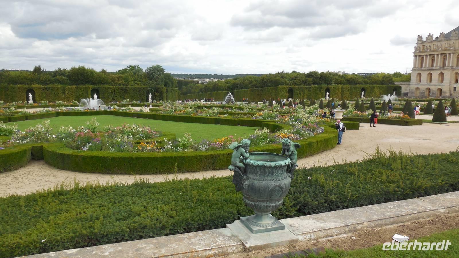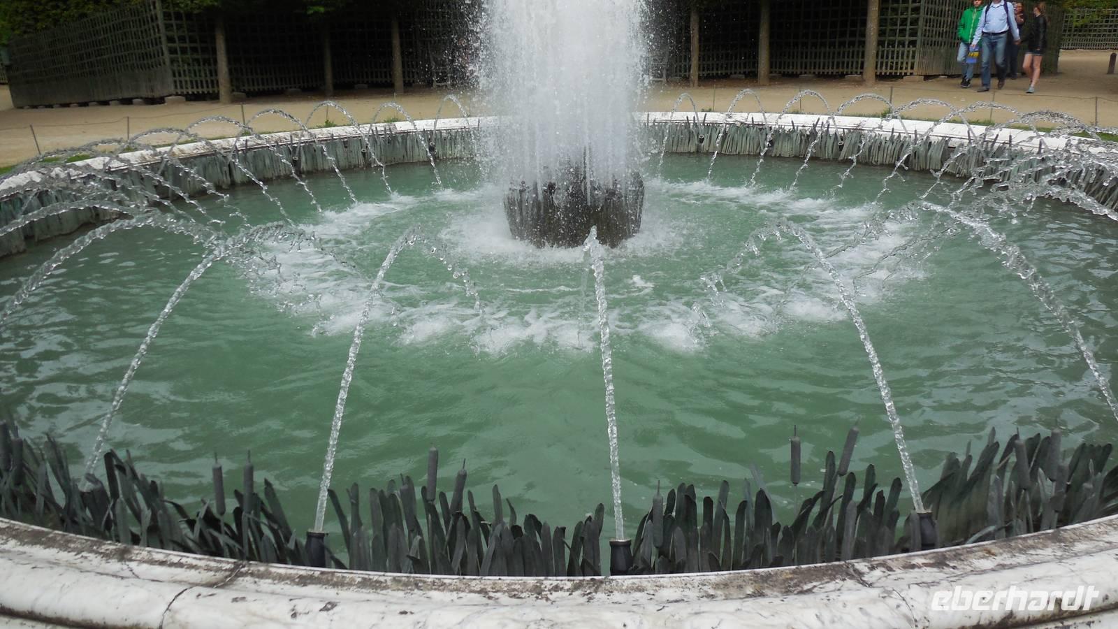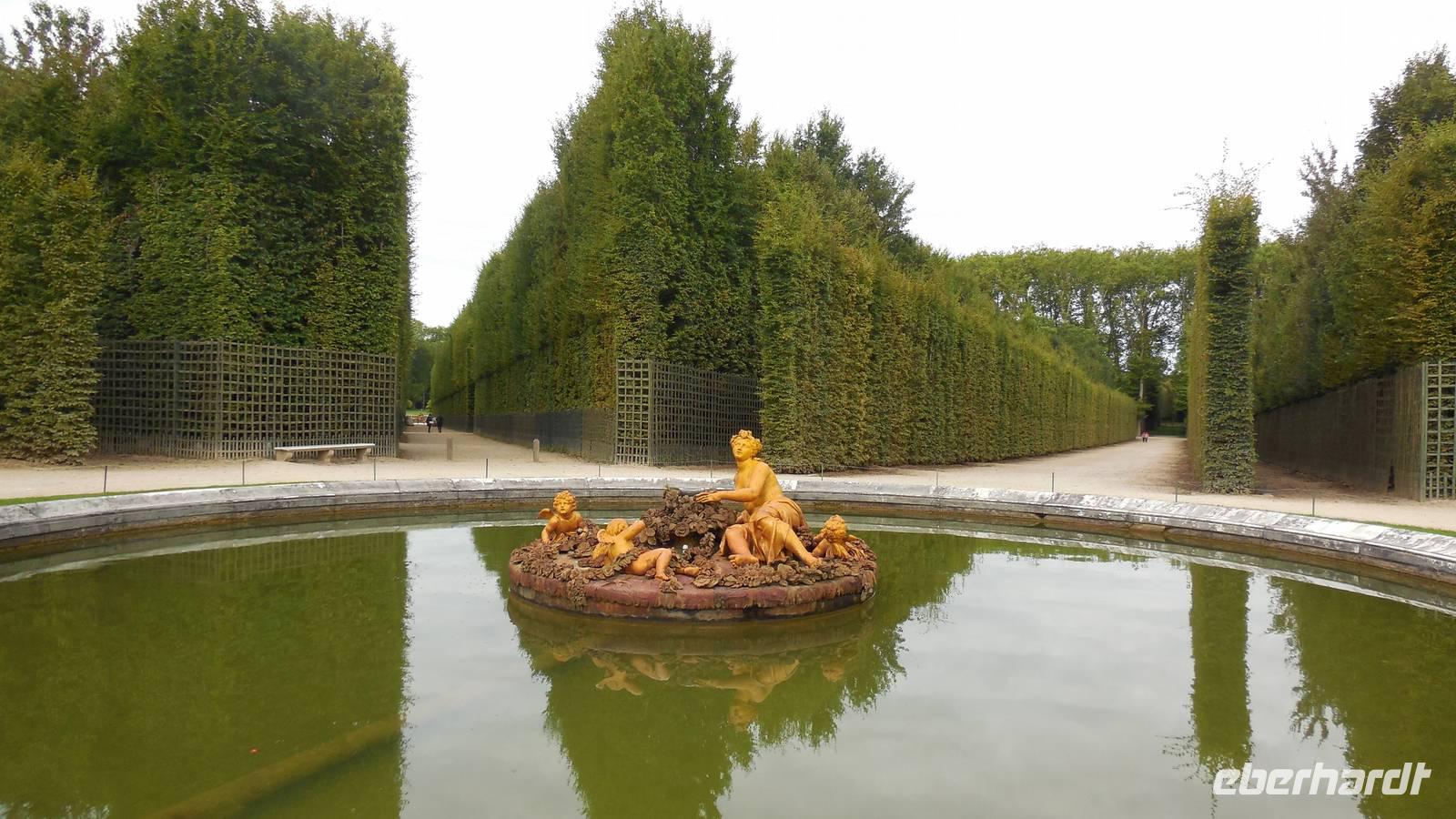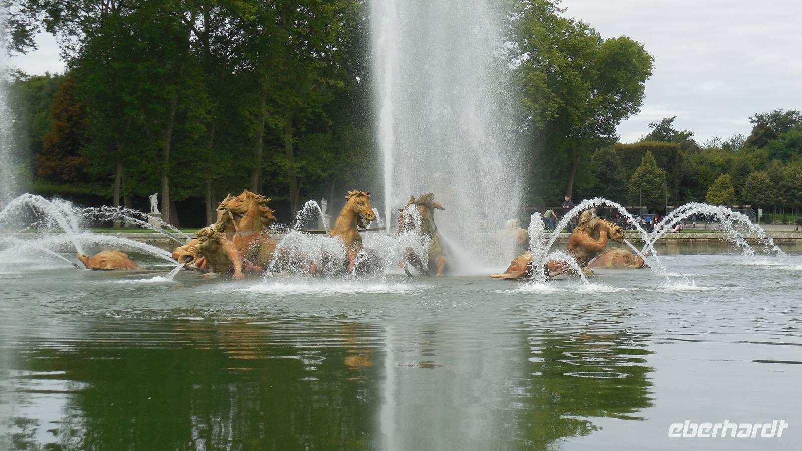 Da wir bereits Eintrittskarten haben, müssen wir uns wenigstens nicht am Kartenverkauf anstel-len. Aber auch am Schloss warten schon vor der Öffnung viele Menschen. Doch in der langen Warteschlange rückt es schnell voran. Nur bei den mitgebuchten Audioguides muss man noch-mals anstehen, und um Zeit zu sparen, schauen wir uns das Schloss mit dem berühmten Spiegelsaal dann ohne Erklärungen vom Band an und bewundern den Prunk des Sonnenkönigs in seinen Gemächern. Heute ist Sonntag und in Versailles sind in den Sommermonaten die Wasserspiele in Betrieb, was uns natürlich besonders freut. An einigen schönen Becken, sprudelt das Wasser für eine Stunde!