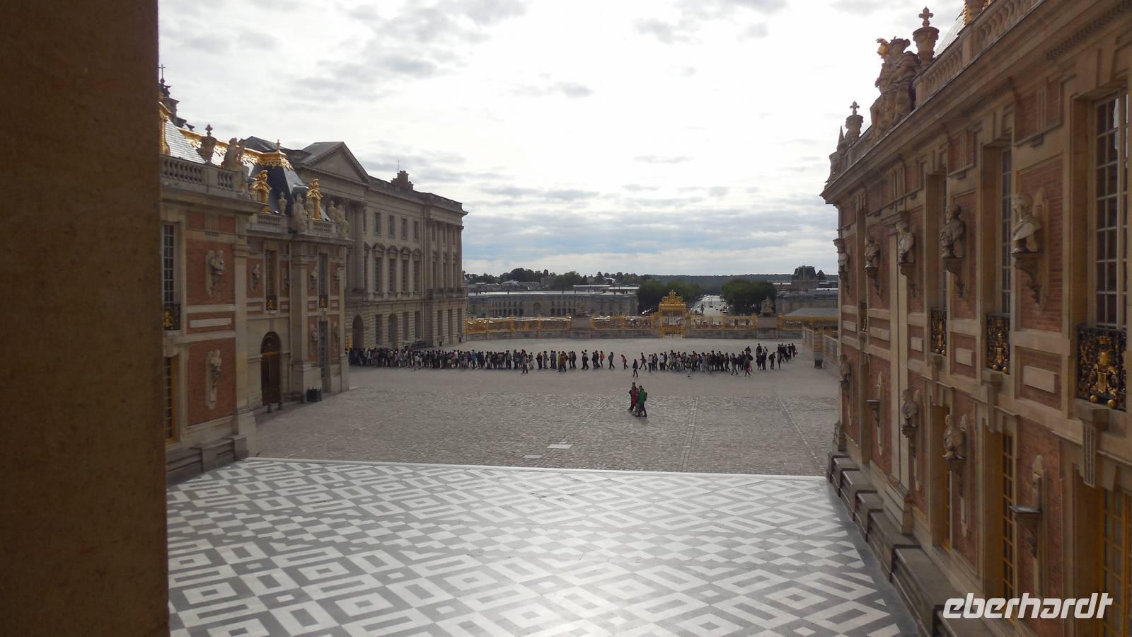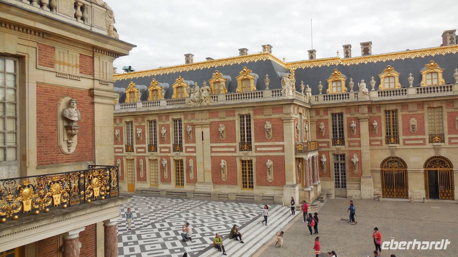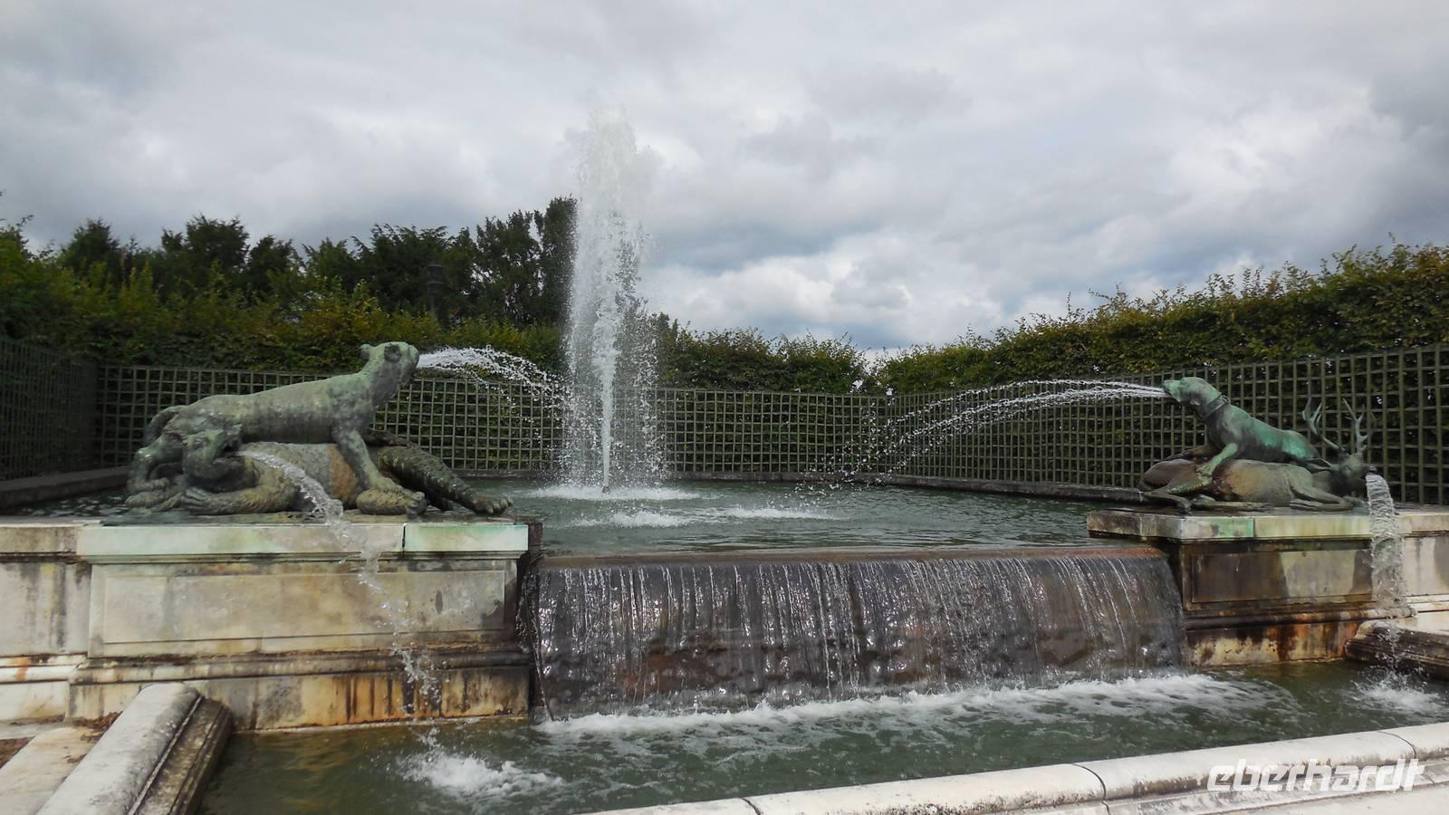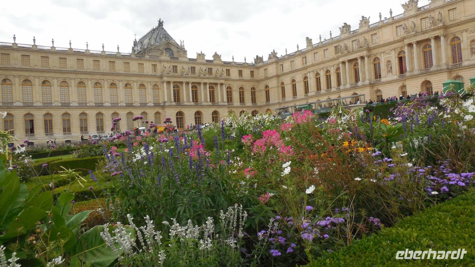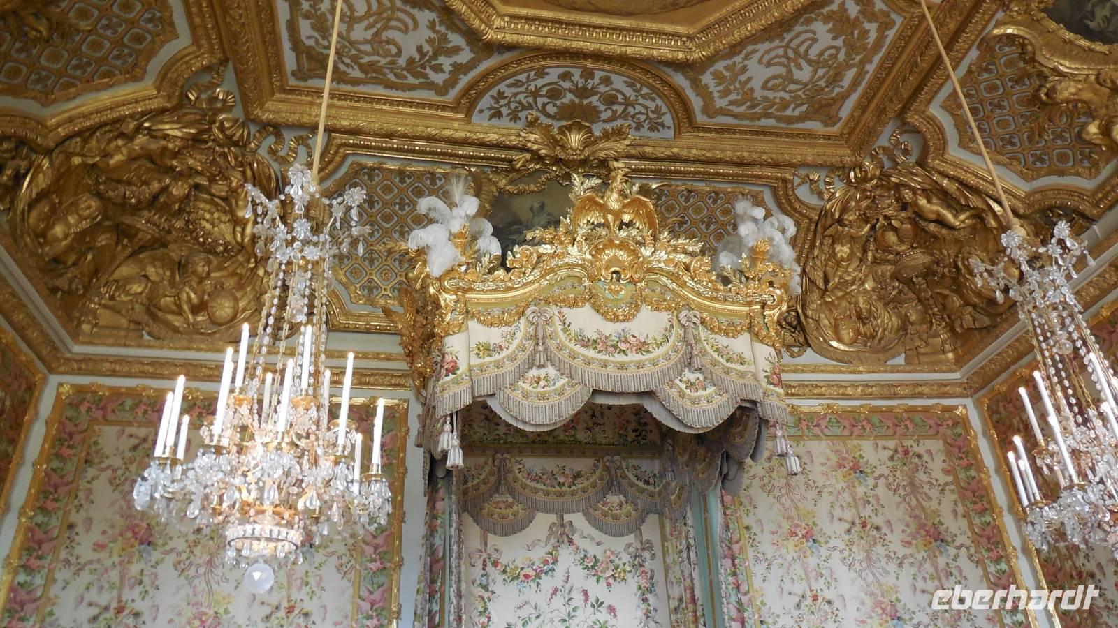 Da wir bereits Eintrittskarten haben, müssen wir uns wenigstens nicht am Kartenverkauf anstel-len. Aber auch am Schloss warten schon vor der Öffnung viele Menschen. Doch in der langen Warteschlange rückt es schnell voran. Nur bei den mitgebuchten Audioguides muss man noch-mals anstehen, und um Zeit zu sparen, schauen wir uns das Schloss mit dem berühmten Spiegelsaal dann ohne Erklärungen vom Band an und bewundern den Prunk des Sonnenkönigs in seinen Gemächern. Heute ist Sonntag und in Versailles sind in den Sommermonaten die Wasserspiele in Betrieb, was uns natürlich besonders freut. An einigen schönen Becken, sprudelt das Wasser für eine Stunde!