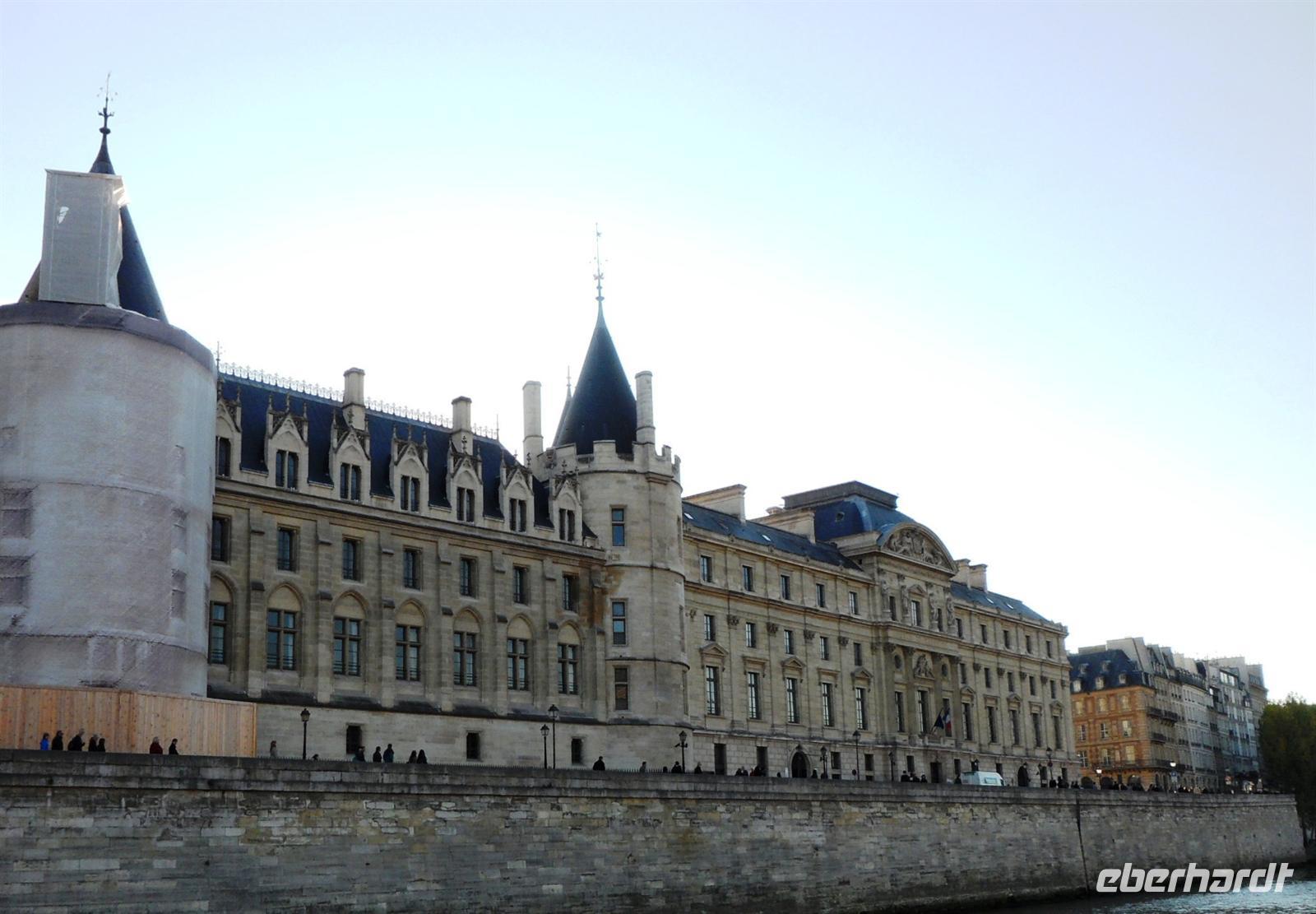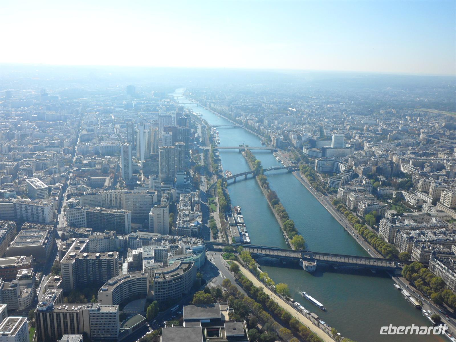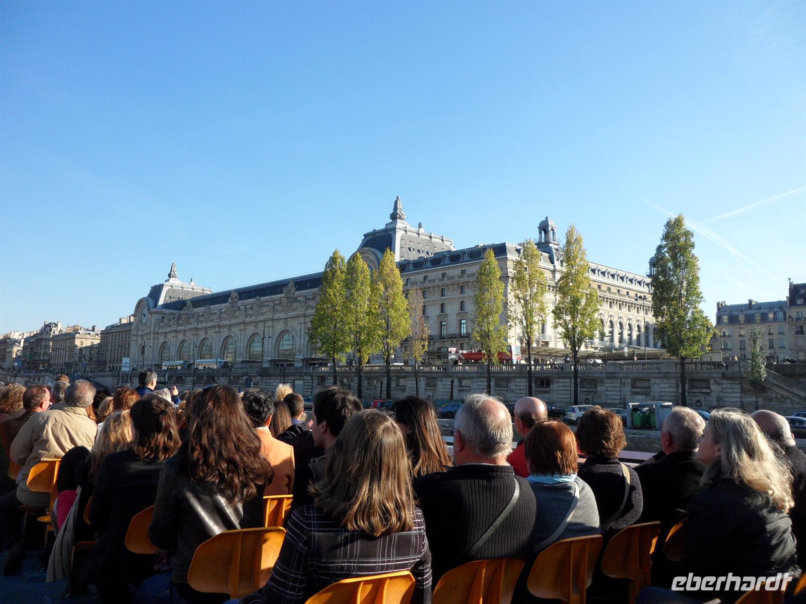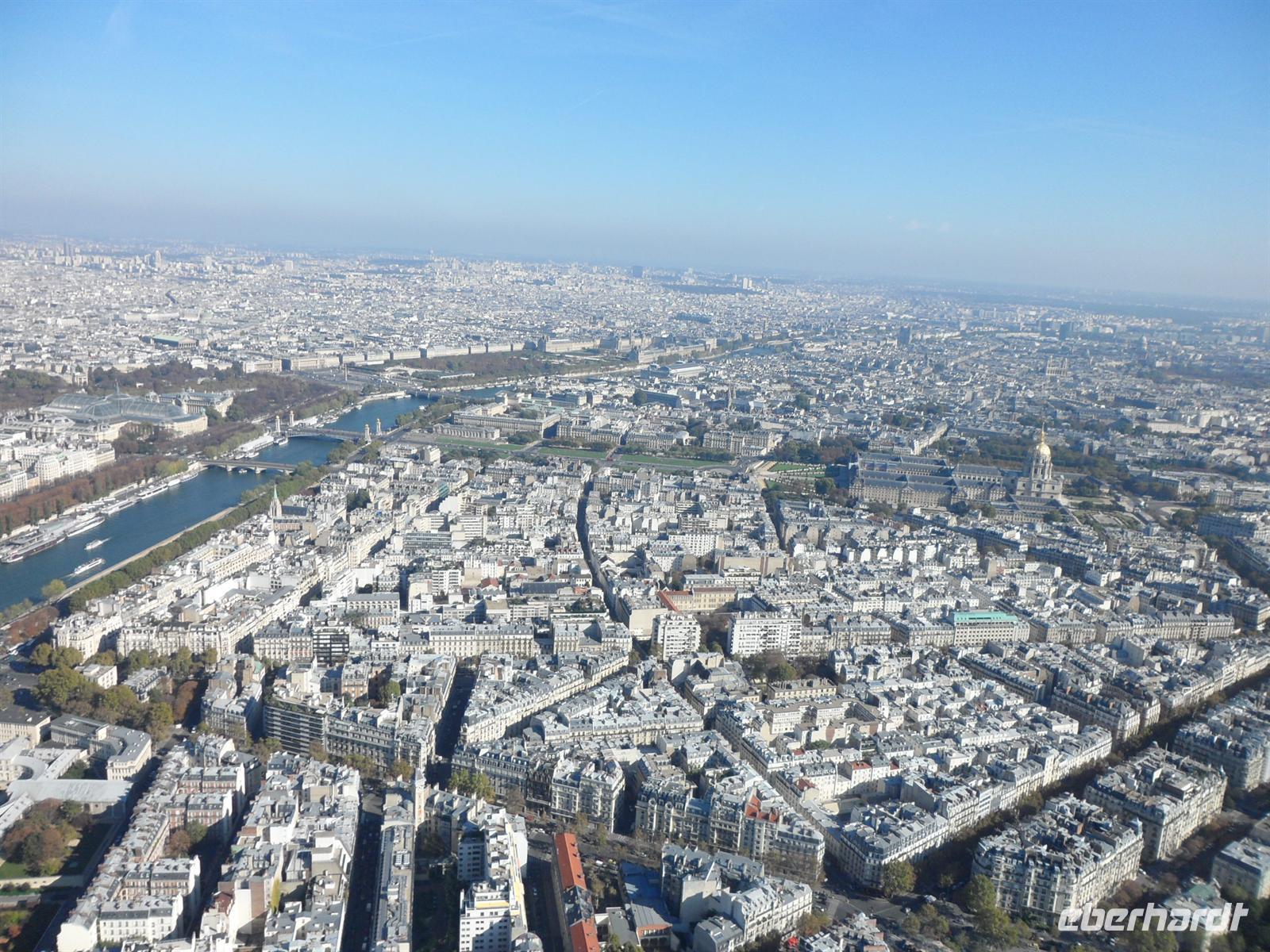 um bis zur Spitze hinauf zu fahren. Doch endlich standen wir in 276 m Höhe, über uns war nur noch die Antenne, wodurch der Eiffelturm ja 320 m hoch ist. Der Ausblick war grandios! Paris und die Seine lagen uns zu Füßen. Jeder für sich genoss diesen Moment einmal auf dem Eiffelturm zu sein ? Ganz individuell nahm dann jeder den Abstieg vor. Ab der zweiten Etage hatte man ja auch die Möglichkeit zu Fuss zu gehen. Dies bot vor allem interessante Ausblicke auf diese einzigartige Stahlkonstruktion. Man muss sich das wirklich einmal auf der Zunge zergehen lassen ? der Eiffelturm wiegt nur 7000 t und wird mit rund 2,5 Millionen Nieten zusammen gehalten. Nach diesem Höhepunkt des Tages fuhren wir kurz mit unserem Reisebus zur Bootsanlegestelle von Bateaux Mouches. Gegen 17 Uhr starteten wir dort zur Seinefahrt und sahen all die Sehenswürdigkeiten entlang der Seine: Pont Alexandre III, Musée d?Orsay, Louvre, Ile de la Cité, Hôtel de Ville, Conciergerie, Petit und Grand Palais und natürlich wieder den Eiffelturm im so langsam einsetzenden Abendlicht.