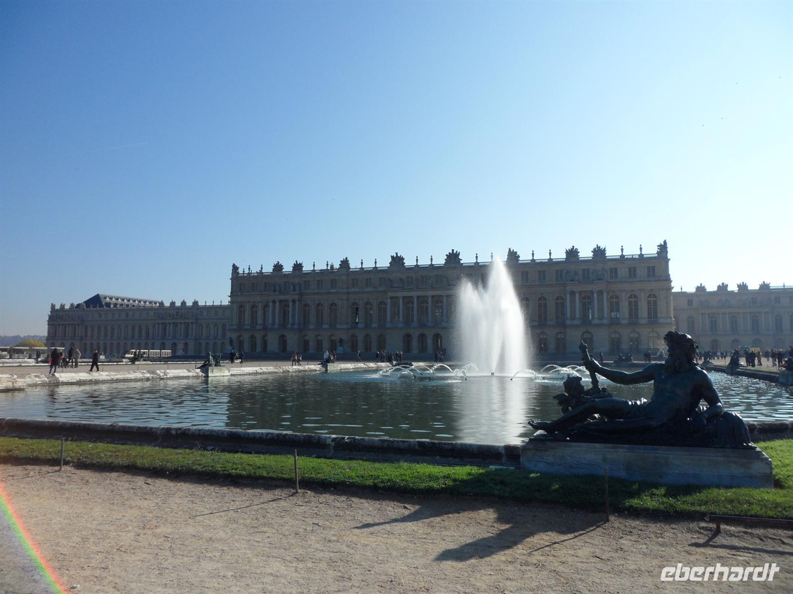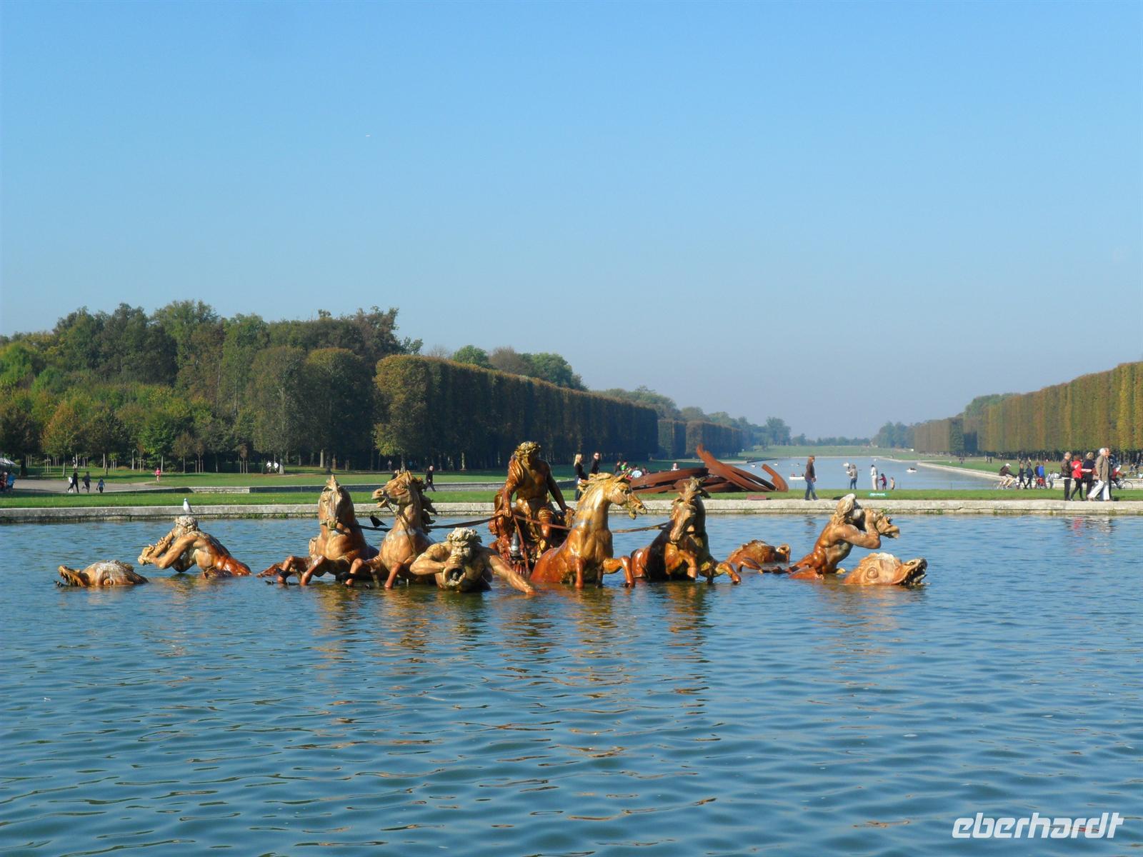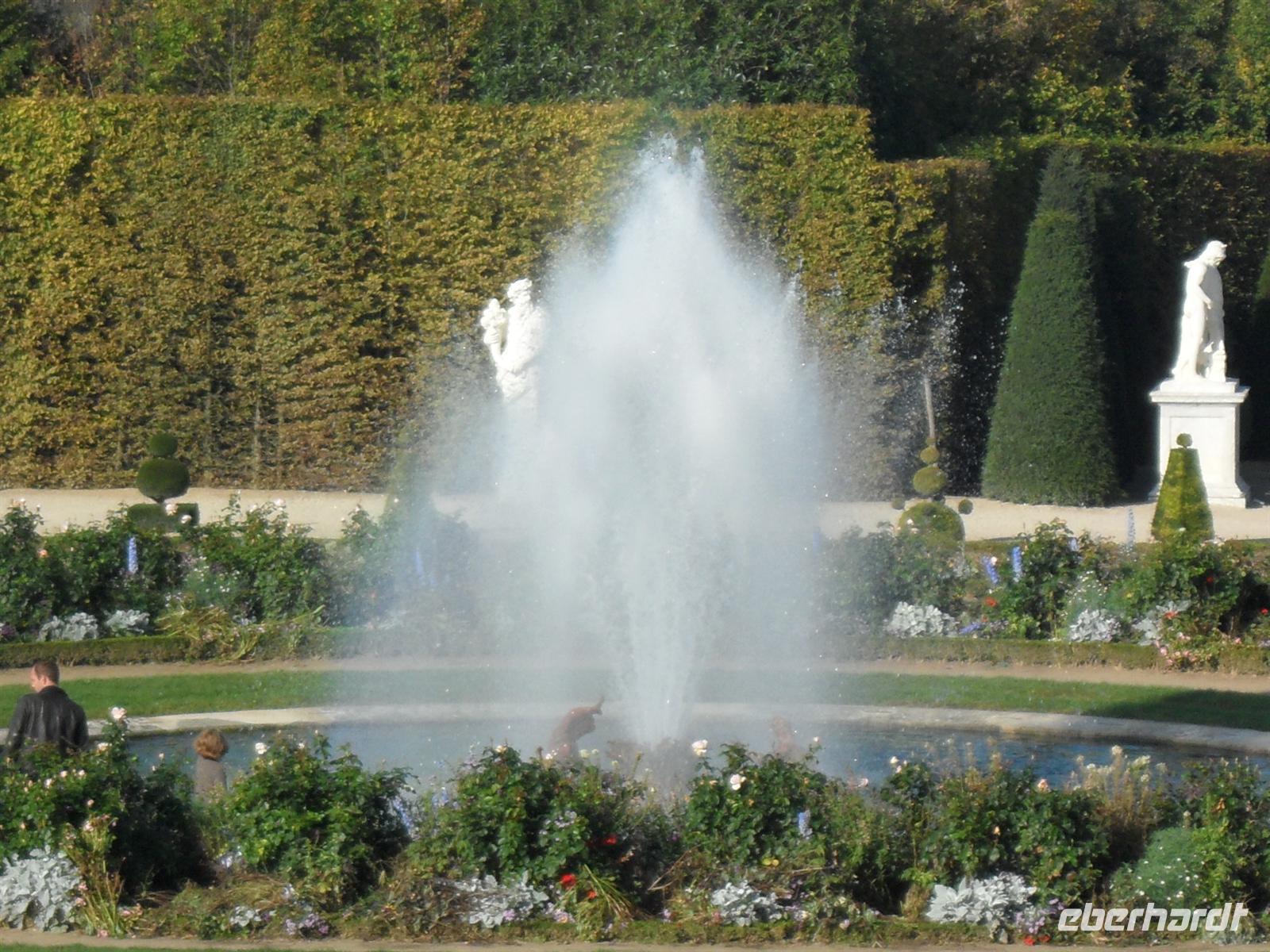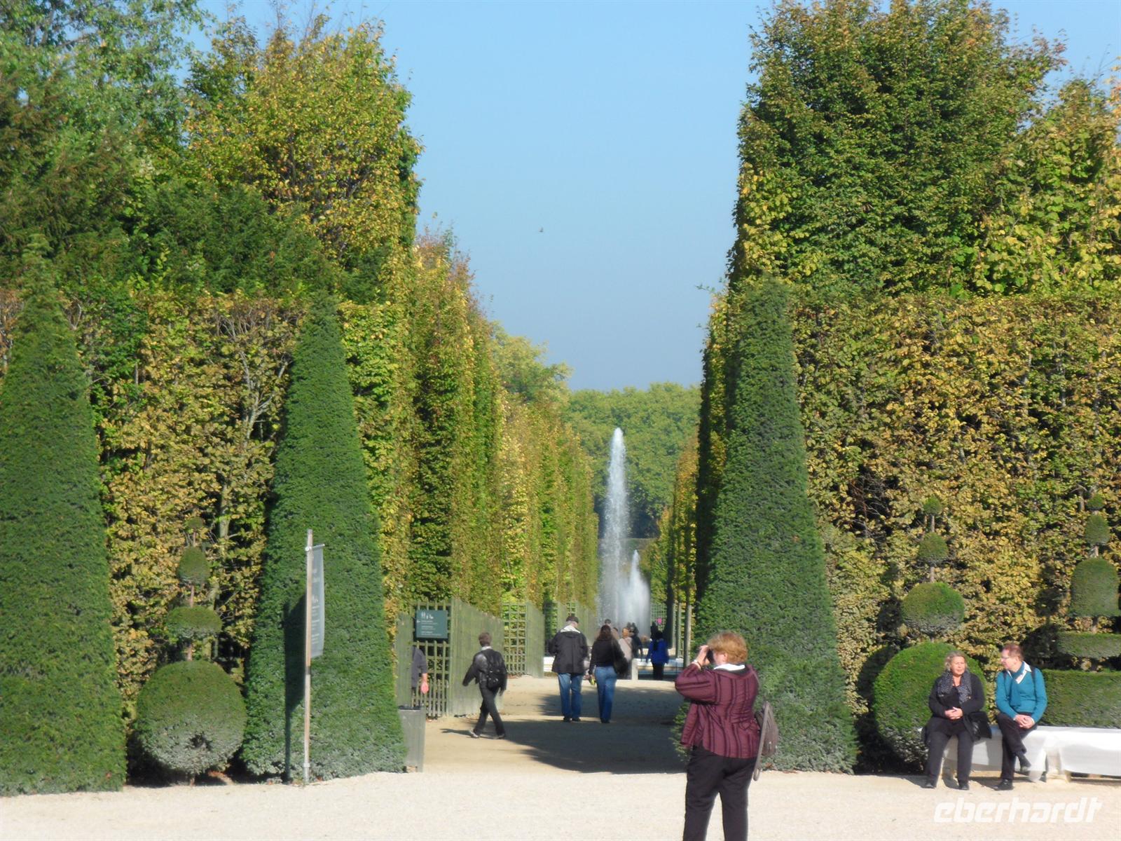 Am heutigen Sonntag starteten wir schon einmal ein wenig zeitiger, um möglichst zu den ersten Besuchern im Schloss von Versailles zu gehören. So war es dann tatsächlich auch! Ohne langes Warten standen wir dann sehr schnell in der Vorhalle des berühmten Schlosses von Versailles. Nun tauchten wir ein ins ausgehende 17. Jahrhundert ? Trotz vieler anderer Besucher bummelten wir durch die einzelnen Gänge und Säle und standen schließlich im sagenumwobenen Spiegelsaal, in dem ja 1871 der deutsche Kaiser das Kaiserreich proklamiert hatte und 1919 der Versailler Friedensvertrag unterzeichnet worden war ? beides Umstände, die die deutsch-französischen Beziehungen auf lange Sicht erkühlen hatten lassen! Um dem dichten Menschengedränge im Schloss zu entfliehen, trafen wir uns nach etwa einer anderthalben Stunde wieder und gingen in die weitläufigen Gärten (800 ha). Pünktlich zum Einsetzen der Wasserspiele flanierten wir über die verschiedenen Terrassen