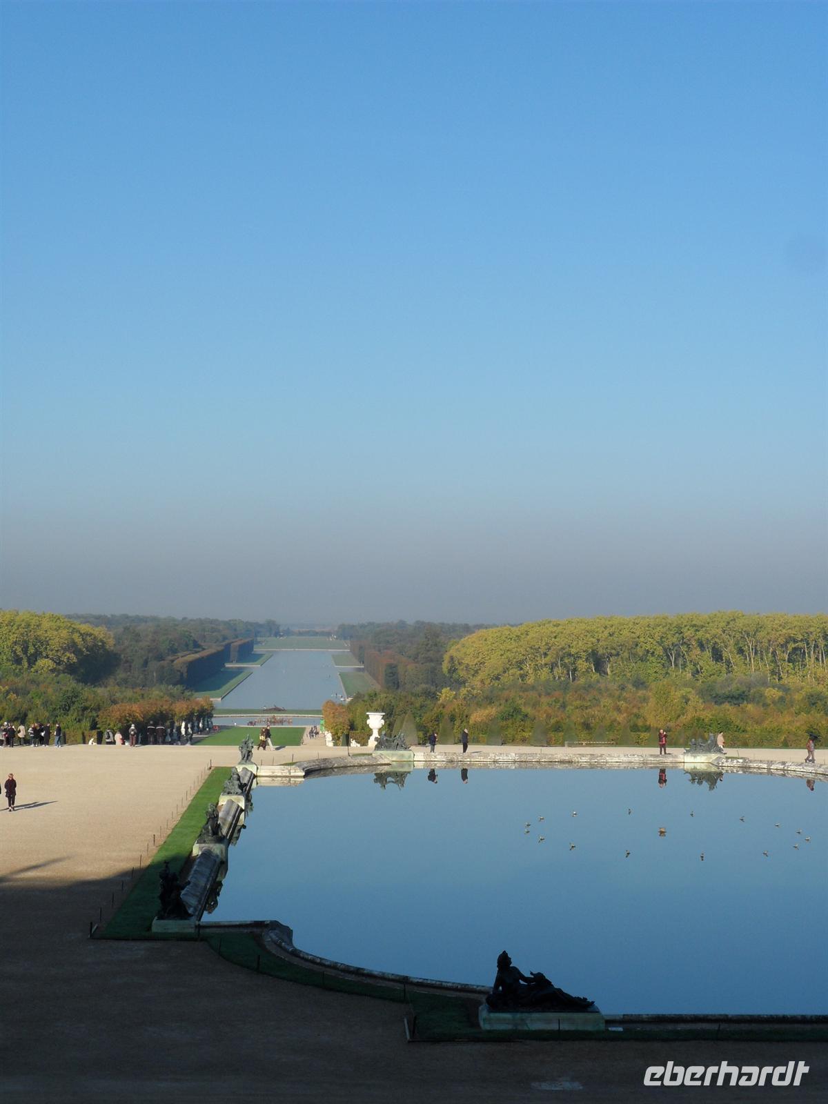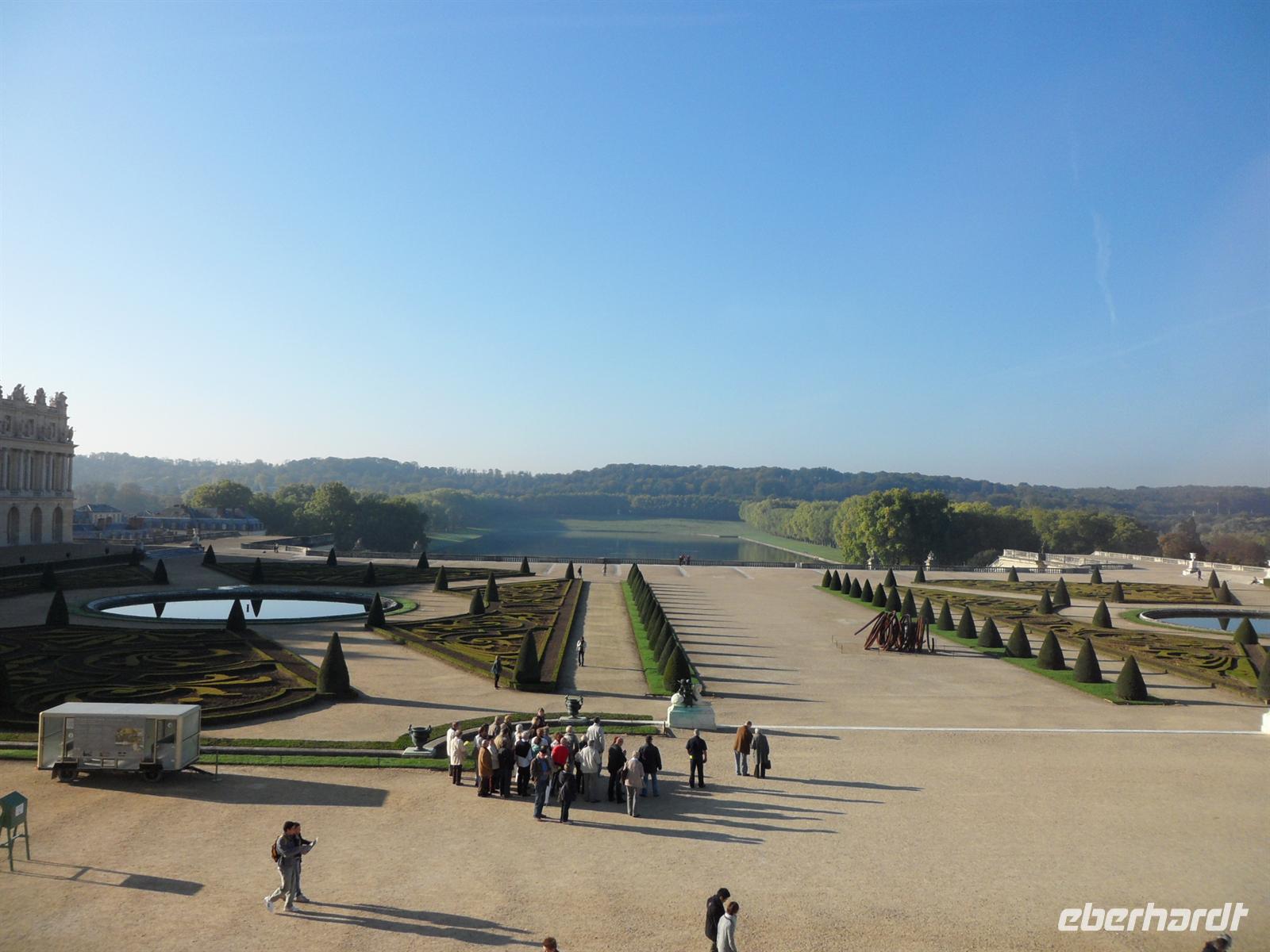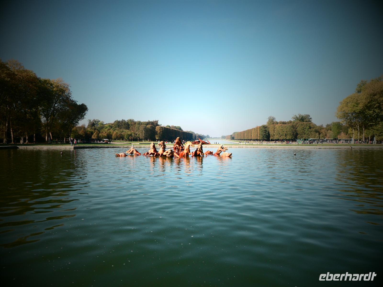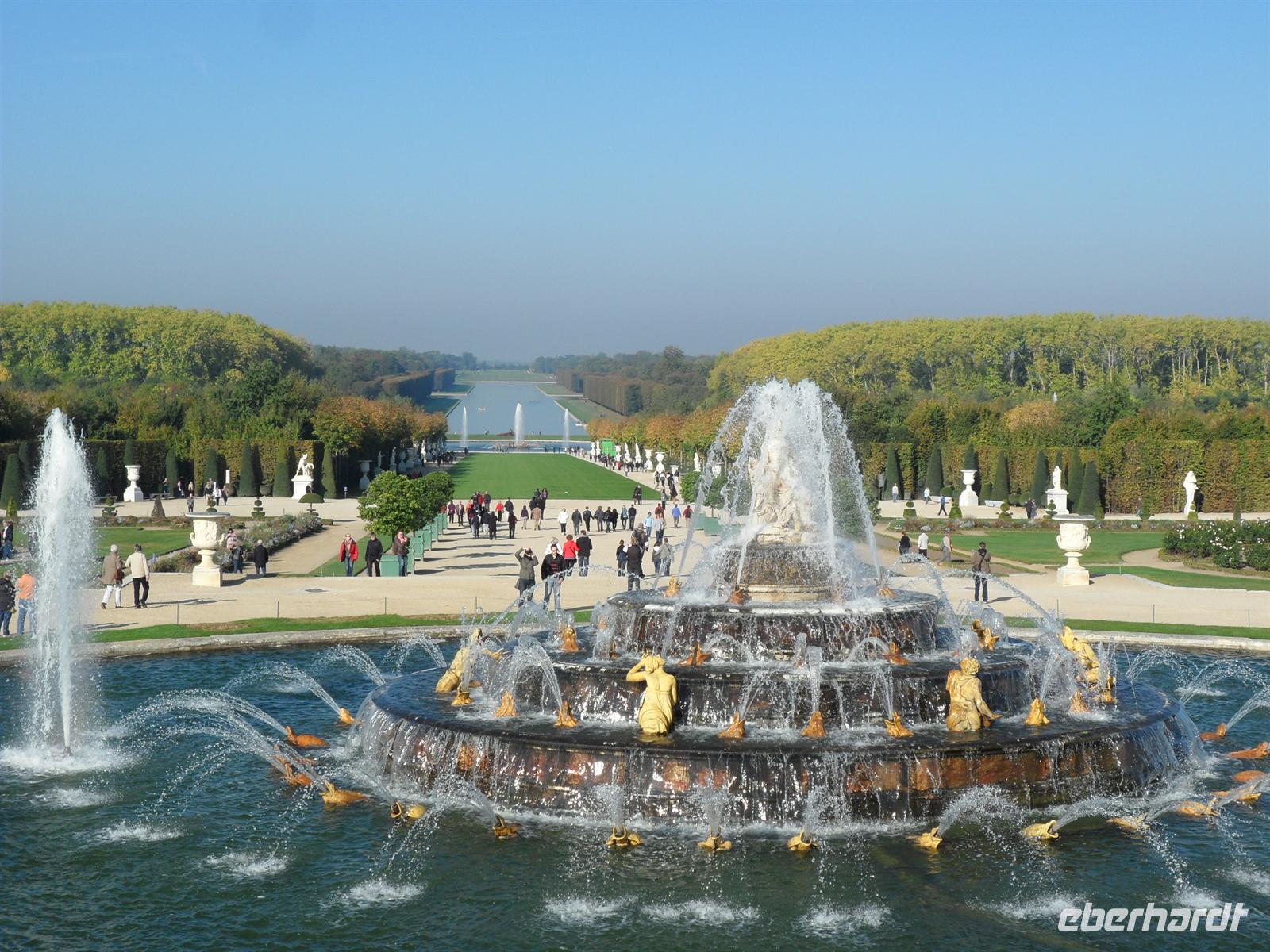 Am heutigen Sonntag starteten wir schon einmal ein wenig zeitiger, um möglichst zu den ersten Besuchern im Schloss von Versailles zu gehören. So war es dann tatsächlich auch! Ohne langes Warten standen wir dann sehr schnell in der Vorhalle des berühmten Schlosses von Versailles. Nun tauchten wir ein ins ausgehende 17. Jahrhundert ? Trotz vieler anderer Besucher bummelten wir durch die einzelnen Gänge und Säle und standen schließlich im sagenumwobenen Spiegelsaal, in dem ja 1871 der deutsche Kaiser das Kaiserreich proklamiert hatte und 1919 der Versailler Friedensvertrag unterzeichnet worden war ? beides Umstände, die die deutsch-französischen Beziehungen auf lange Sicht erkühlen hatten lassen! Um dem dichten Menschengedränge im Schloss zu entfliehen, trafen wir uns nach etwa einer anderthalben Stunde wieder und gingen in die weitläufigen Gärten (800 ha). Pünktlich zum Einsetzen der Wasserspiele flanierten wir über die verschiedenen Terrassen