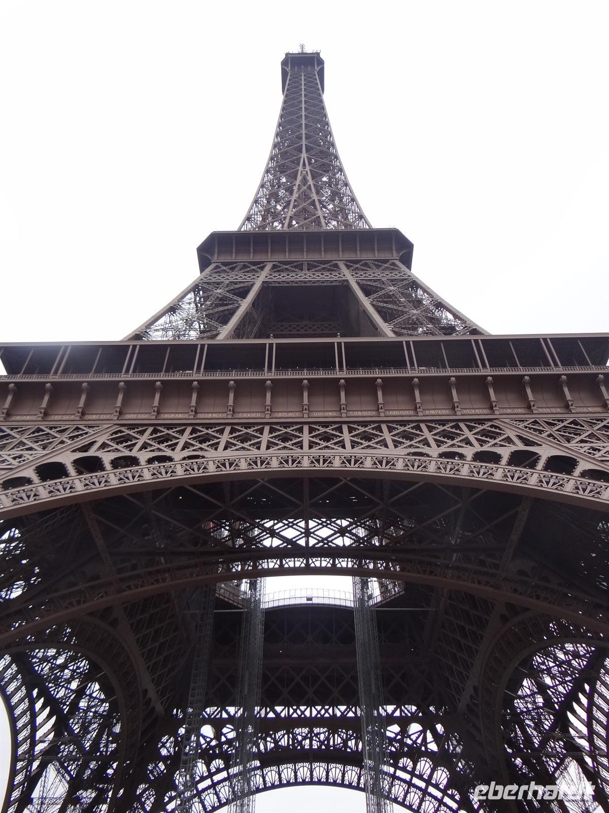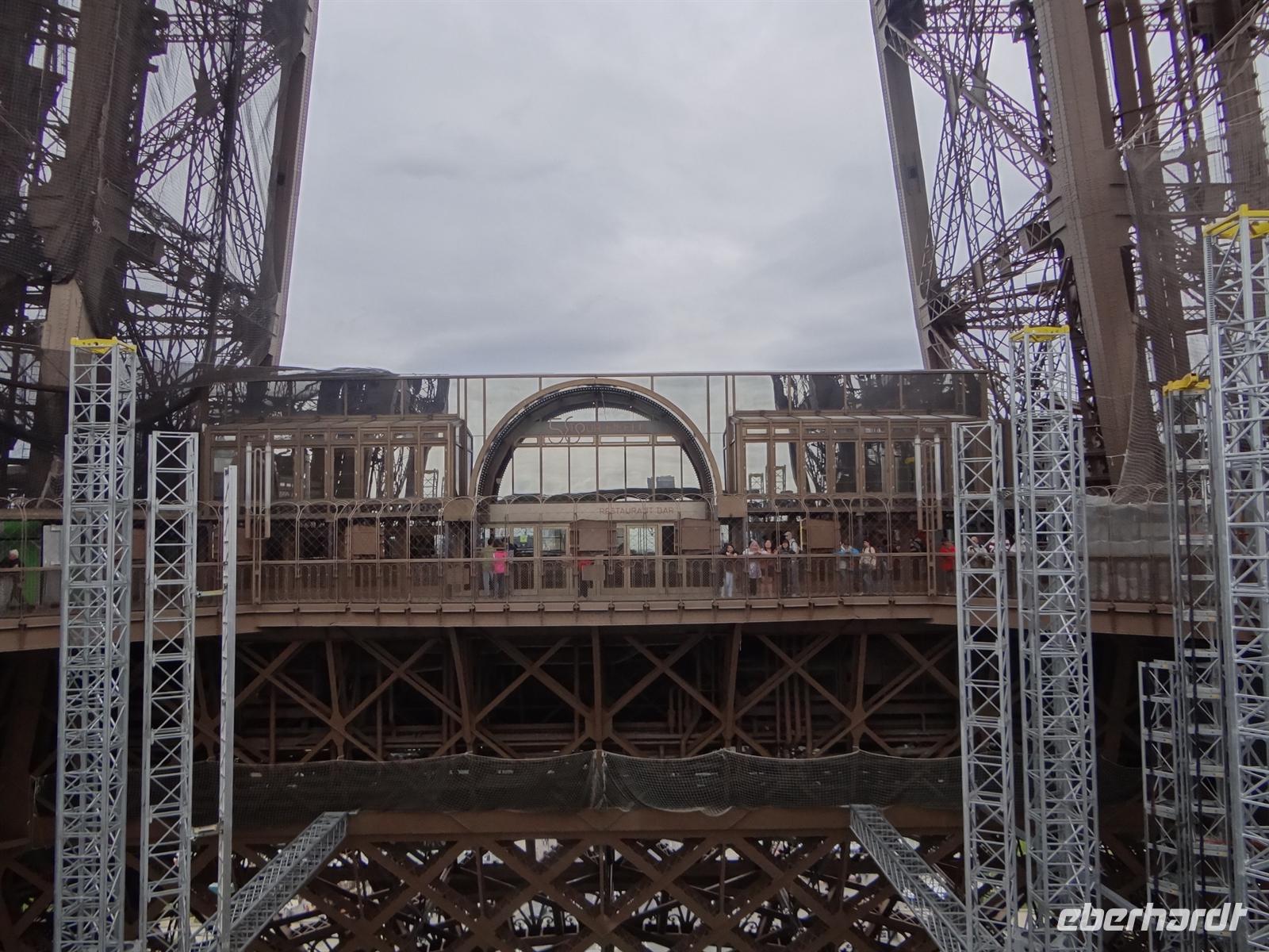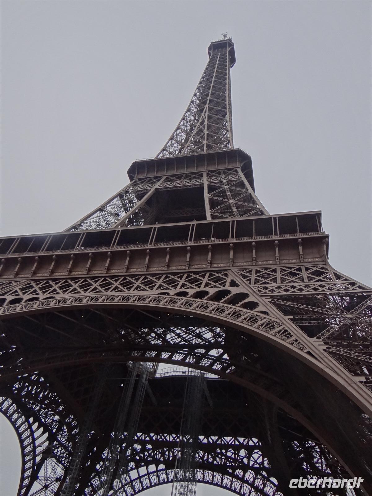 Heute probieren wir unser Glück erneut auf den Eiffelturm zu steigen. Wir fahren früher los vom Hotel, sodass wir uns gegen 08:40 Uhr am Eiffelturm befinden. Die Schlange sieht schon recht lang aus. Wir stellen uns dennoch an mit der Hoffnung, dass wir in den nächsten Stunden über Paris schauen und staunen können. Peu à peu kommen wir dem einzigen Fuße des Turmes näher, von wo aus ein Aufzug uns nach oben bringen wird. Wir tauschen Eindrücke der Reise aus und beobachten, wie sich der Aufzug entlang des Eiffelturmbeins bewegt. Die letzten Meter... Nach zwei Stunden erreichen wir die Spitze.