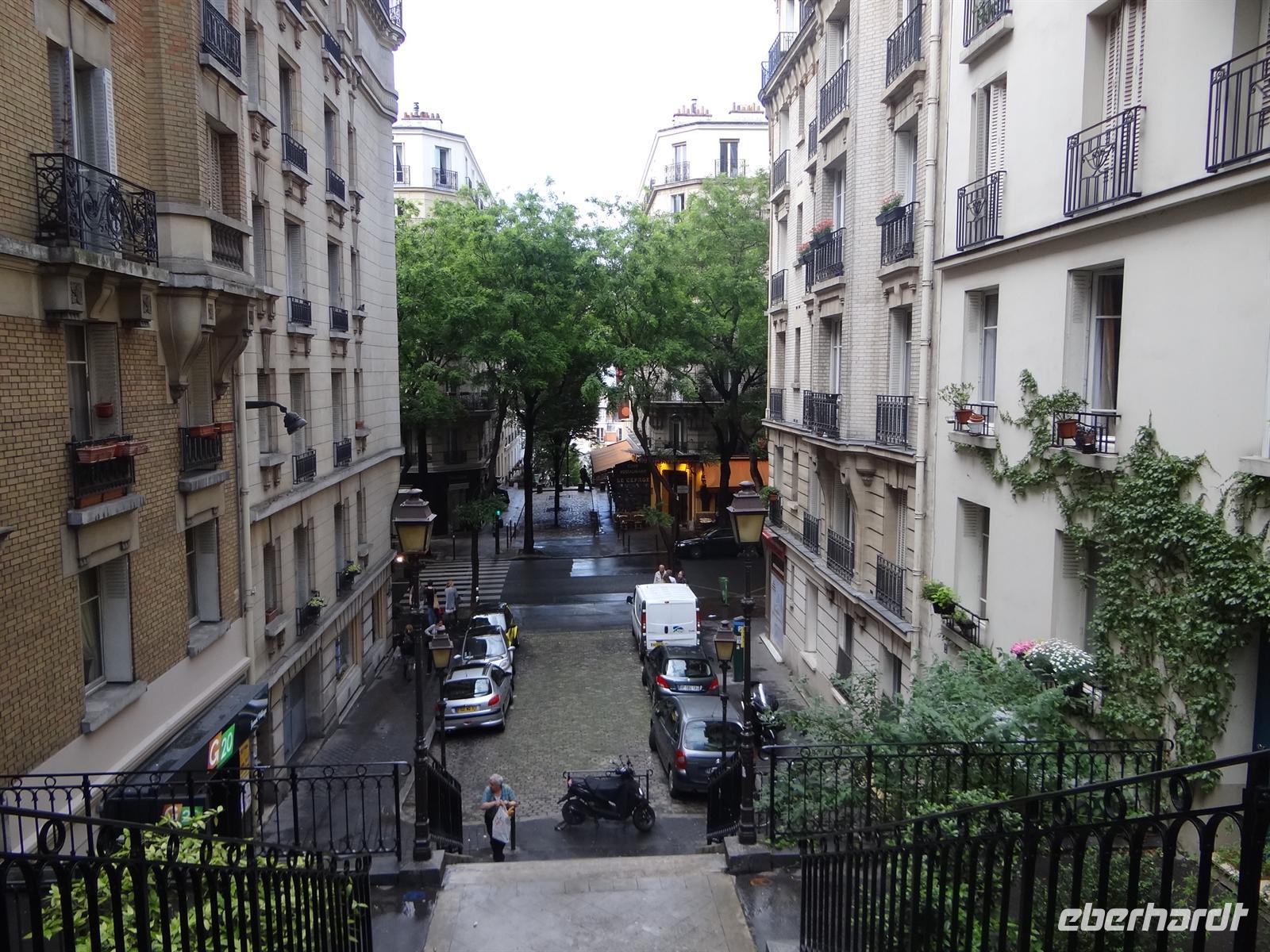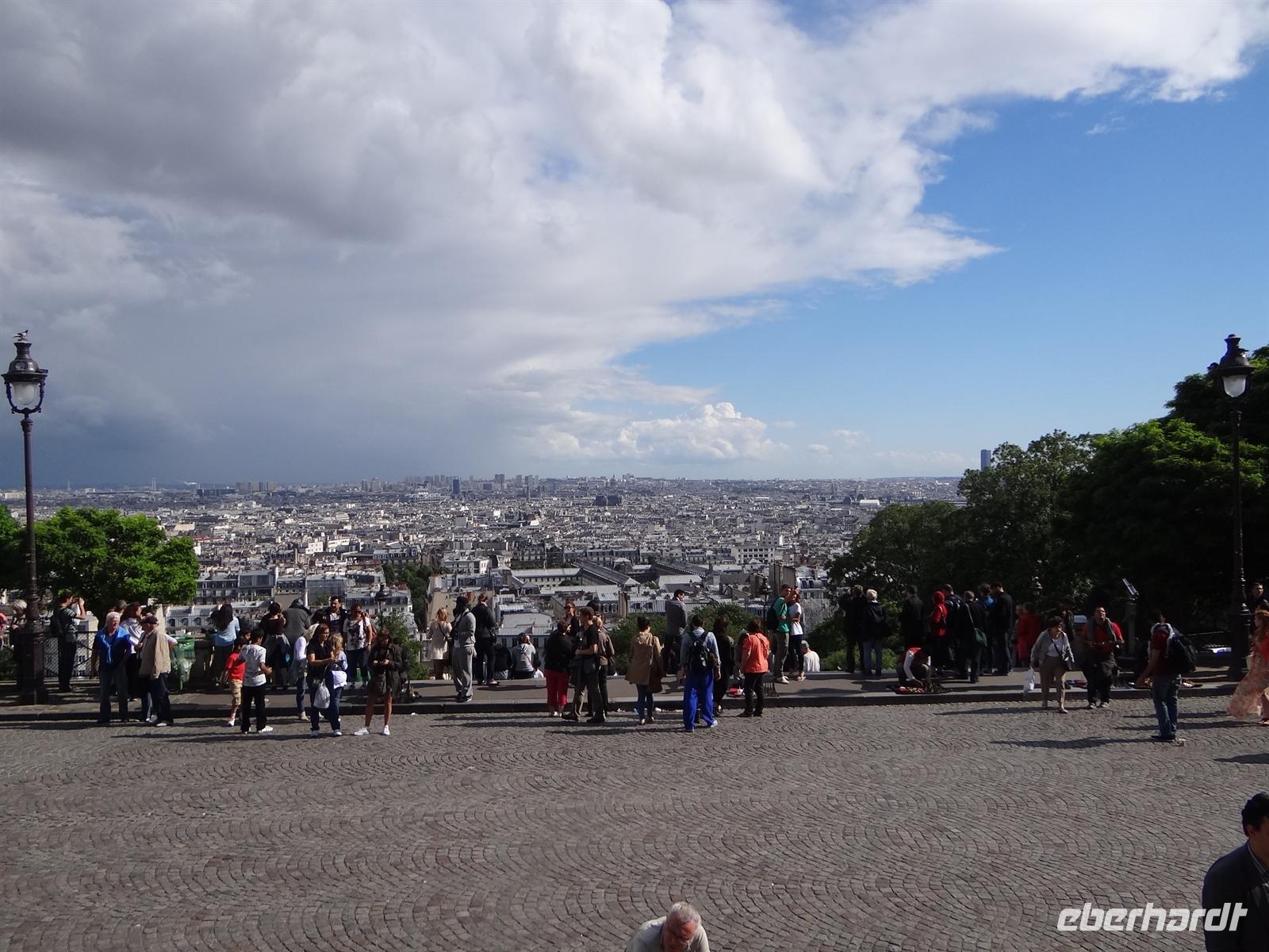 Nach der Stadtrundfahrt machten wir eine Pause in der Nähe von Pigalle und warten ängstlich, dass der Regen aufhört. Wie durch Zauberei klärt sich der Himmel und plötzlich kommt die Sonne heraus. Wir fangen unsere Besichtigung und unseren Bummel durch die Gassen von Montmartre an. Montmartre ist zauberhaft und der Sacré Coeur ist definitiv der Höhepunkt von diesem Besuch. Die Farben wechseln sich sehr schnell zwischen hellem Himmel und dunkleren Wolken über die beeindruckende Sicht auf Paris. Wir laufen runter zum Restaurant, wo wir den Flair vom Montmartre Viertel weiter genießen können.