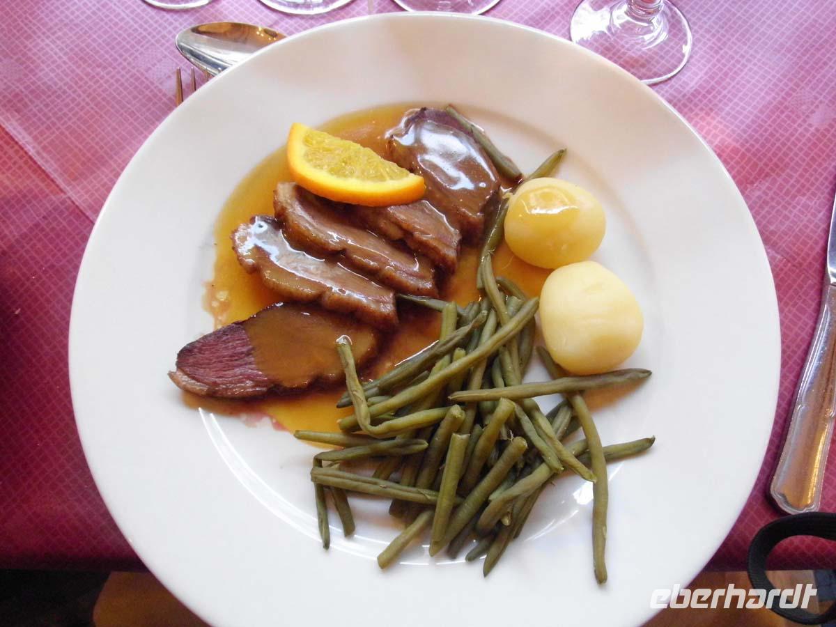 Nach dieser Mittagspause begeben wir uns auf einen Bummel über den Märtyrerberg, von welchem aus der hl. Dionysus noch 6 km geköpft in Richtung St. Denis gelaufen sein soll. Ja, seine Missionsversuche, die Kelten zum Christentum zu bekehren sind gehörig schief gegangen. Dafür steht nun auf dem Berg die wundervolle Kirche Sacre Coer, in die wir nach dem Rundgang natürlich auch hinein gehen. Danach ist noch etwas Freizeit in diesem wahlich liebvollen Viertel. Es ist halbwegs ruhig hier oben, sodass auch die vielen Touristen nicht stören. Hauptsache der Verkehr ist nicht so stark. Aktionskünster buhlen um die Gunst der Passanten und Künster wollen Porträts von uns zeichnen. Dazu locken in den Auslagen die süssen Macarons. Eine Gebäckspezialität, nach deren Verzehr man den Kalorienbedarf für einen ganzen Tag abgedeckt hat. Wir beschließen den Tag im Traditionsrestaurant La Relais Montmartre zwischen alten Musikautomaten und Grammophonen bei Gemüseterrine, Entenbrust mit Orangensosse und Mousse aux Chocolat.