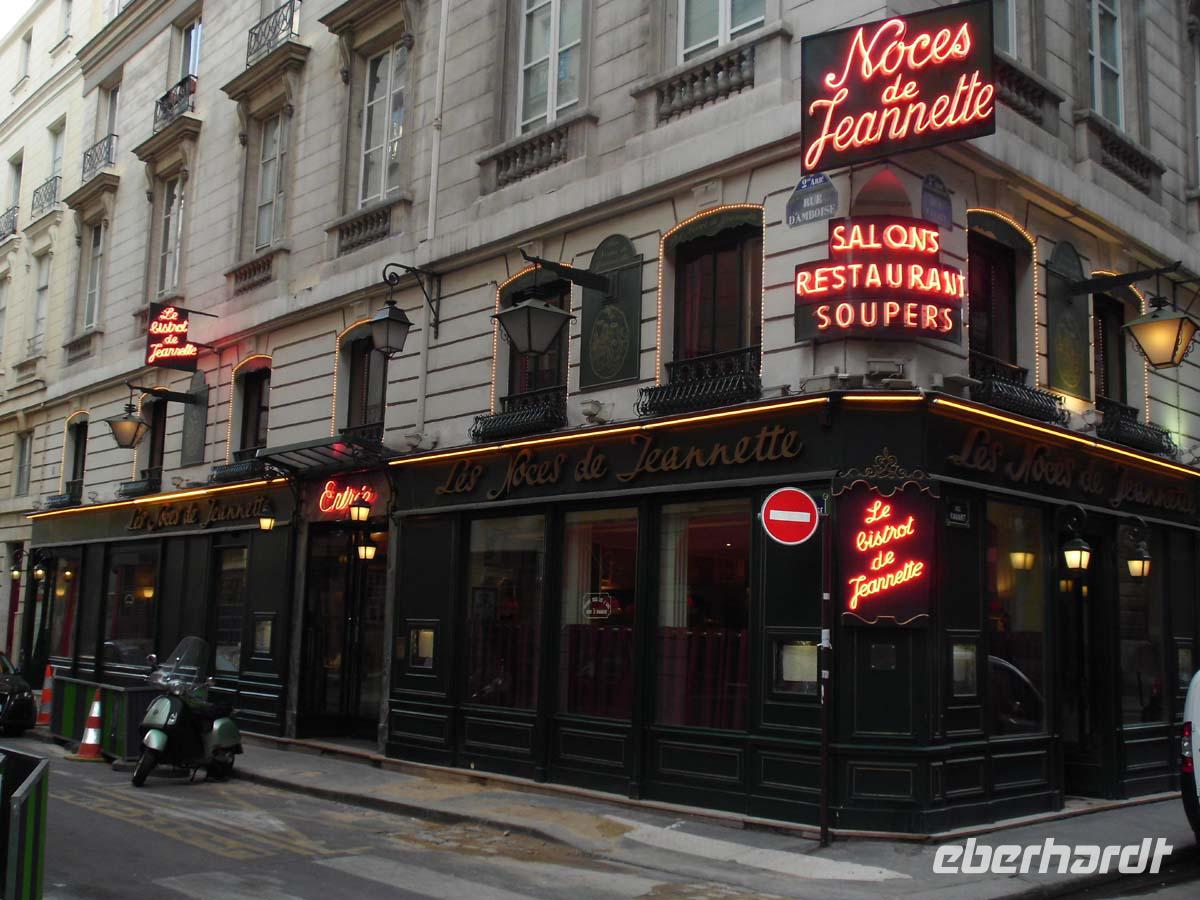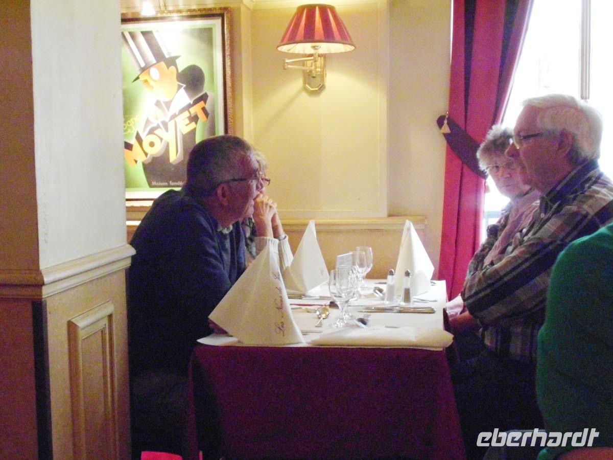Unser Abendessen nehmen wir heute im Restaurant Les Noces de Jeannette ein, im gemütlichem Ambiente der vorletzten Jahrundertwende. Neben Quiche Lorraine, Schweinelendchen und Kuchen hat es uns allen auch der gut mundende Hauswein angetan und die Stimmung wird immer fröhlicher. Danach begeben wir uns zum Eiffelturm und schaffen es diesmal tatsächlich, ihn mit dem Fahrstuhl auf die 2. Ebene zu erklimmen. Hier ist die Aussicht im Grunde schon sehr gut, doch etliche Gäste investieren nochmal 6 Euro und nehmen den Lift bis ganz nach oben in knapp 300 m Höhe. Schön, dass es doch noch geklappt hat, meinen alle, als wir uns wieder mit der Metro auf den Rückweg zum Hotel machen.