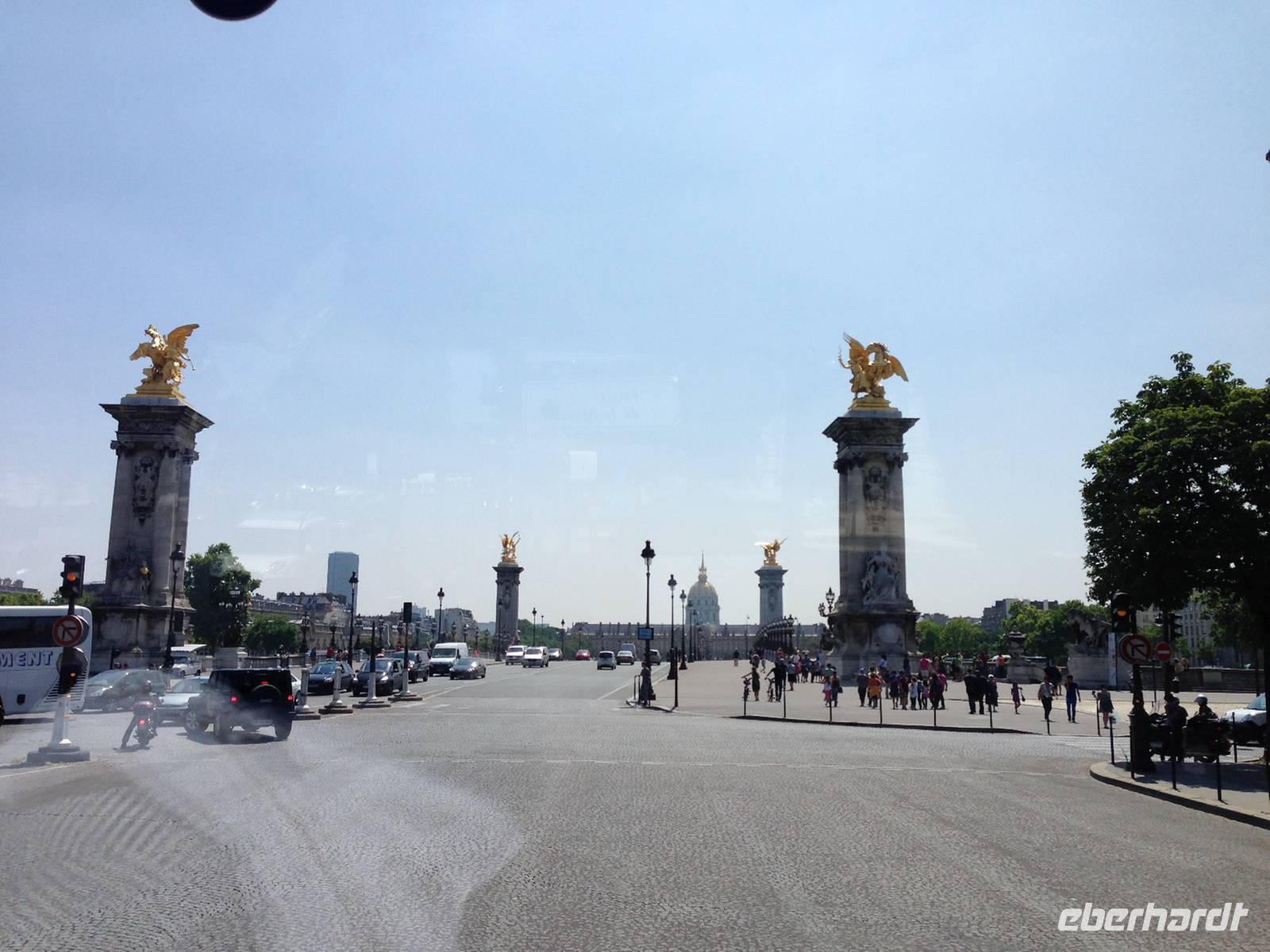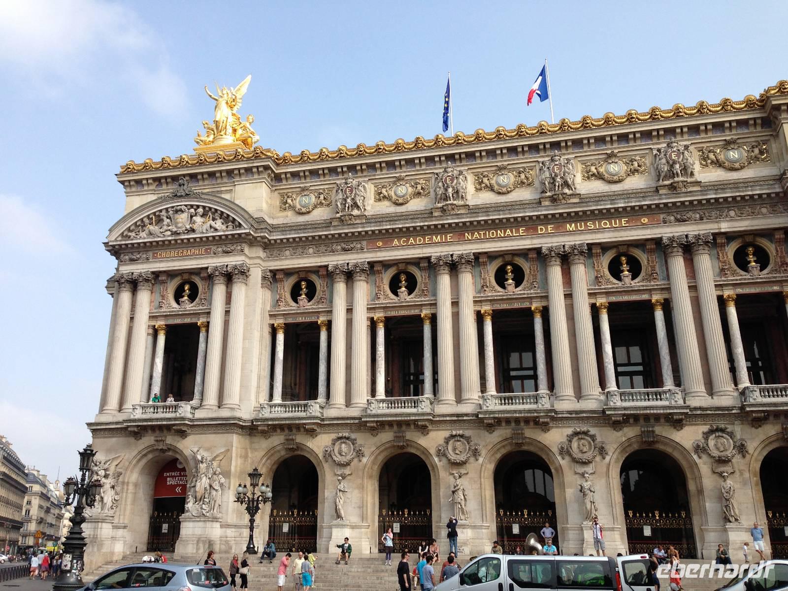 Die Stadtrundfahrt führt uns nun an weiteren Monumenten vorbei: Invalidendom mit seiner goldenen Kuppel über dem Grab von Napoleon I; Palais Bourbon, Sitz der französischen Nationalversammlung; Place de la Concorde mit dem Blick entlang wichtiger Achsen: Champs Elysées und Tuileriengärten; die Kirche Sainte Madeleine, welche an einen griechischen Tempel erinnert und schließlich umrunden wir die neobarrocke Opéra Garnier, ernannt nach ihrem Architekten, heute die "Alte Oper" genannt.