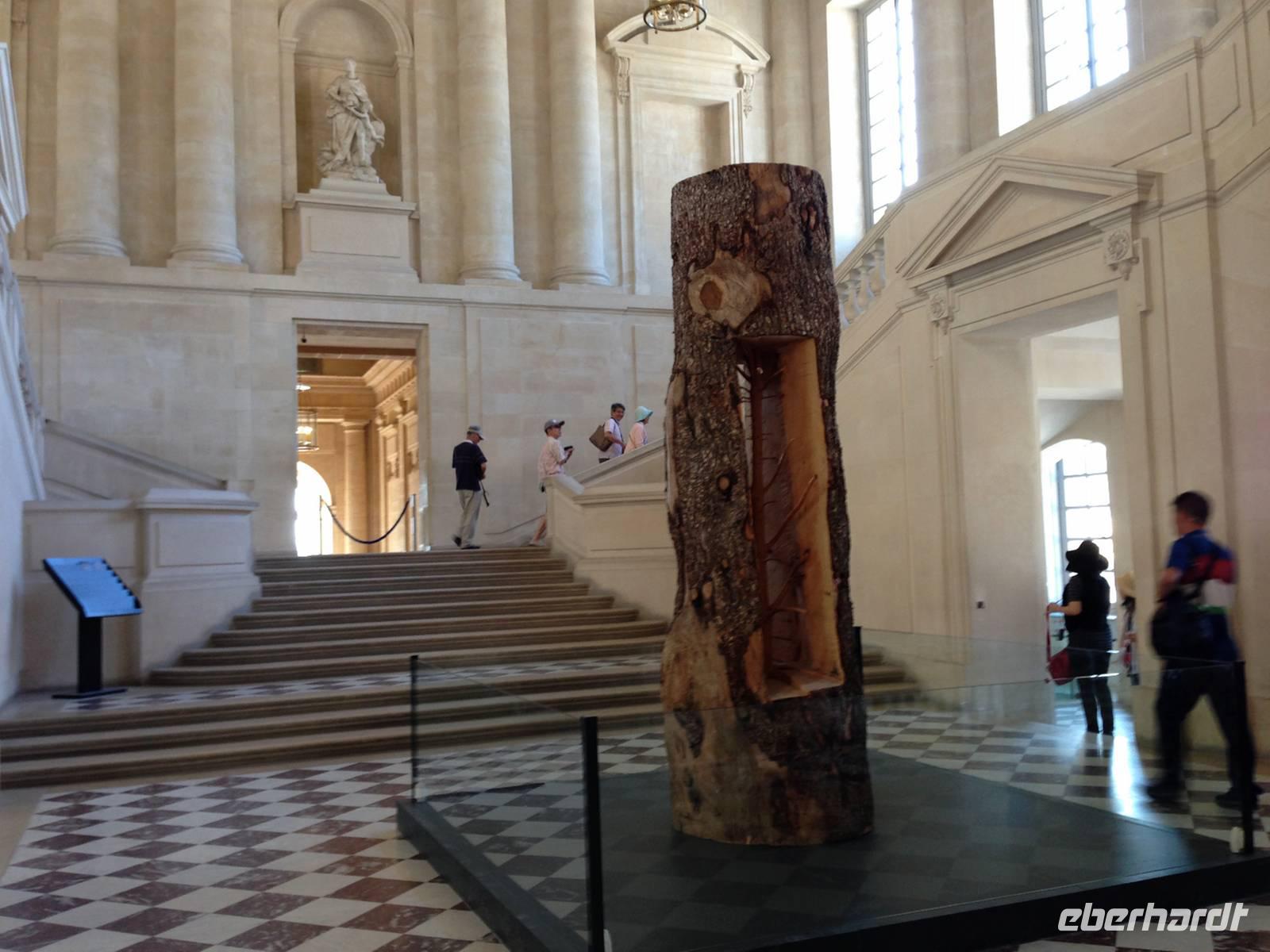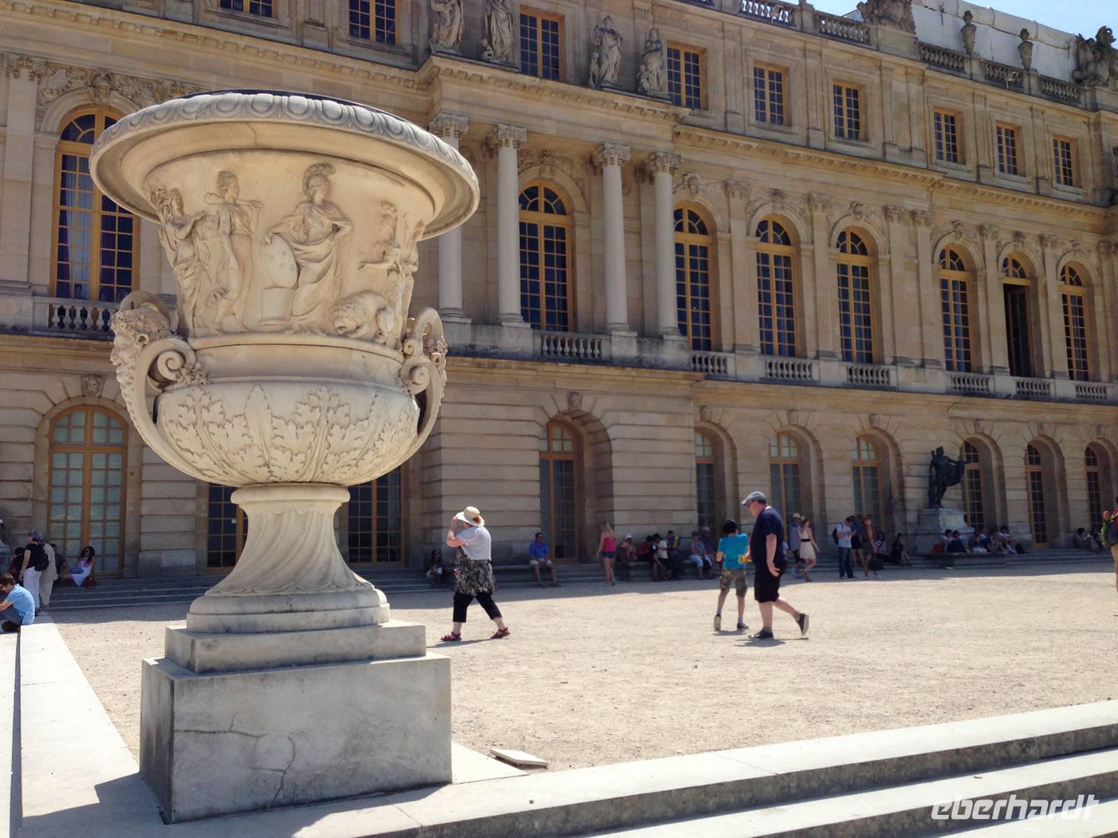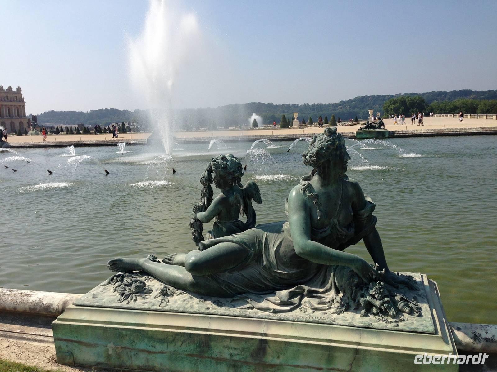 Im Anschluss tun wir es dem Sonnenkönig gleich und verlassen Paris: Versailles steht heute auf dem Programm. Obwohl wir vor der offiziellen Öffnungszeit da sind, sind bereits einige Touristen aus aller Welt auf dem großen Vorplatz. Wir stellen uns in die (noch sehr kurze) Schlange und kommen recht zügig ins Gebäude und zu den Audioguides, welche uns durch die Gemächer des Königs, wo das öffentliche Ankleiden stattfand, den weltberühmten Spiegelsaal und durch die 120 Meter lange Schlachtengalerie leiten. Anschließend erwarten uns im Park die großen Wasserspiele mit Barrock-Musik, welche im Sommer an speziellen Tagen stattfinden. Wir haben Glück, sie beginnen um elf Uhr - exakt zum richtigen Zeitpunkt für uns. Mit der Barockmusik und den hohen Fontainen in den wunderschönen Bassins kommt eine ganz besonders festliche Atmosphäre in dem von André le Nôtre geschaffenen Meisterstück der französischen Gartenkunst auf.