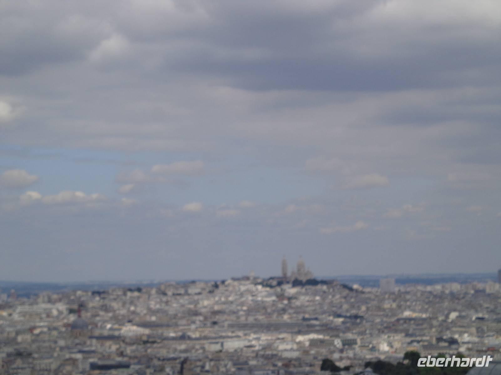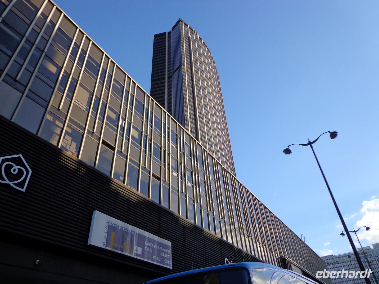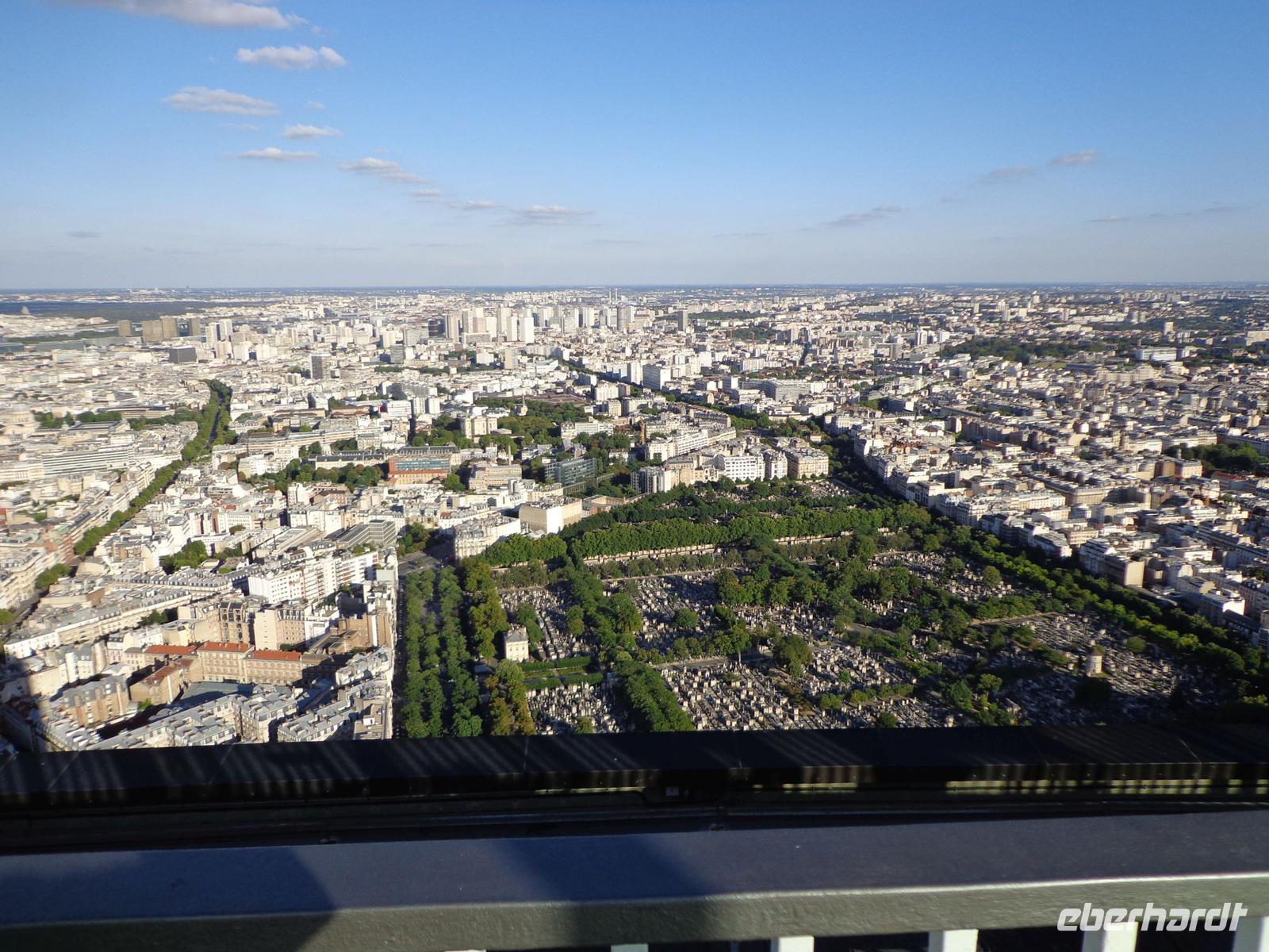 Der letzte Besuch an diesem Tag galt den Tour Montparnasse, dem Hochhaus von Montparnasse. In nicht mal einer Minute erreicht man die 54. Etage mit einem Schnellaufzug. Auf dieser Ebene befinden sich eine Snack-Bar, ein Souvenirladen und Toiletten. In Bildern und Tafeln werden historische Fotos vom Bau des Eiffelturms und dieses Hochhauses gezeigt. Weitere drei Etagen muß man zu Fuß überwinden, um auf die Freifläche in 209 m Höhe zu gelangen. Mit Ferngläsern, die mit einem Geldstück zu füttern sind, kann man in die Runde schauen. Auch Hinweisschilder weisen darauf hin, was man wo sieht. Ebenso gibt es Entfernungsangaben zu großen Städten in aller Welt.