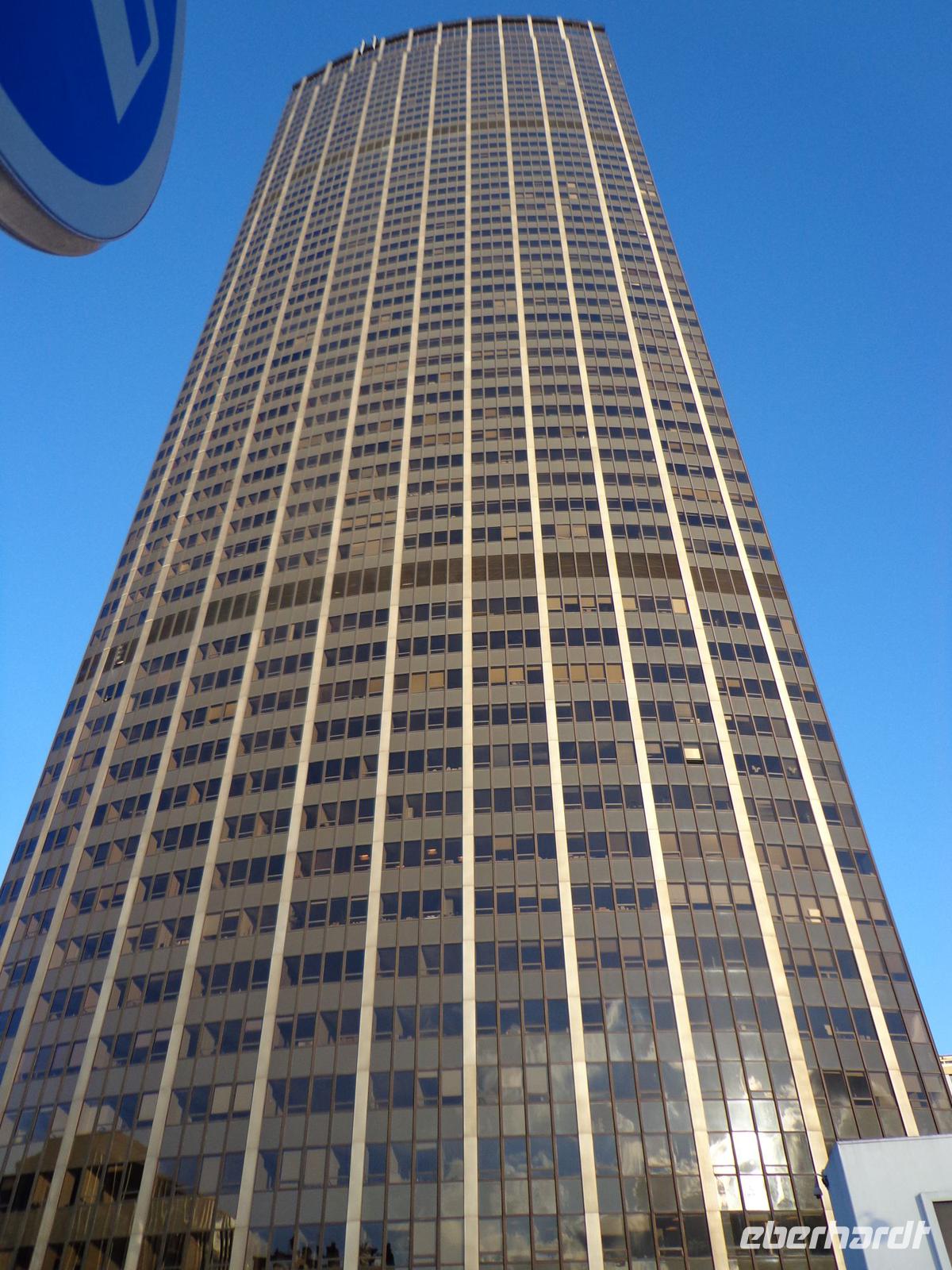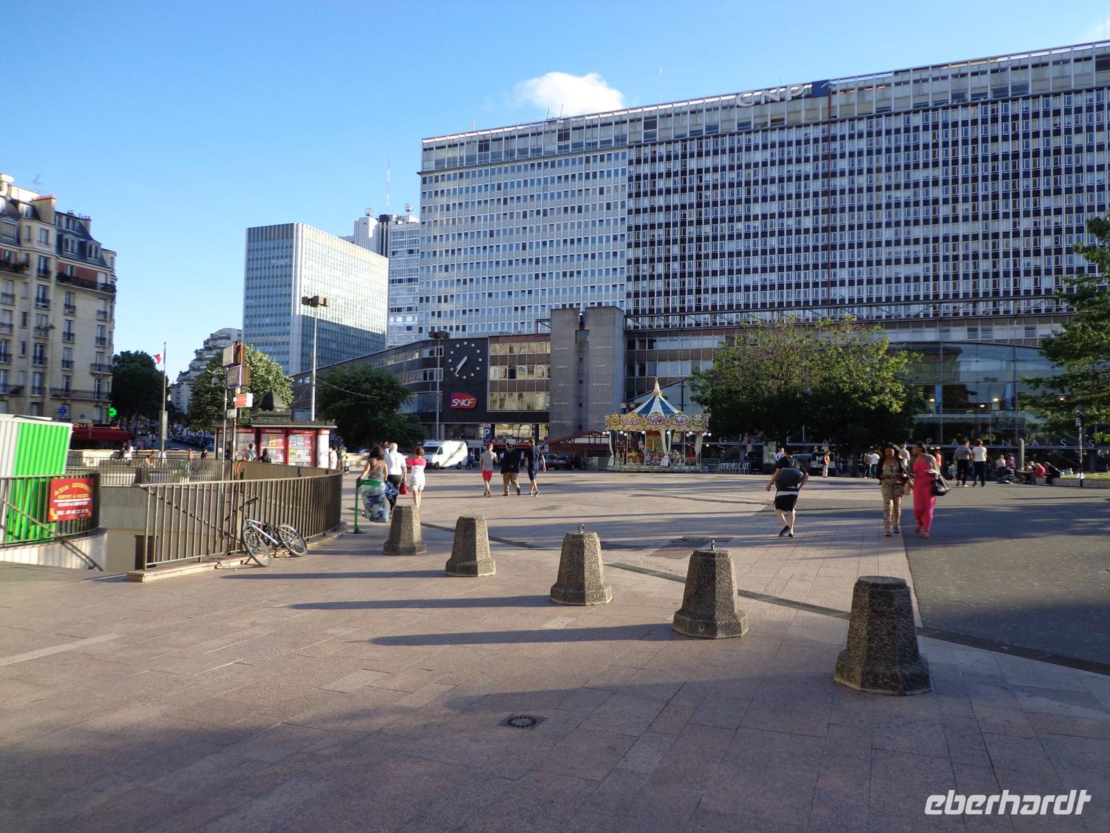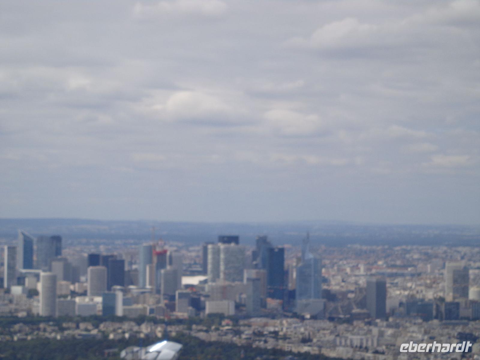 Der letzte Besuch an diesem Tag galt den Tour Montparnasse, dem Hochhaus von Montparnasse. In nicht mal einer Minute erreicht man die 54. Etage mit einem Schnellaufzug. Auf dieser Ebene befinden sich eine Snack-Bar, ein Souvenirladen und Toiletten. In Bildern und Tafeln werden historische Fotos vom Bau des Eiffelturms und dieses Hochhauses gezeigt. Weitere drei Etagen muß man zu Fuß überwinden, um auf die Freifläche in 209 m Höhe zu gelangen. Mit Ferngläsern, die mit einem Geldstück zu füttern sind, kann man in die Runde schauen. Auch Hinweisschilder weisen darauf hin, was man wo sieht. Ebenso gibt es Entfernungsangaben zu großen Städten in aller Welt.