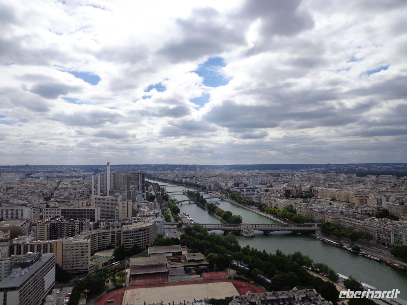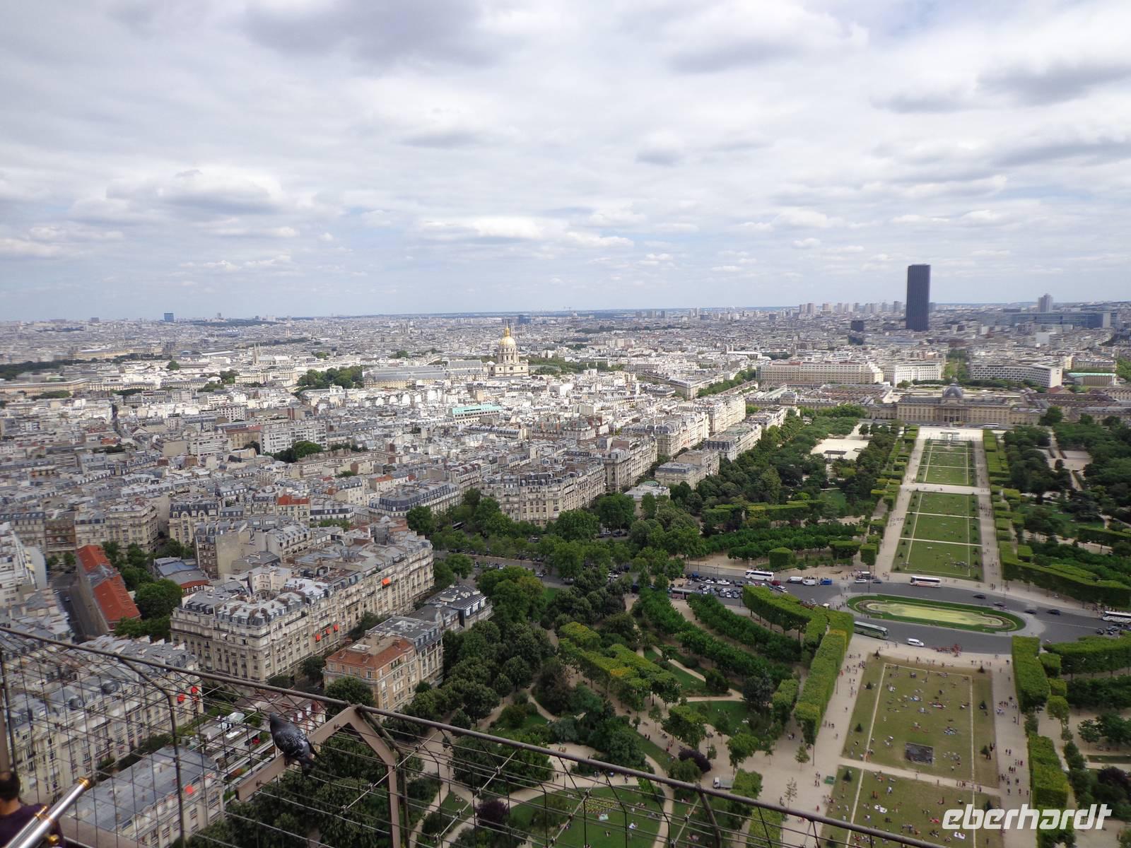 Nach der Mittagspause fuhren wir zum Eiffelturm, wo unsere Gruppe angemeldet war. Trotz großen Andrangs waren wir sehr schnell mit dem Aufzug auf der zweiten Plattform. Die Wartezeit um ganz nach oben befördert zu werden, dauerte etwas länger. Dafür bot sich uns dann bei strahlendem Sonnenschein ein eindrucksvoller Blick über die ganze Stadt. So sah man sehr gut die durchgehende Achse vom modernen Viertel „La Defense" über den Arc de Triomphe, den Champs Elysees, den Place de la Concorde bis hin zum Louvre. Auch die Kathedrale Notre Dame und der Luxemburggarten waren sehr gut zu sehen. Zweifellos war das für jeden unserer Gäste ein Höhepunkt der Reise, an den man sich noch lange erinnern wird.