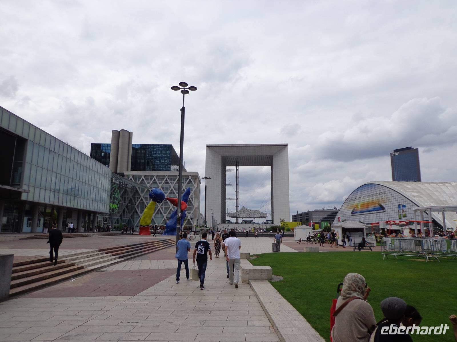Nach einer Mittagspause beim Jardin de Luxemburg unternahmen wir eine zweite Stadtrundfahrt, die uns u.a. in das moderne Paris, dem Viertel La Defense brachte. Futuristisch gestaltete Bürohochhäuser aus Glas und Beton bestimmen hier das Bild. Auch ein großes Einkaufszentrum, Kinos, Restaurants und Wohnhäuser stehen hier. Das Gebiet ist angeschlossen an das Netz der Metro, der S-Bahn und des Stadtbusverkehrs. Insgesamt stehen 25.000 Parkplätze zur Verfügung. Das Herz dieses Viertels bildet die „Grande Arche" des dänischen Architekten Otto Spreckelsen. In dieses riesige Quadrat würde die Kathedrale Notre Dame spielend hinein passen.