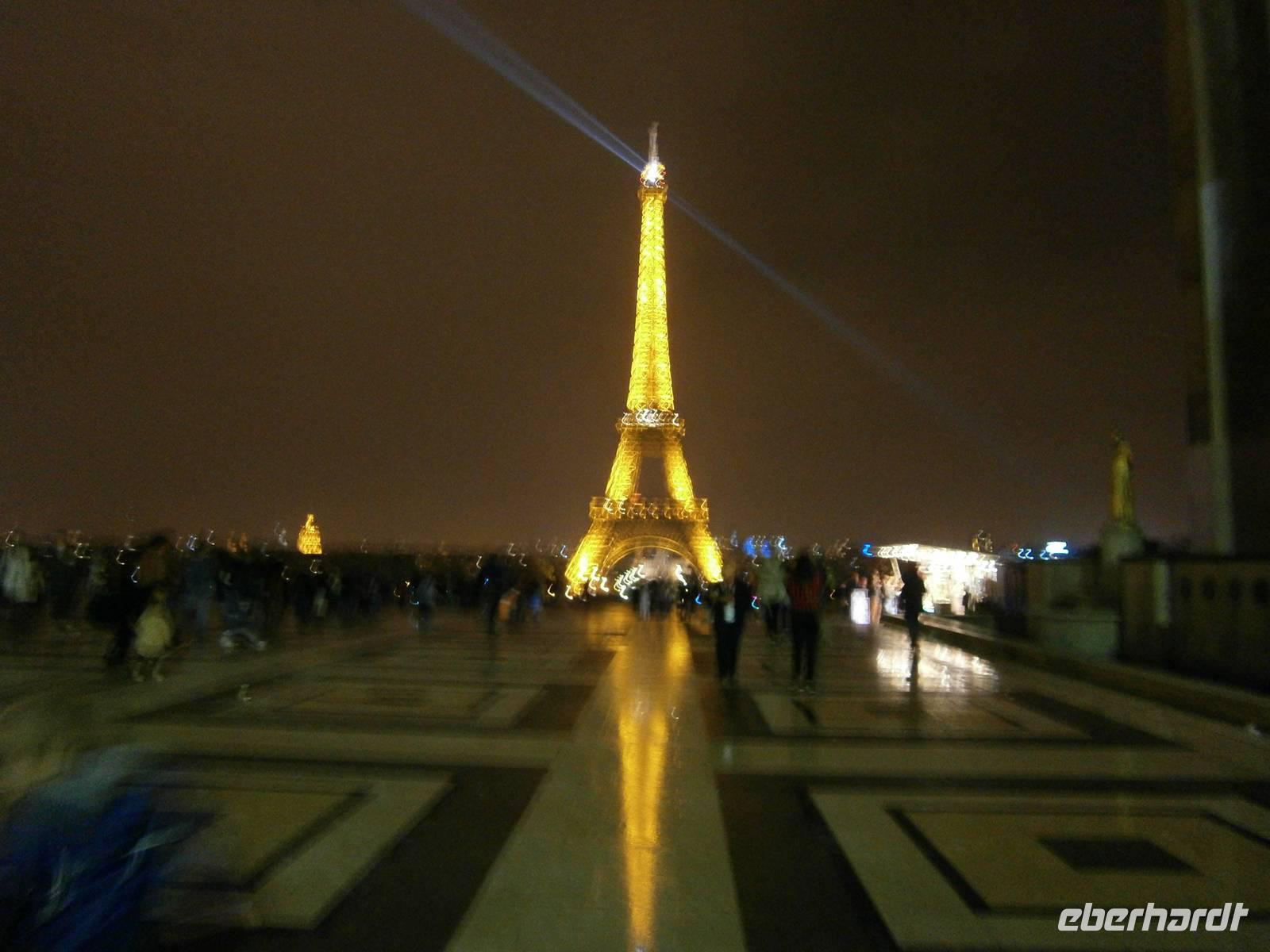 Anschließend geht's noch mal zum Jacques-Turm, wo wir uns nun schon auskennen. Hier lässt sich am günstigsten ein Abendessen finden, und Michael begleitet uns von hier zu unserer fakultativen Lichterfahrt durch das illuminierte Paris. Wir enden an der Bootsanlegestelle an der Seine, unterhalb vom Eiffelturm, und bedanken uns herzlich bei Michael Schramm für die tollen sehr informativen Stadtführungen. Mit dem Schiff fahren wir auf der Seine, vorbei am Louvre, bis weit hinter Notre Dame, und beim Eintreffen am Hafen können wir sogar den Eiffelturms blinkern sehen. Genial! Wir gehen nur wenige Meter zum Turm, denn wir haben Tickets für die Auffahrt 22.00 Uhr. Leider ist das Wetter sehr ungemütlich geworden, es regnet und stürmt. Es gibt nur einen kleinen Kiosk zum Unterstellen, und das Personal für den Aufzug ist erst nicht bereit, uns eine frühere Auffahrt zu ermöglichen. Aber dann lässt man sich doch erweichen, denn es sind bei dem Wetter keine Privatbesucher da. Es ist wohl einmalig, dass man ohne jegliche Wartezeit auf den Turm fahren kann. Wir sind fast allein, sonst kann man manchmal vor Menschen kaum die Aussicht genießen! Wir sind begeistert, von dem Blick über das nächtliche Paris - auch wenn es stürmt und regnet! Da unser Busfahrer seine Fahrzeiten einhalten muss, erwartet uns ein französischer Bus und bringt uns sicher zum Hotel. Wir sind froh, dass er schon eher dasteht, denn es ist sehr ungemütlich geworden!