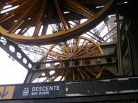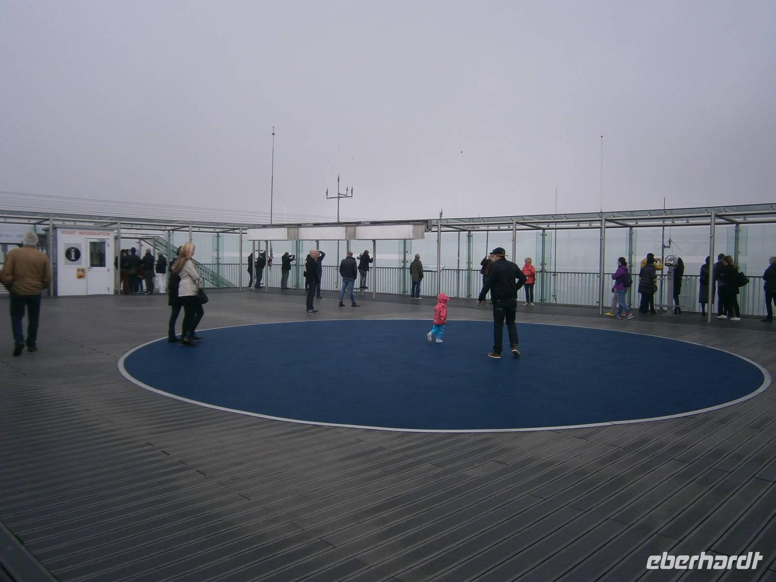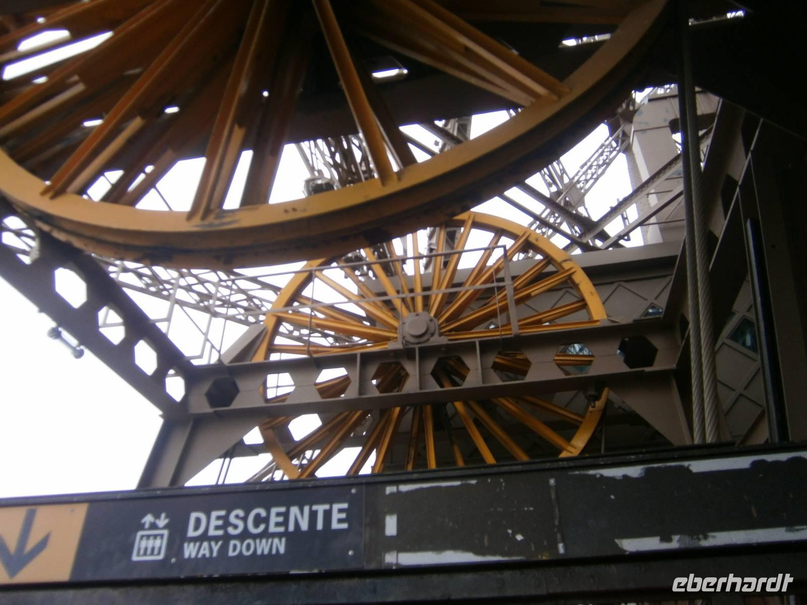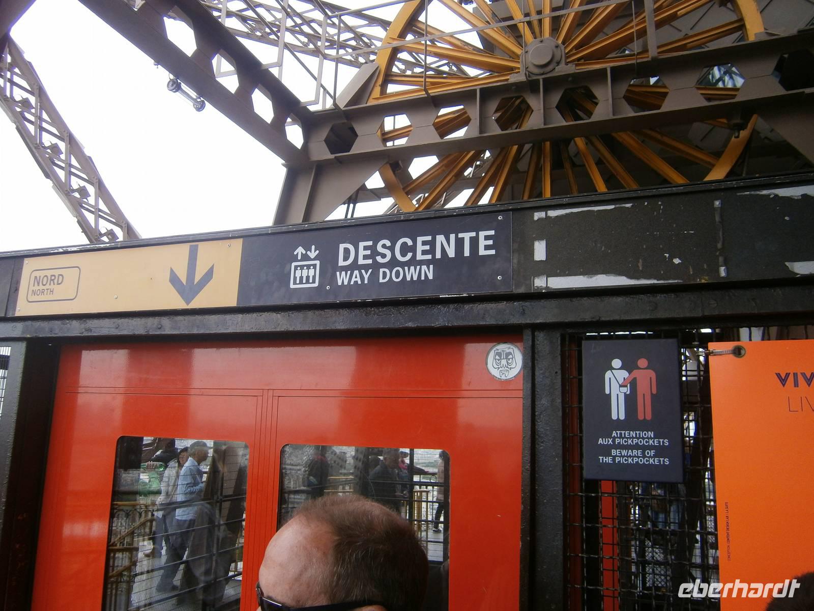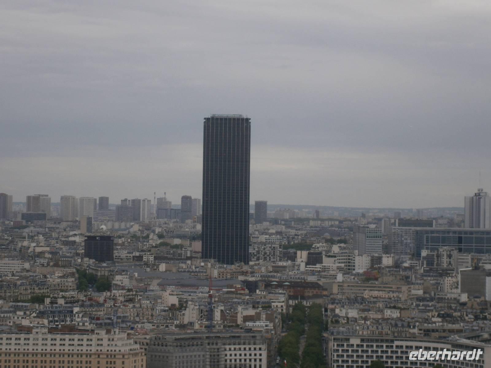 Der Bus brachte uns dann in das Viertel von Montparnasse, wo wir den Tour Montparnasse, dem Hochhaus von Montparnasse einen Besuch abstatteten. In 38 sek. erreicht man die 56. Etage mit einem Schnellaufzug, dem schnellsten Europas. Auf dieser Ebene befinden sich eine Snack-Bar, ein Souvenirladen und Toiletten. In Bildern und Tafeln werden historische Fotos vom Bau des Eiffelturms und dieses Hochhauses gezeigt. Weitere drei Etagen muß man zu Fuß überwinden, um auf die Freifläche in 209 m Höhe zu gelangen. Mit Ferngläsern, die mit einem Geldstück zu füttern sind, kann man in die Runde schauen. Auch Hinweisschilder weisen darauf hin, was man wo sieht. Ebenso gibt es Entfernungsangaben zu großen Städten in aller Welt.