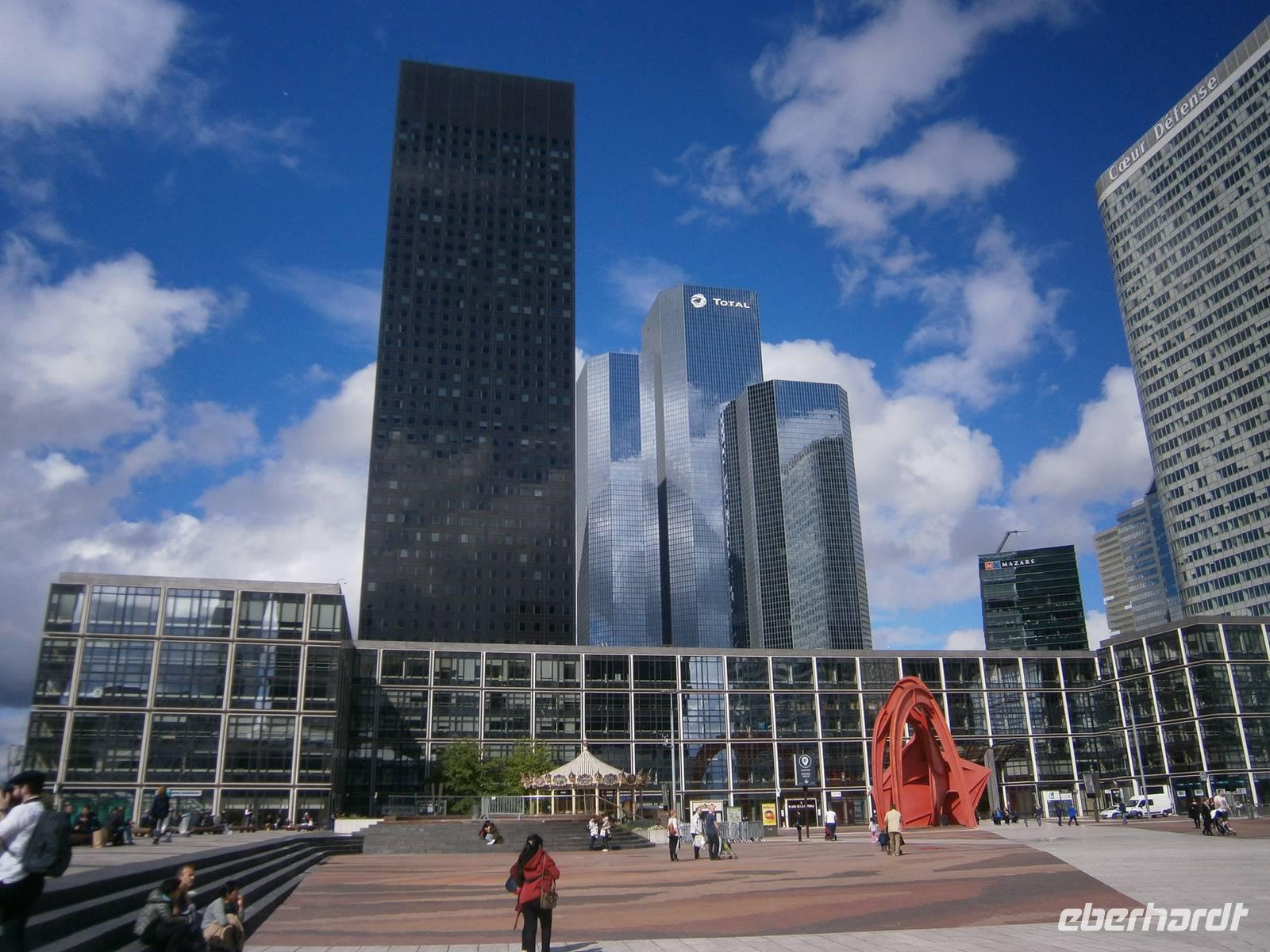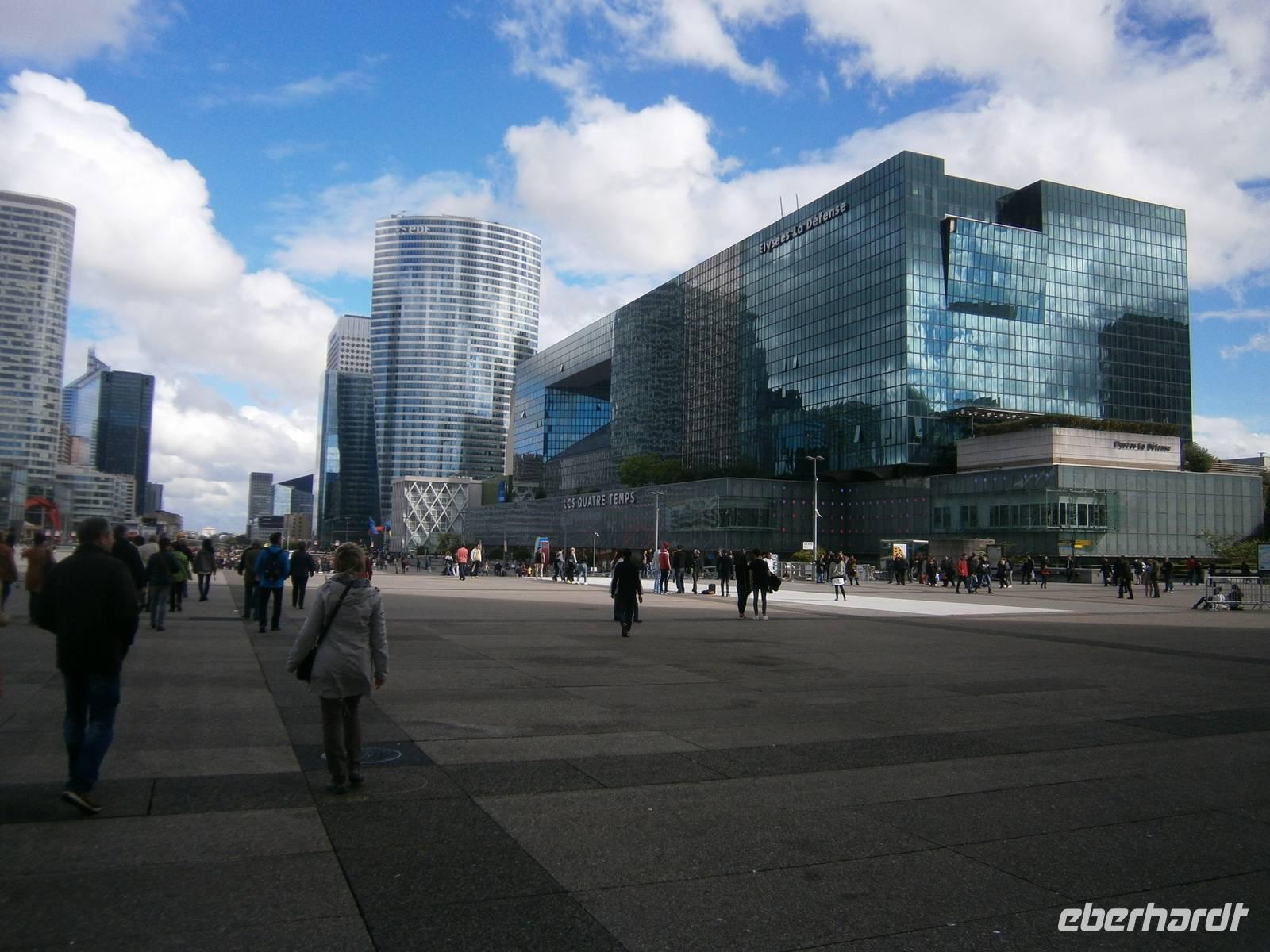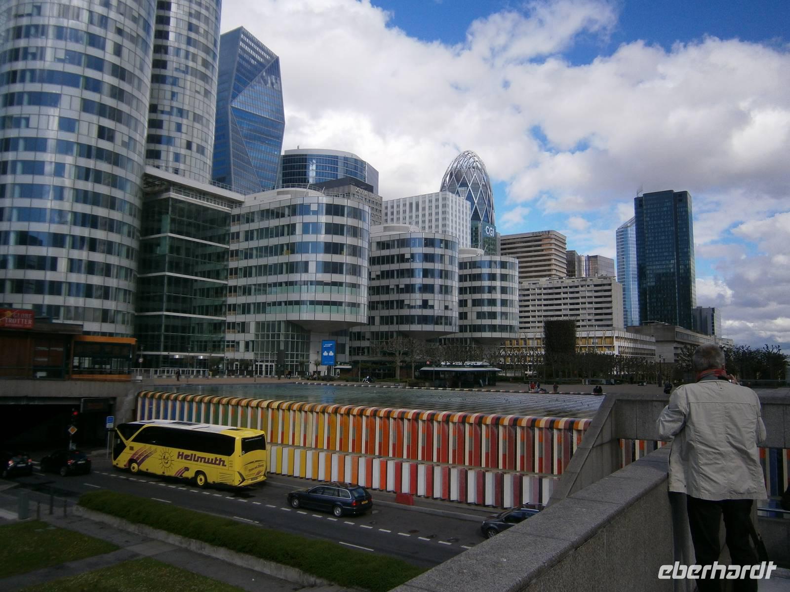 Im Anschluß unternahmen wir eine zweite Stadtrundfahrt, die uns in das moderne Paris, dem Viertel La Defense, brachte. Futuristisch gestaltete Bürohochhäuser aus Glas und Beton bestimmen hier das Bild, ebenso auch viele Baukräne. Ein großes Einkaufszentrum, Kinos, Restaurants und Wohnhäuser stehen hier. Das Gebiet ist angeschlossen an das Netz der Metro, der S-Bahn und des Stadtbusverkehrs. Insgesamt stehen 25.000 Parkplätze zur Verfügung. Das Herz dieses Viertels bildet die „Grande Arche" des dänischen Architekten Johann Spreckelsen. In dieses riesige Quadrat würde die Kathedrale Notre Dame spielend hinein passen.Die Mitglieder unserer Reisegruppe nutzten die Möglichkeit und filmten und fotografierten die vielen Motive, die sich ihnen hier boten.