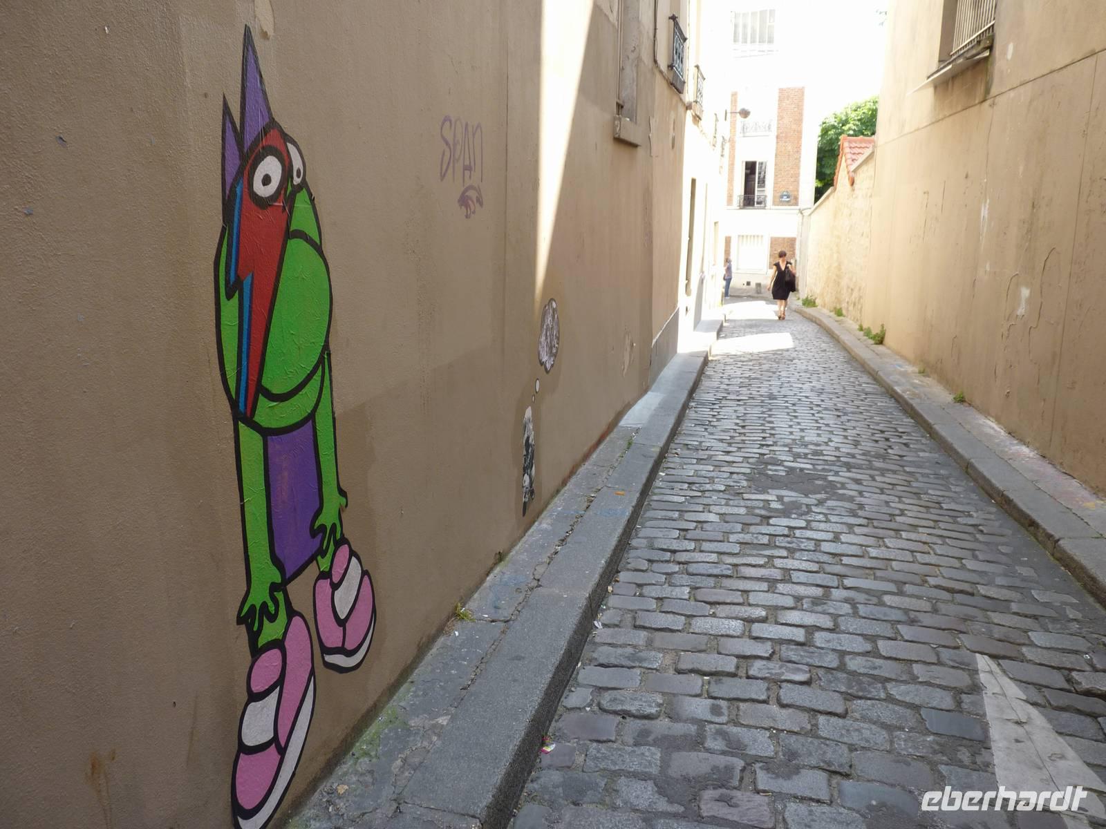 Danach ging es zum Montmartre: Über steile Straßen und enge Sträßchen vorbei an sehr betagten Häusern+ Ateliers (und sogar an einem Weinberg!), am Haus und der Bronzebüste der Sängerin Dalida, über den belebten Place du Tertre bis zur Sacré-Coeur. Hier lockt uns die riesige Kuppel zu einem Aufstieg und Rundgang entlang des außen liegenden Arkadenganges.