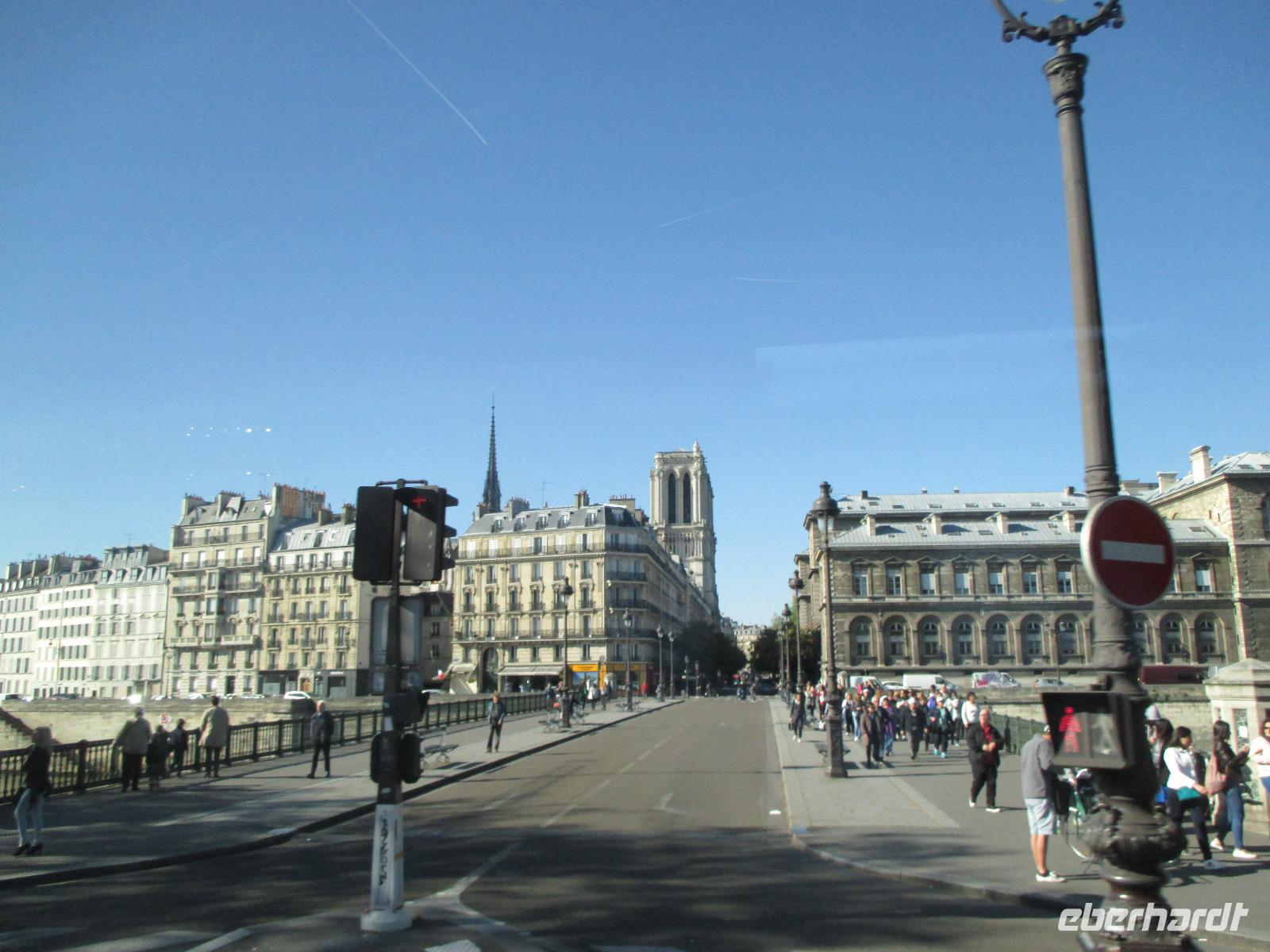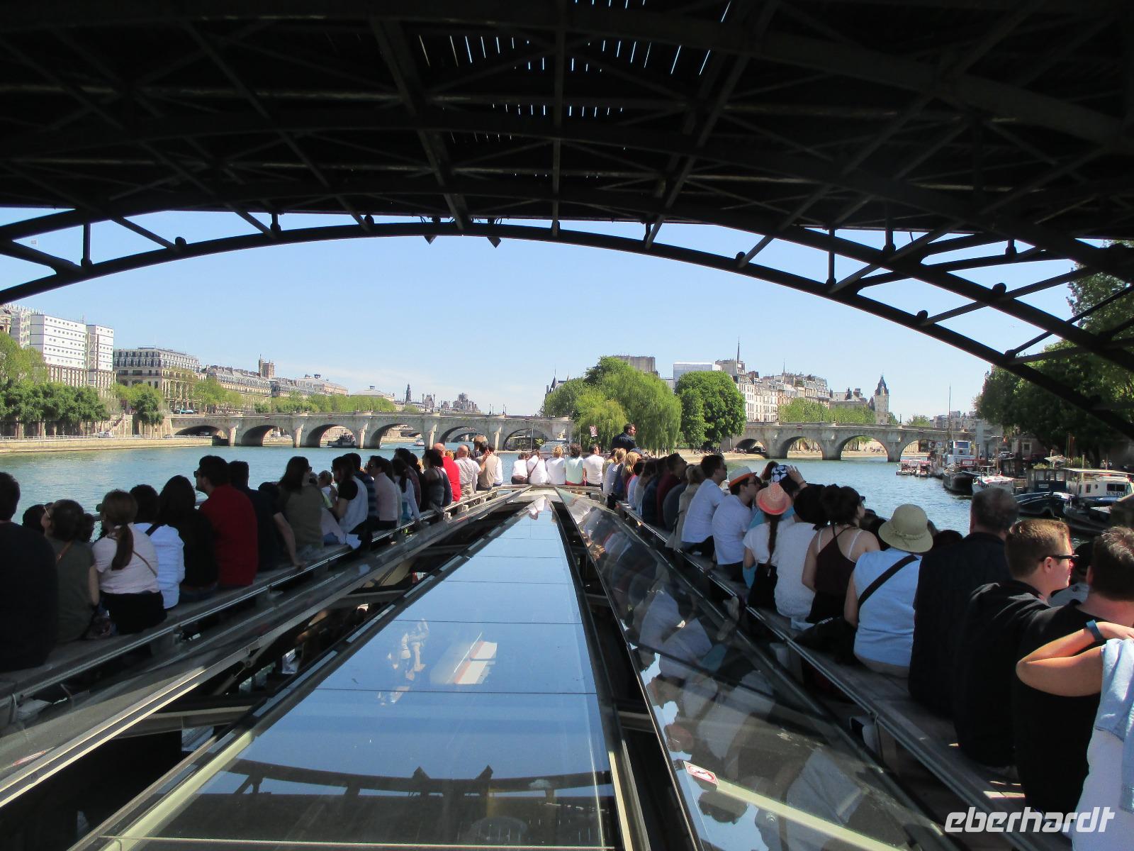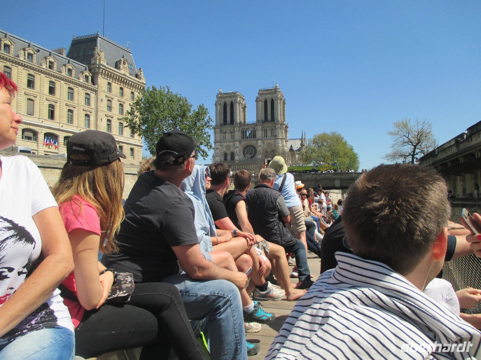 Wer möchte, bekommt im Bus Würstchen, Kaffee, Kaltgetränke und 13 Uhr fahren wir zurück nach Paris zur Bootsanlegestelle Bateaux Parisiens, unterhalb vom Eiffelturm. Mit dem Schiff fahren wir im herrlichen Sonnenschein auf der Seine nochmals durch die Stadt, vorbei an Louvre, Notre Dame ...