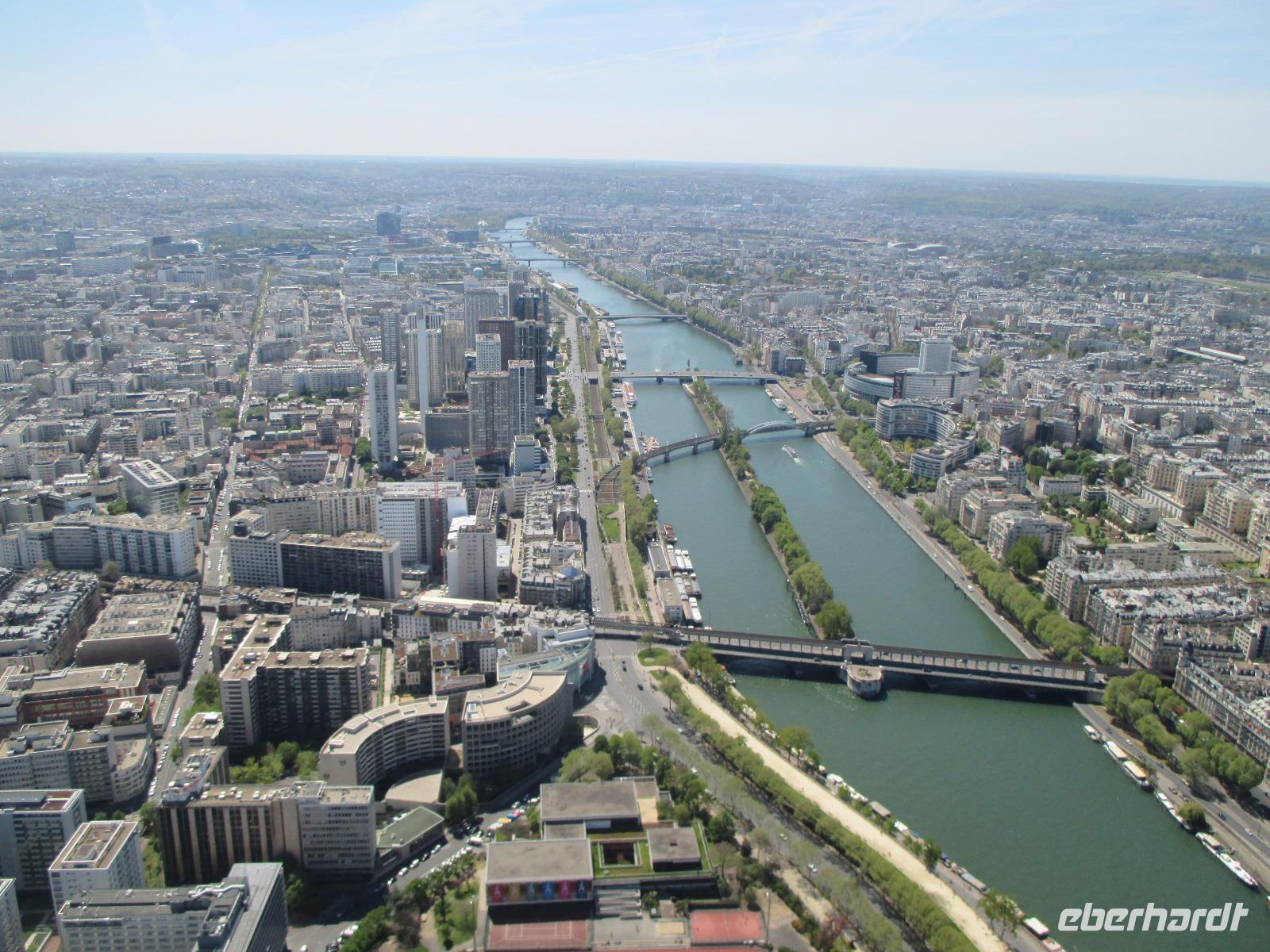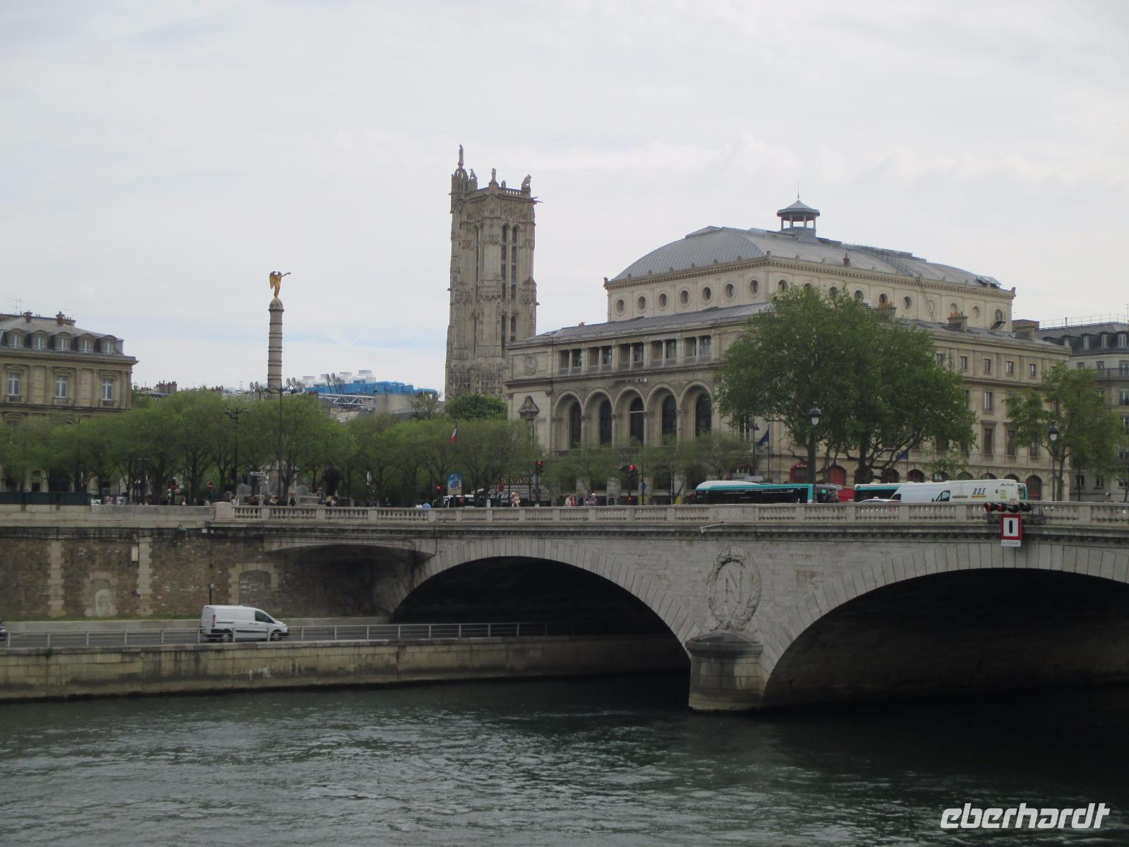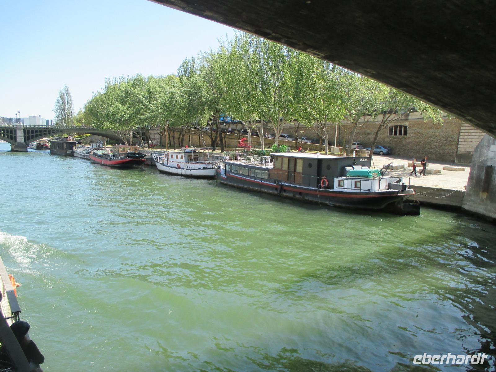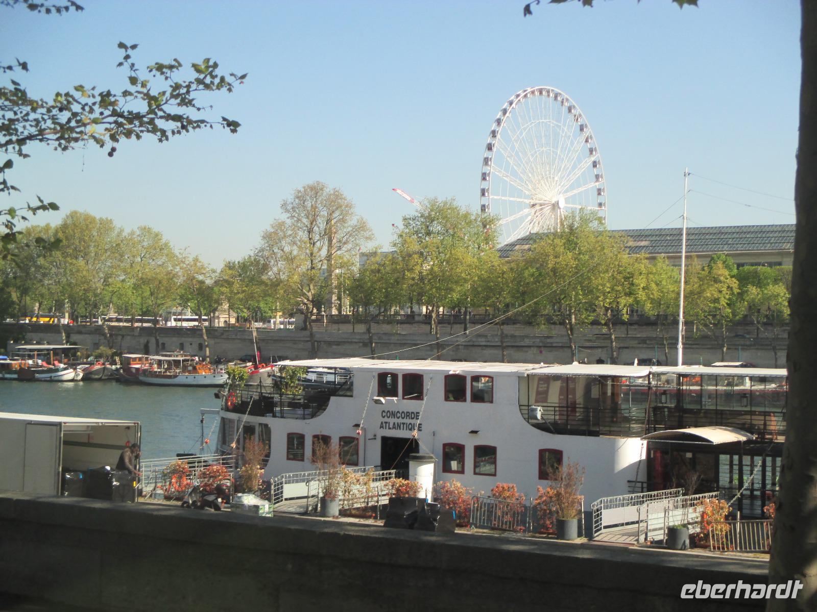 Wer möchte, bekommt im Bus Würstchen, Kaffee, Kaltgetränke und 13 Uhr fahren wir zurück nach Paris zur Bootsanlegestelle Bateaux Parisiens, unterhalb vom Eiffelturm. Mit dem Schiff fahren wir im herrlichen Sonnenschein auf der Seine nochmals durch die Stadt, vorbei an Louvre, Notre Dame ...