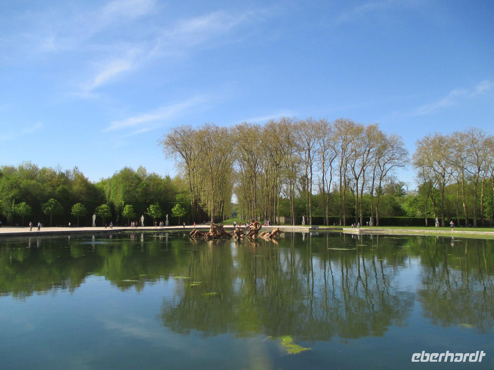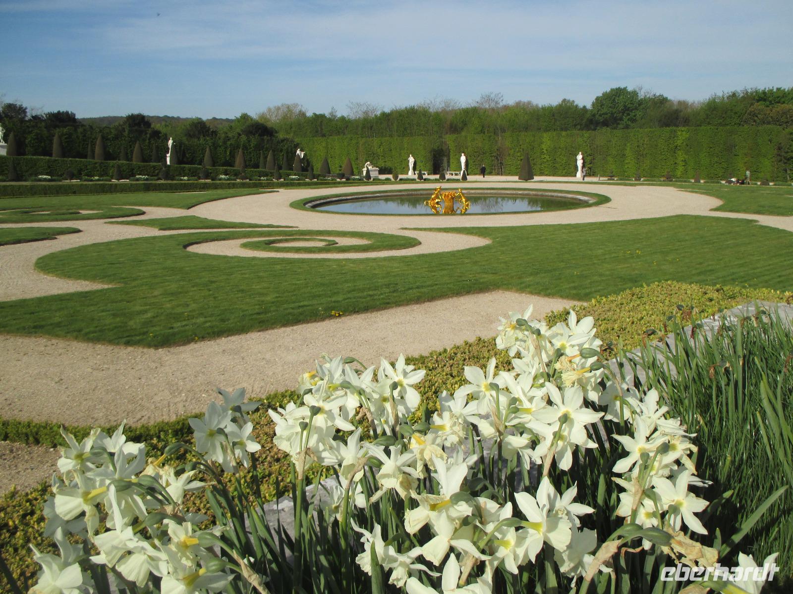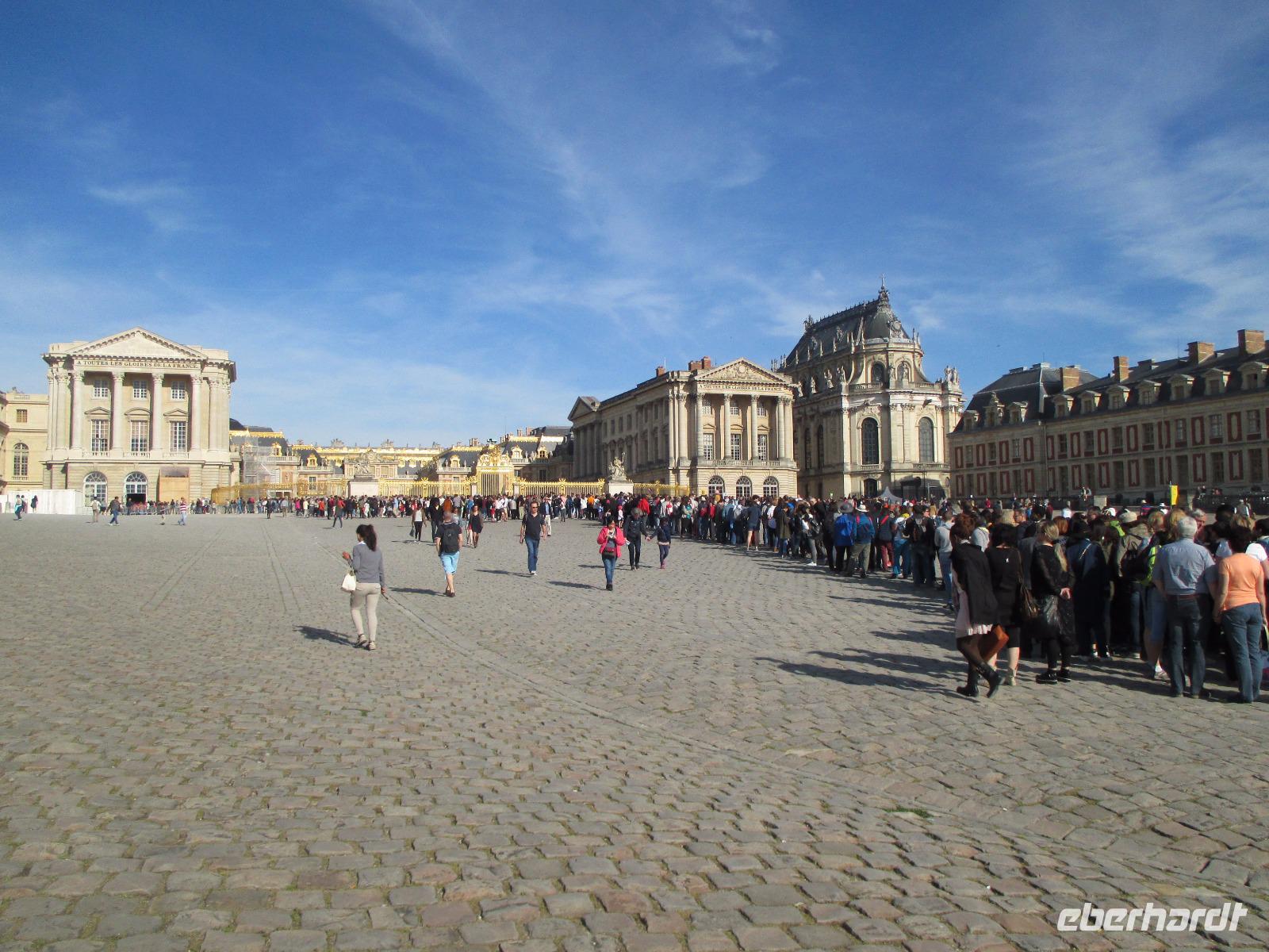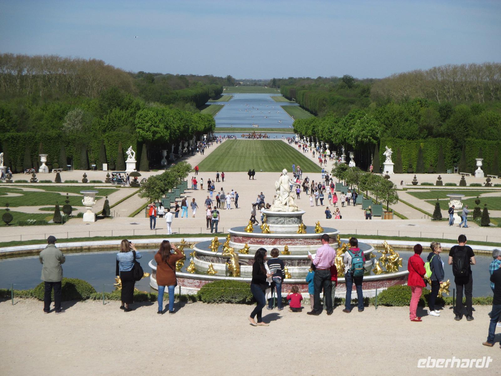 Wir sind vor neun Uhr an Schloss und die Schlange der Wartenden ist heute noch recht kurz. Tickets haben wir schon! Da wir mit die ersten Gäste sind, können wir mit unseren Audioguides die ganze Anlage noch recht entspannt bewundern. noch nicht bepflanzt und in den schönen Brunnen sprudelt das Wasser nur an den Wochenenden für eine Stunde.
