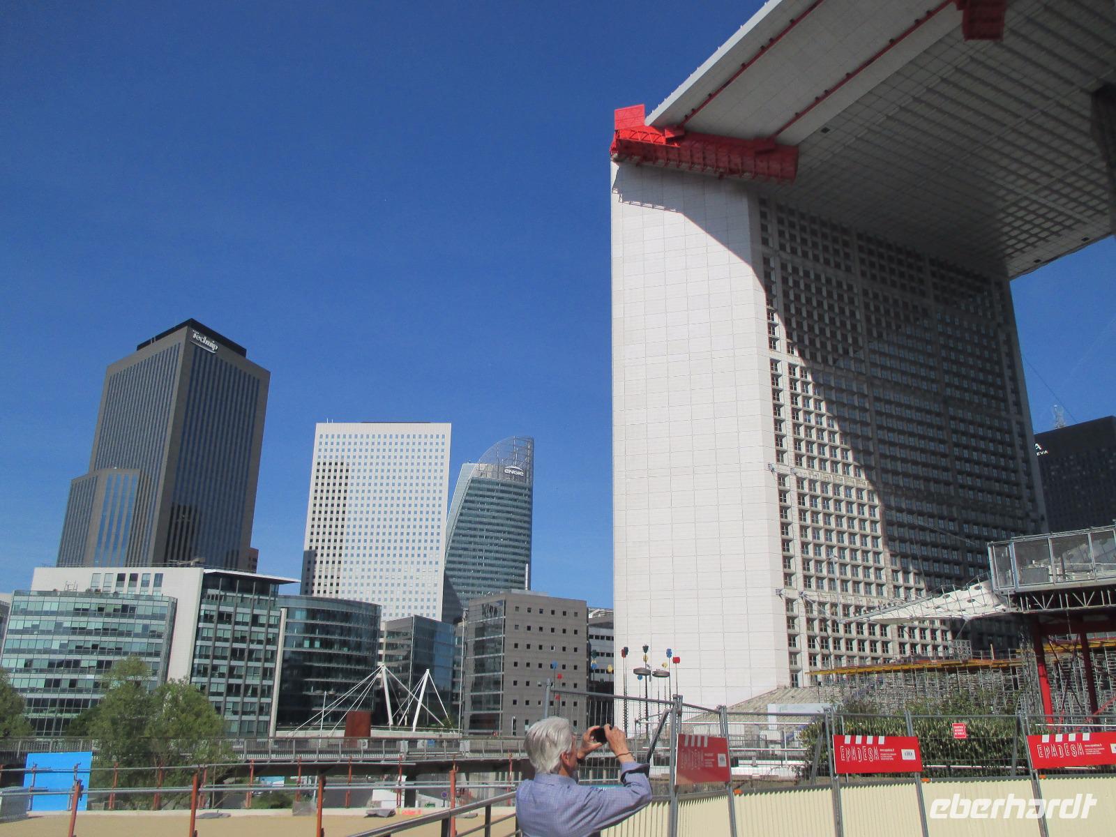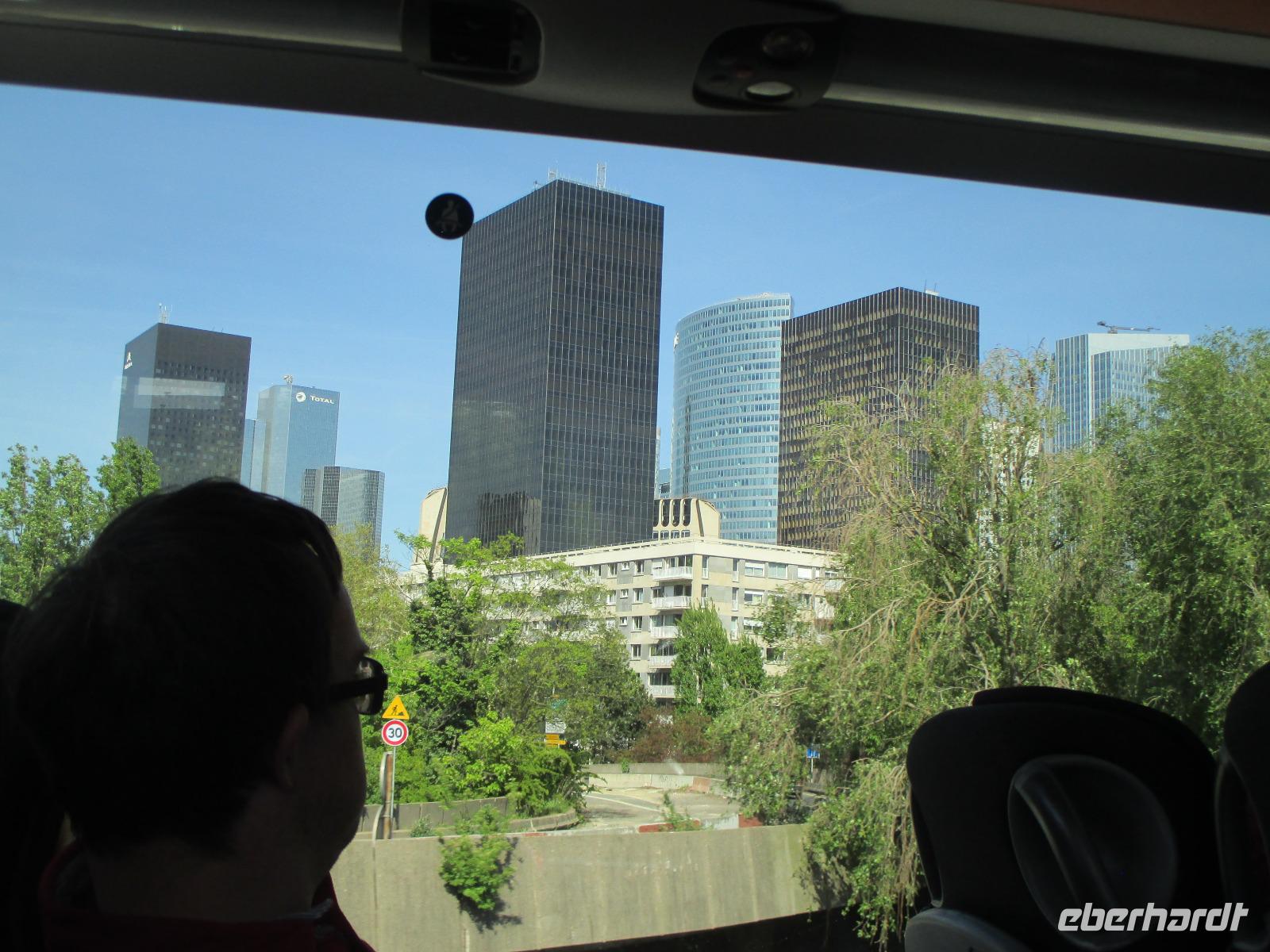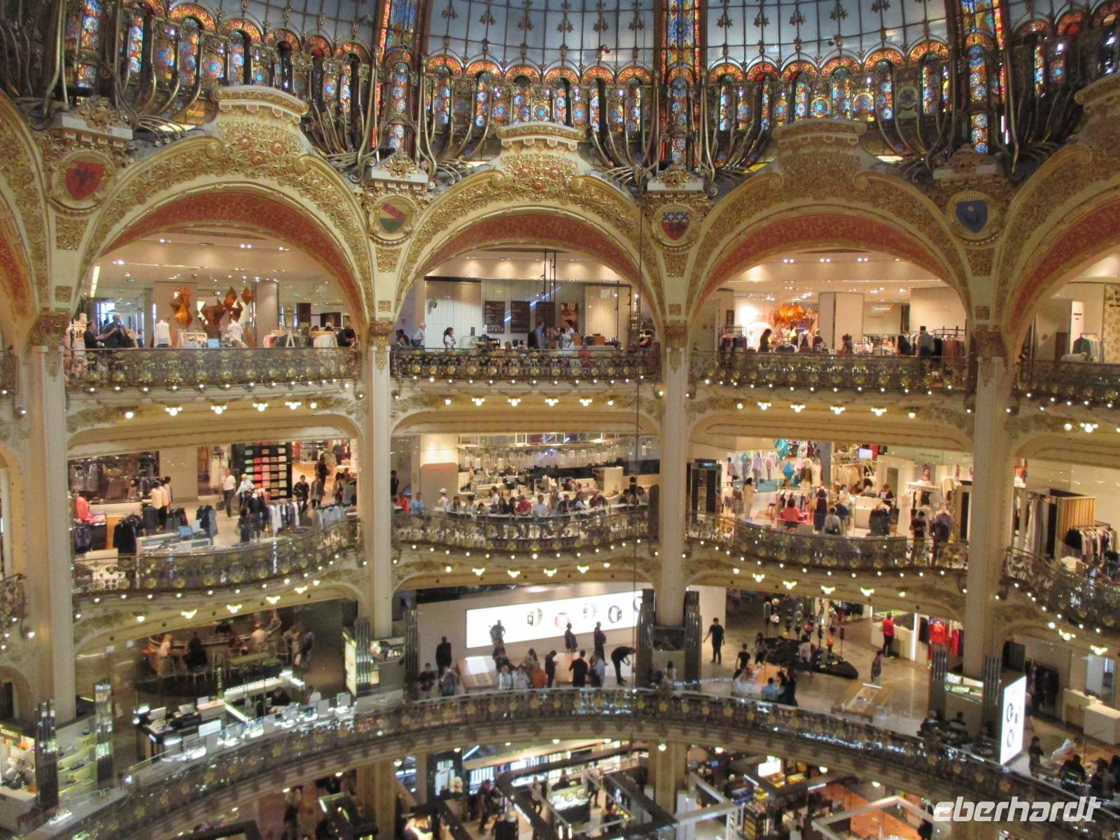 Paul erwartet uns schon und gemeinsam starten wir zu einer zweiten Stadtrundfahrt in den Westen der Stadt und in das moderne Hochhausviertel La Defense, Europas größte Bürostadt. Sie ist nahtlos mit Paris verbunden, liegt aber einige Kilometer außerhalb der Stadtgrenze. Uns überrascht eine ganz andere beeindruckende futuristisch wirkende Welt mit Wolkenkratzern. Petra bringt uns noch mit der Rolltreppe auf die Terrasse des Kaufhauses La Fayette. Hier werfen wir einen Blick über das Häusermeer um die Opera Garnier und blicken in die wunderschöne Jugendstilkuppel des Kaufhauses. Zum Einkaufen reicht leider die Zeit nicht.