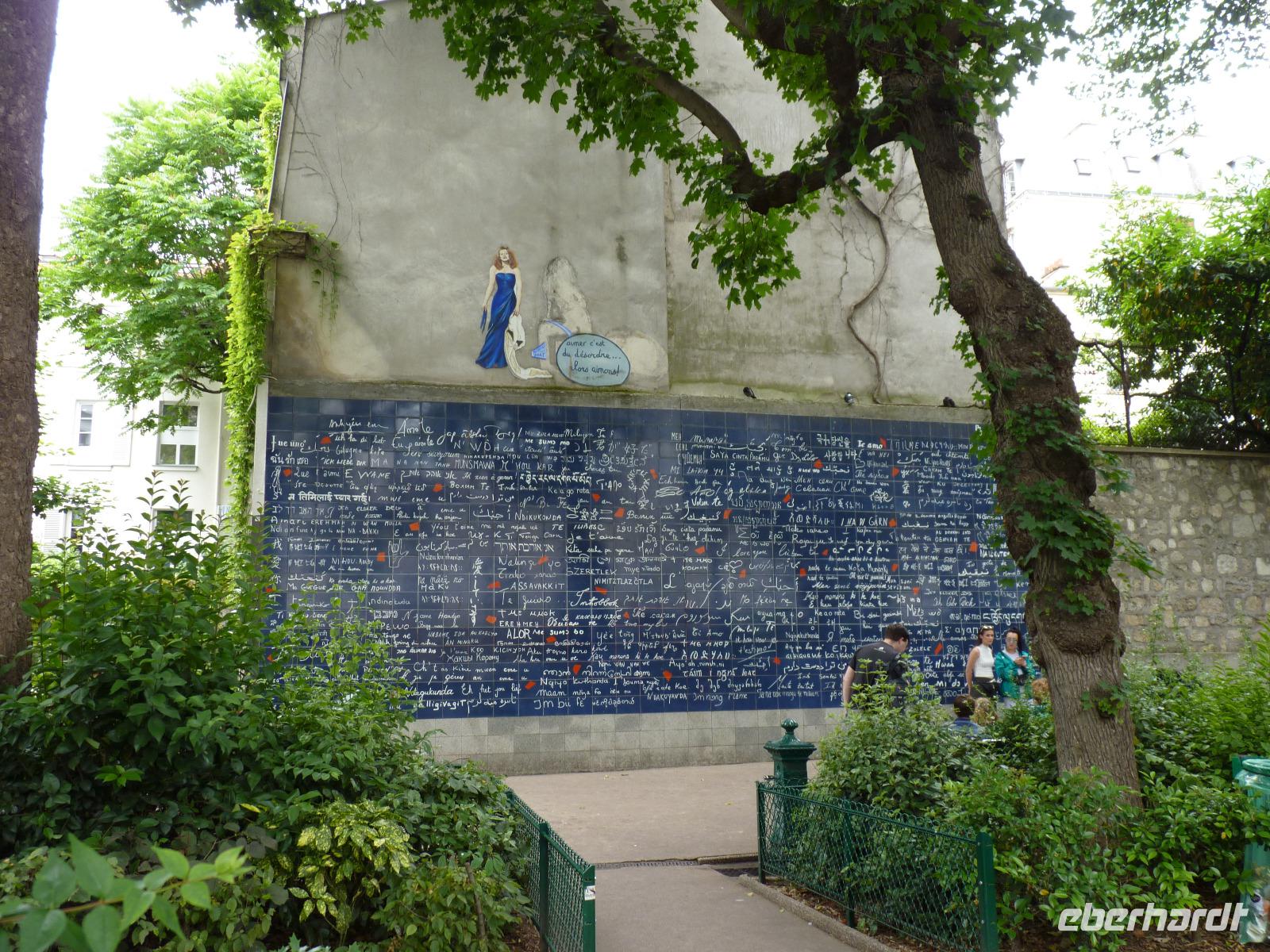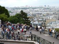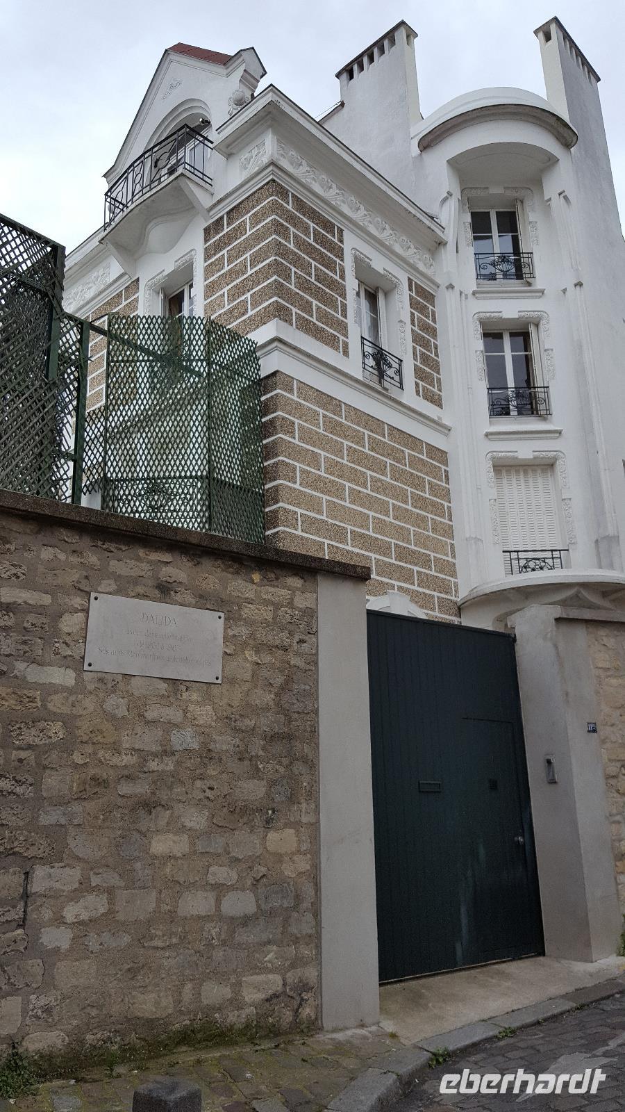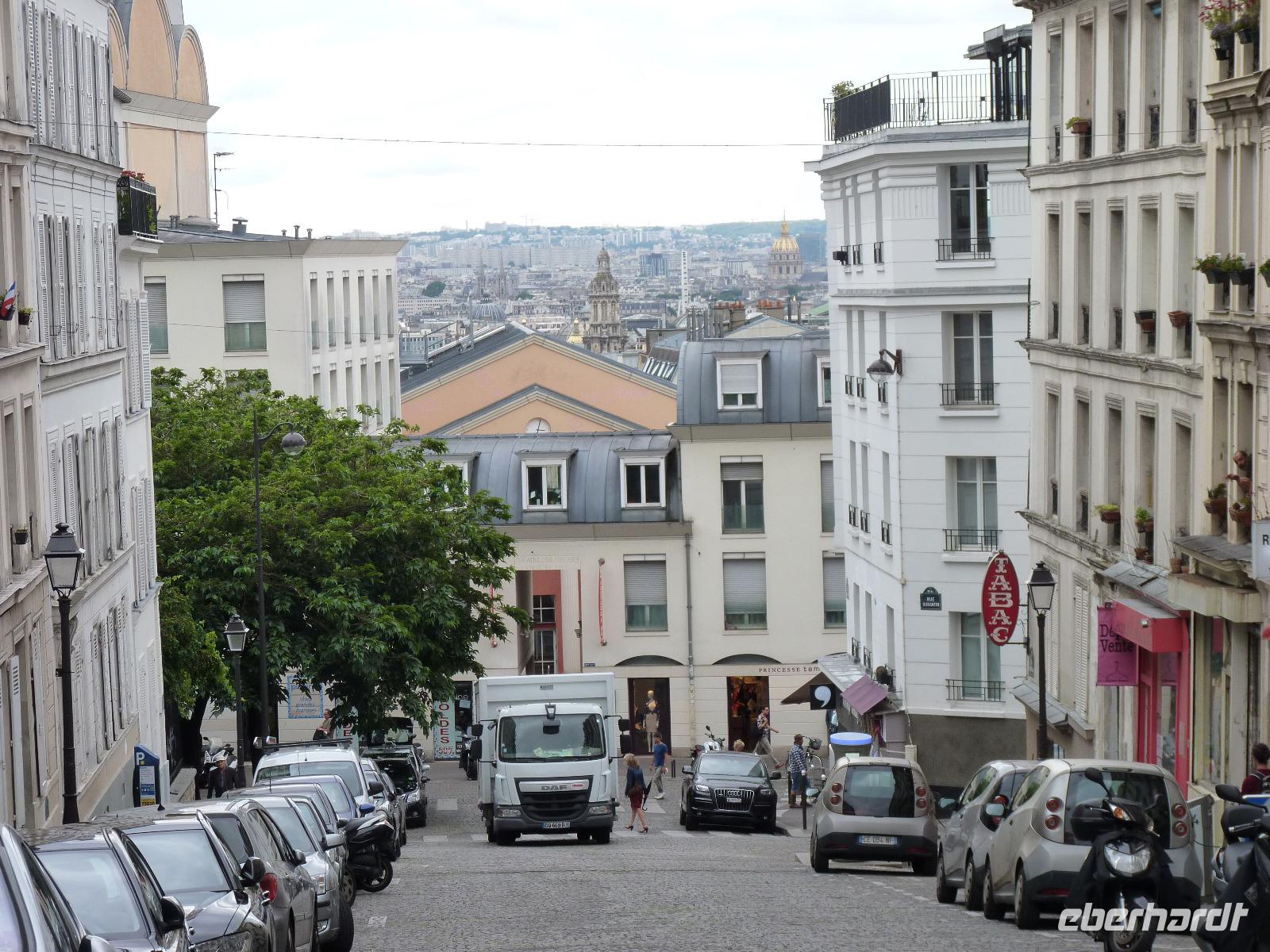 Danach ging es zum Montmartre: Über steile Straßen und enge Sträßchen vorbei an sehr betagten Häusern+ Ateliers (und sogar an einem Weinberg!), am Haus und der Bronzebüste der Sängerin Dalida, über den belebten Place du Tertre bis zur Sacré-Coeur. Hier lockt uns die riesige Kuppel zu einem Aufstieg und Rundgang entlang des außen liegenden Arkadenganges.