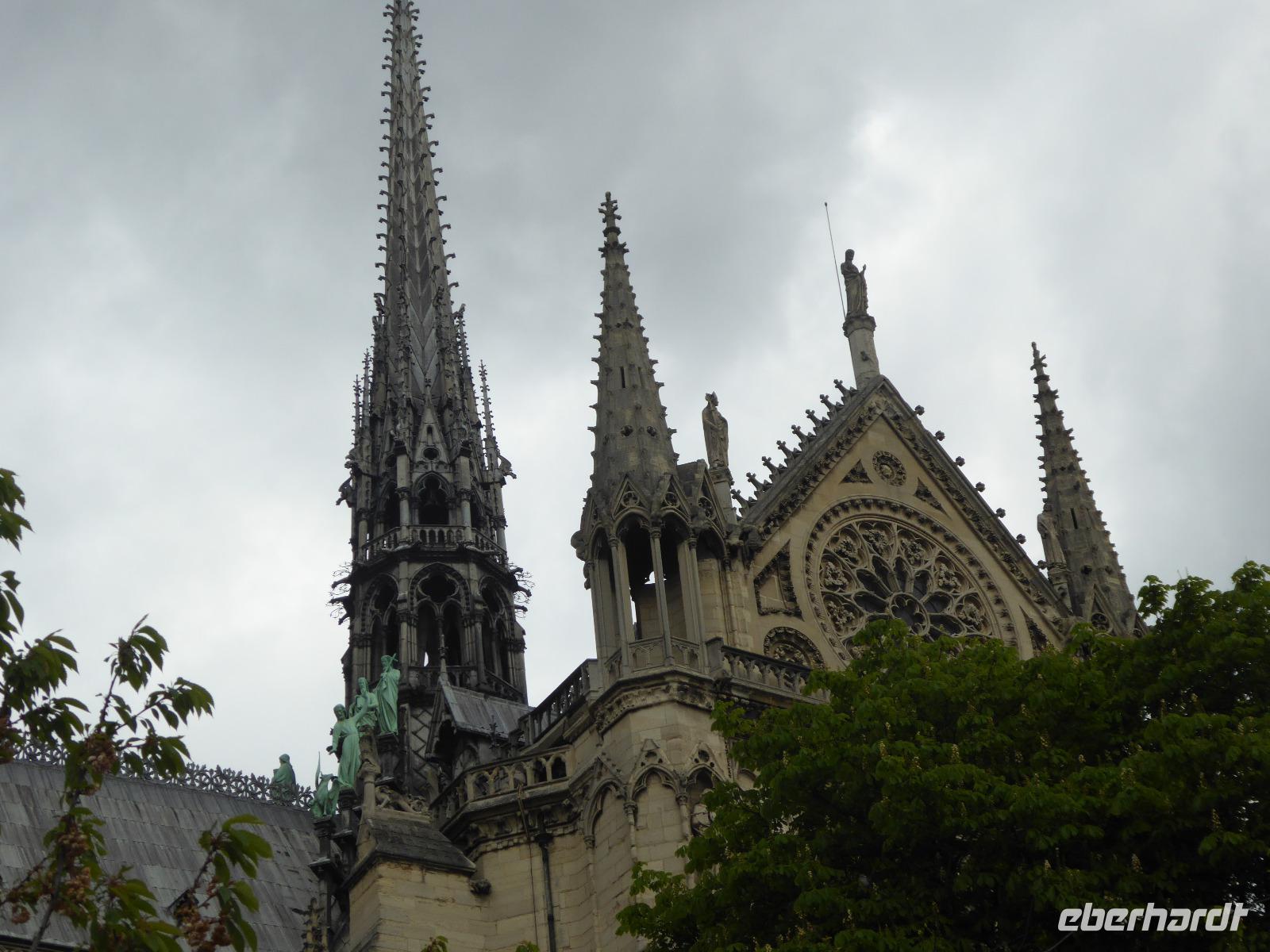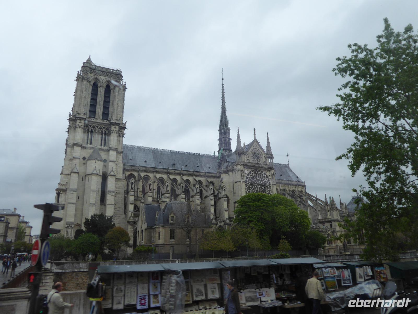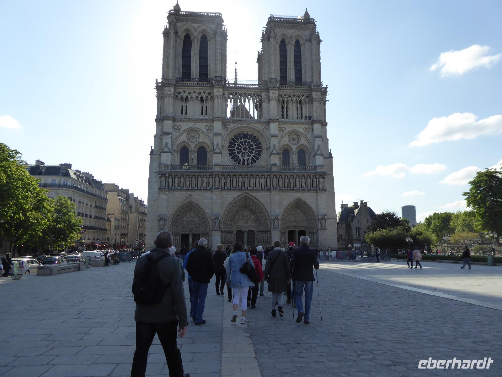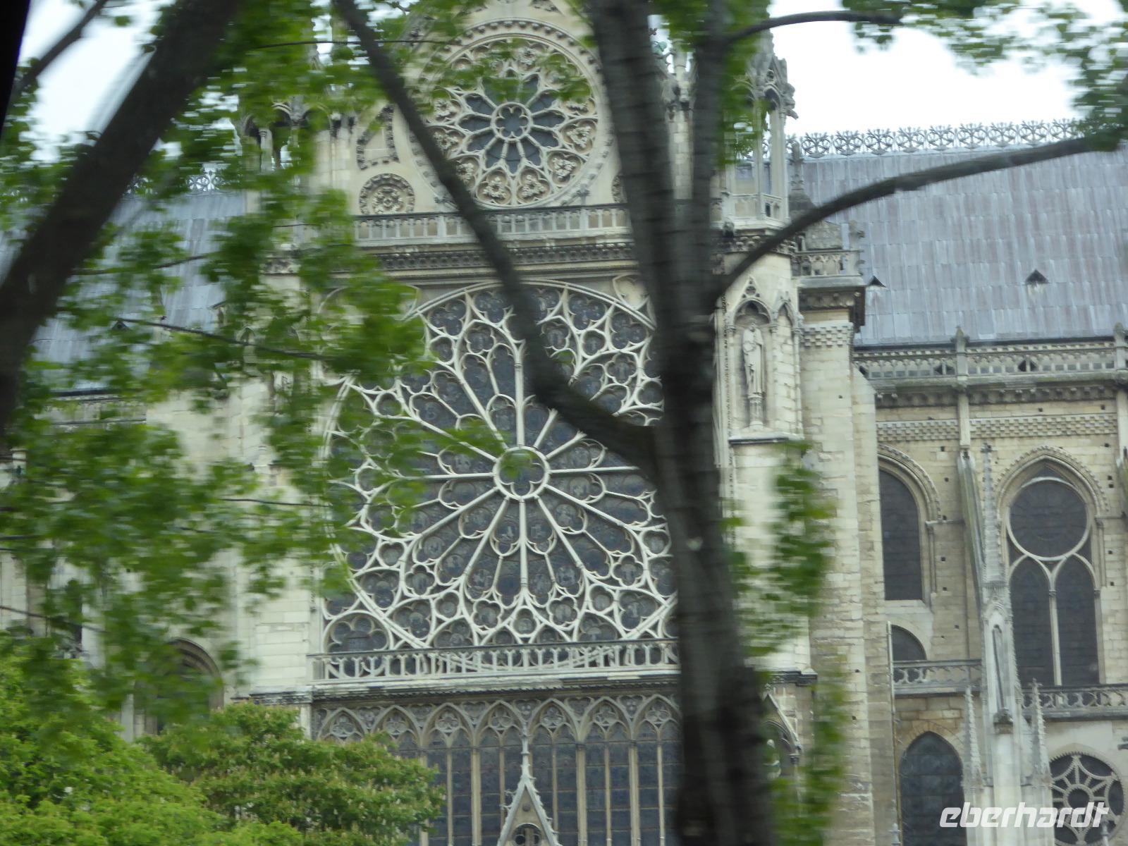 Wir wollen Hilde um neun am Hotel de Ville treffen und fahren halb Neun los. Aber oho! Die Osterferien in Paris sind zu Ende und ganz Paris sitzt im Auto und verstopft die Stadt. Eineinhalb Stunden benötigen wir für fünf Kilometer und kommen fast eine Stunde zu spät. Aber Hilde ist wie immer gut gelaunt und unternimmt mit uns einen ausführlichen Spaziergang über die Ile-de-la-Cité. Zuerst besuchen wir Notre Dame mit seinen wunderschönen bunten Glasfenstern. 1163 wurde von Papst Alexander III. der Grundstein gelegt. Einhundertsiebzig Jahre waren tausende Handwerker, Architekten und Steinmetze mit dem Bau der Kathedrale beschäftigt. Victor Hugos Roman Der Glöckner von Notre Dame erschien 1831. Im Mittelpunkt der Geschichte steht die aufwendig beschriebene Kathedrale. Die Sage erzählt, dass man in einer Gruft, in der die Überreste gehängter Personen lagen, das Skelett einer jungen Frau gefunden wurde. Diese wurde von einem anderen Skelett umarmt, das nachweislich einen Buckel und ein zu kurzes Bein hatte. Ebenso konnte man feststellen, dass der Bucklige nicht gehängt wurde, aber trotzdem in der Gruft gestorben war. Als man versuchte, dass Skelett des Buckligen von dem der Frau zu lösen, verfiel es zu staub.