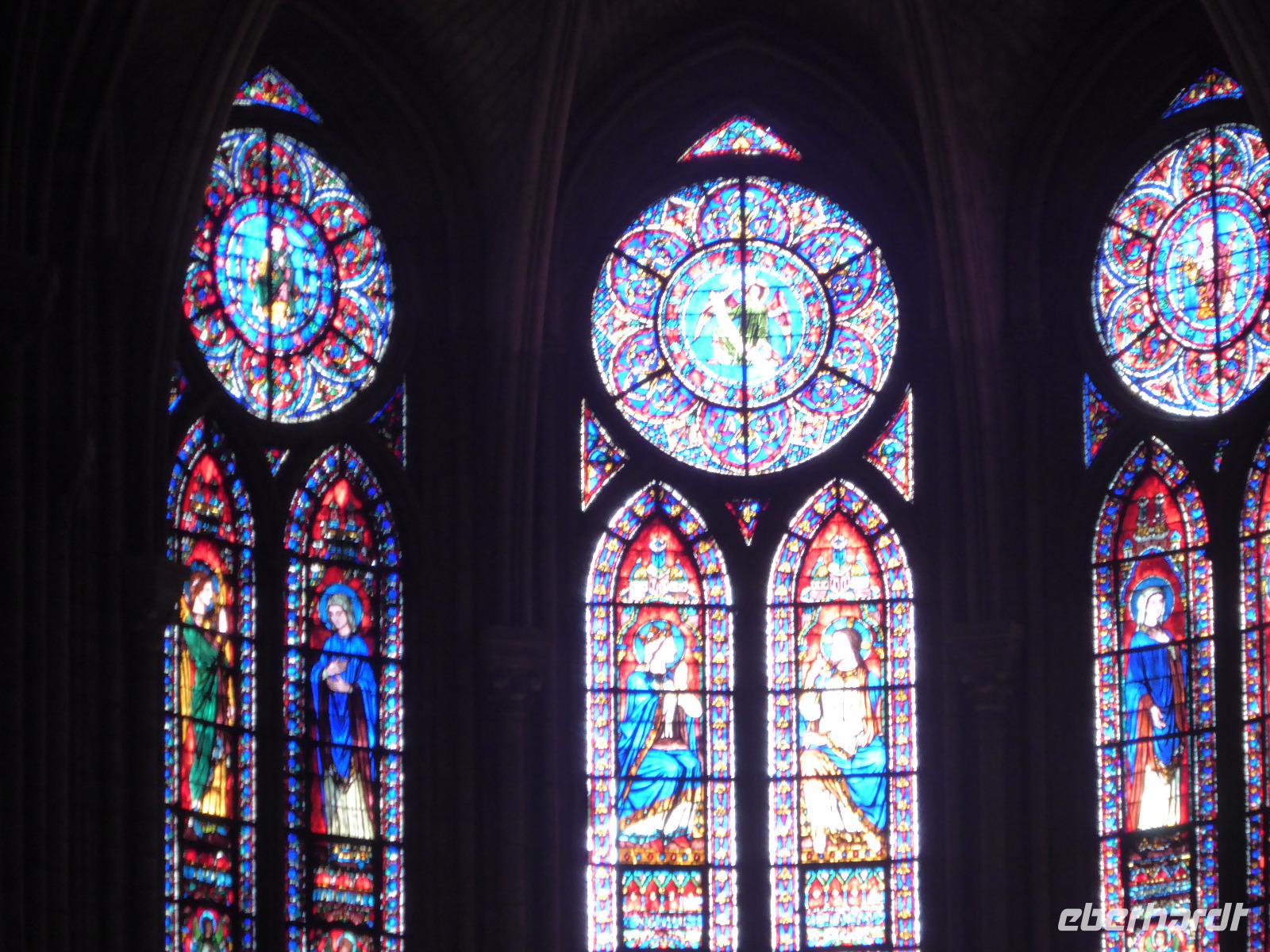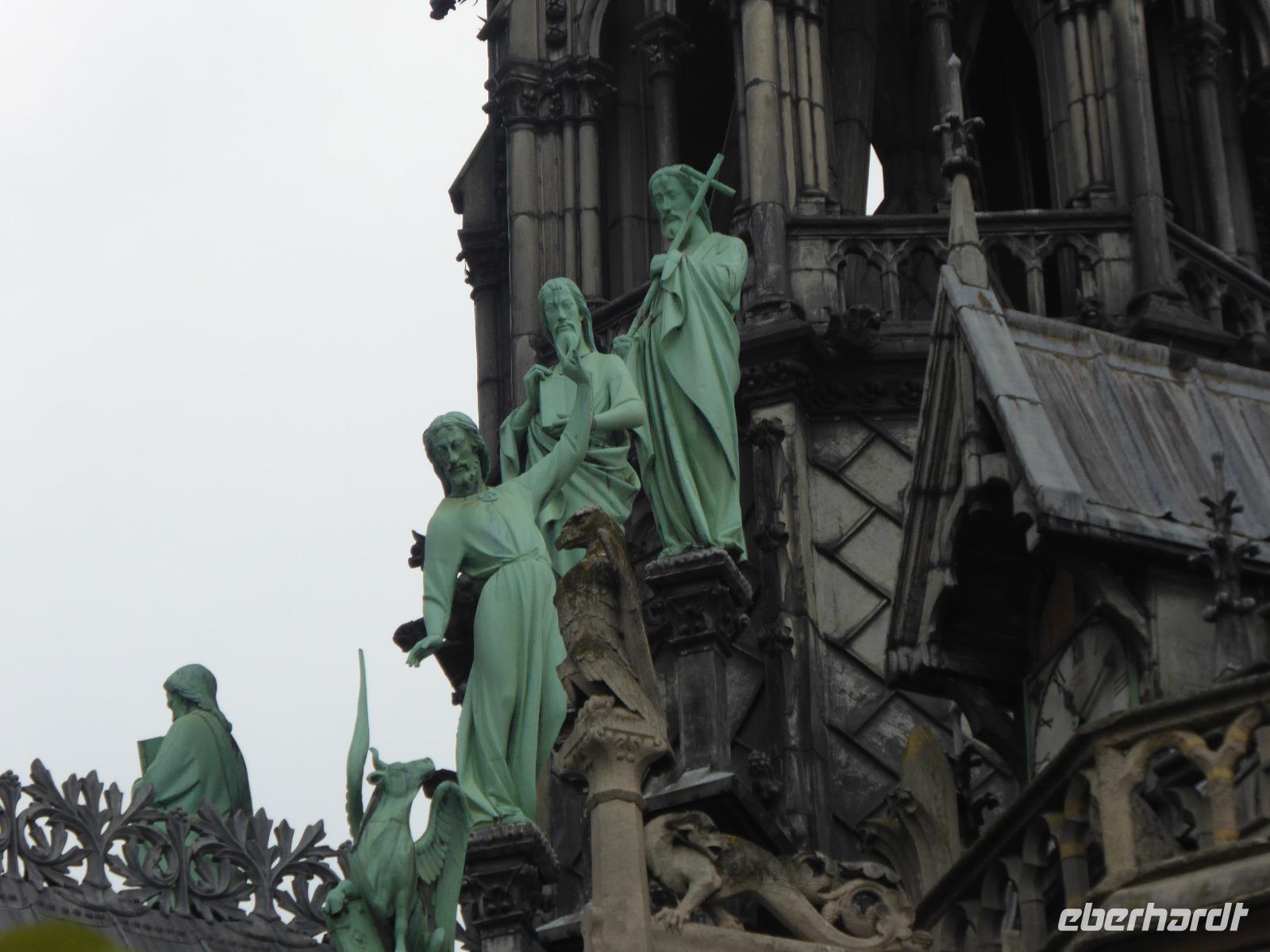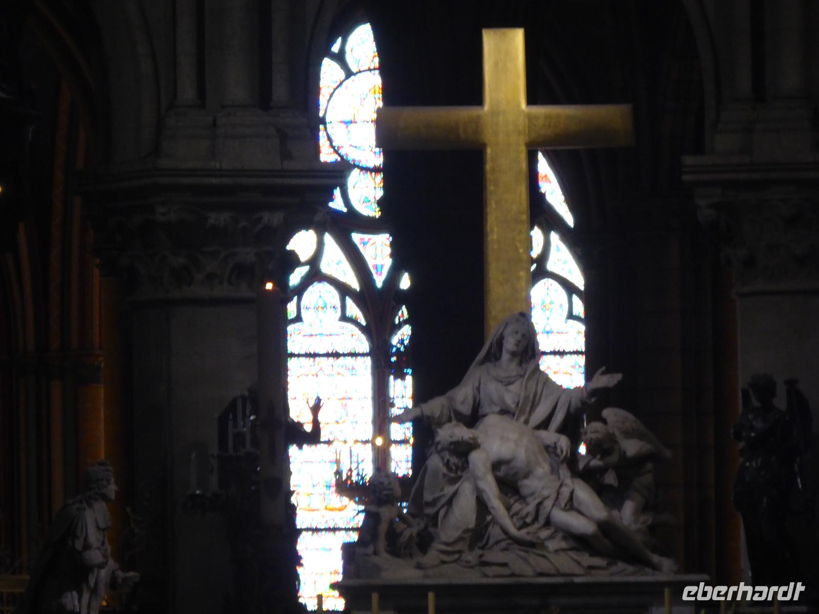 Wir wollen Hilde um neun am Hotel de Ville treffen und fahren halb Neun los. Aber oho! Die Osterferien in Paris sind zu Ende und ganz Paris sitzt im Auto und verstopft die Stadt. Eineinhalb Stunden benötigen wir für fünf Kilometer und kommen fast eine Stunde zu spät. Aber Hilde ist wie immer gut gelaunt und unternimmt mit uns einen ausführlichen Spaziergang über die Ile-de-la-Cité. Zuerst besuchen wir Notre Dame mit seinen wunderschönen bunten Glasfenstern. 1163 wurde von Papst Alexander III. der Grundstein gelegt. Einhundertsiebzig Jahre waren tausende Handwerker, Architekten und Steinmetze mit dem Bau der Kathedrale beschäftigt. Victor Hugos Roman Der Glöckner von Notre Dame erschien 1831. Im Mittelpunkt der Geschichte steht die aufwendig beschriebene Kathedrale. Die Sage erzählt, dass man in einer Gruft, in der die Überreste gehängter Personen lagen, das Skelett einer jungen Frau gefunden wurde. Diese wurde von einem anderen Skelett umarmt, das nachweislich einen Buckel und ein zu kurzes Bein hatte. Ebenso konnte man feststellen, dass der Bucklige nicht gehängt wurde, aber trotzdem in der Gruft gestorben war. Als man versuchte, dass Skelett des Buckligen von dem der Frau zu lösen, verfiel es zu staub.