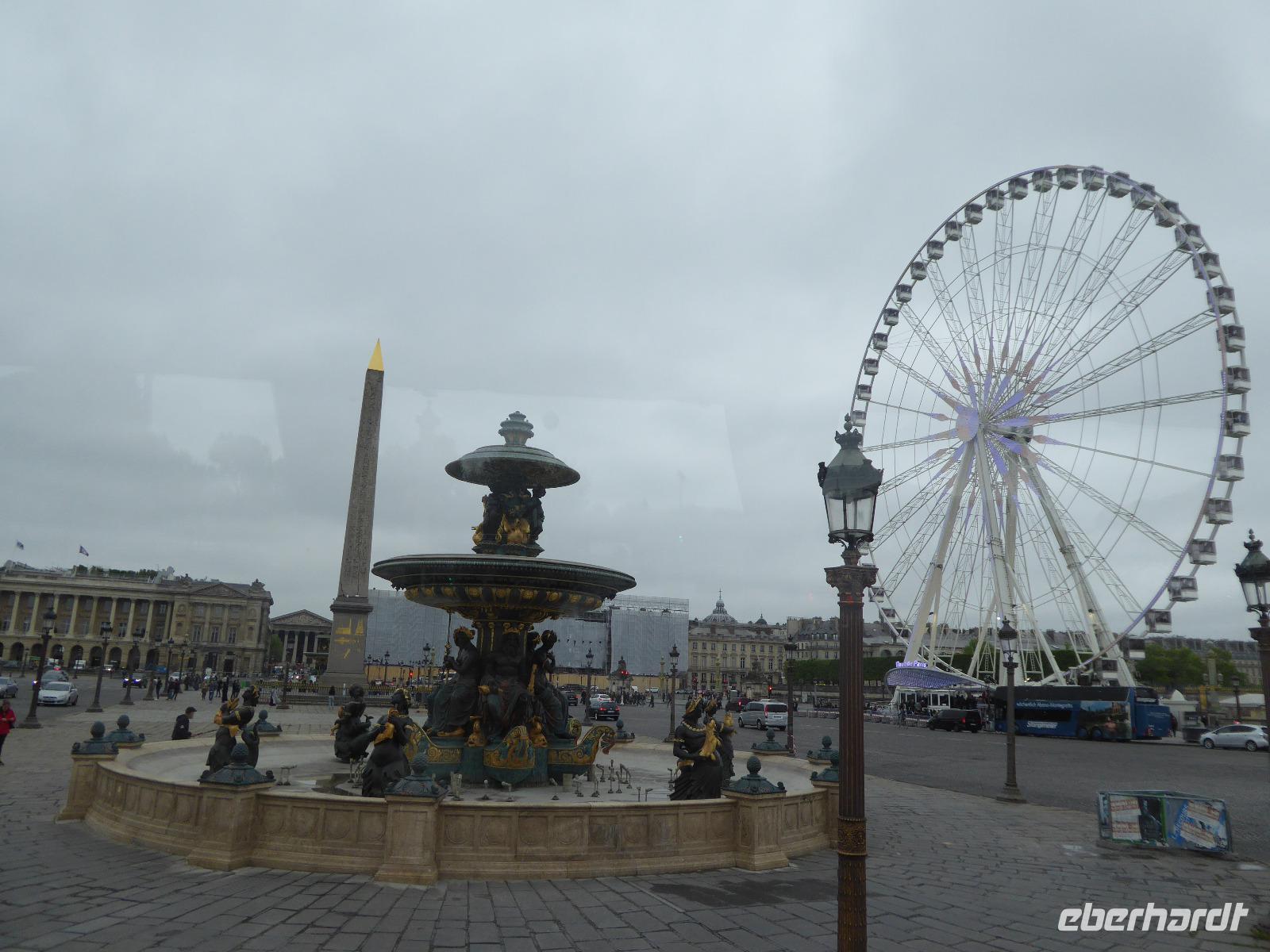 Wir fahren weiter, entlang der Chams-Elysees, fädeln uns in den Kreisverkehr am Triumphbogen ein und gelangen zum Louvre. Durch einen sehr schmalen Durchgang schafft es Steffen ohne anzustoßen und wir können die gläserne Pyramide am Louvre bewundern. Aussteigen möchten wir hier nicht, denn es wimmelt von Menschen. Wir steigen erst wieder am Place de la Concorde aus. Hier können wir zum einen sanitäre Anlagen aufsuchen, aber auch das große Riesenrad und die schönen Springbrunnen ansehen. Der Place de la Concorde ist einer der bedeutendsten Plätze der europäischen Geschichte. Mitte des 18. Jahrhunderts hieß der Platz - Place Louis XV und in der Mitte stand eine Statue des Königs. Diese wurde während der Revolution durch eine Guillotine ersetzt, mit der über tausend Menschen geköpft wurden. Berühmte Persönlichkeiten, die hier ihr Leben verloren, waren Marie Antoinette, Louis XVI., aber auch die Revolutionsführer Danton und Robespierre. Schließlich wurde der Platz wieder umbenannt, in Concorde, was EINTRACHT bedeutet. Heute befindet sich auf dem Platz ein über dreitausend Jahre alter Obelisk, zwei Brunnen und acht Statuen. Außerdem das große Riesenrad, gut geeignet als Treffpunkt für uns. Außerdem gibt es einen kleinen Markt, auf dem wir uns eine Tüte Macarons gönnen. Ein Ostergeschenk von Eberhardt TRAVEL. Ab Moulin Rouge beginnt die individuelle Mittagspause. Anschließend treffen wir uns wieder und fahren Richtung Montmatre, dem Inbegriff eines Künstlerviertels. Hilde führt uns durch Straßen und Gässchen, bis wir schließlich zur Sacre Coer kommen. Strahlend weiß erhebt sich die Hauptfassade der neoromanisch-byzantinischen Kirche vor unserem Blick. Hilde kennt einen Trick, wie man sich am Seiteneingang an den wartenden Mengen vorbei schlängeln kann. So haben wir das Glück, schnell in das Innere des berühmten Wahrzeichens eintauchen zu können. Hilde erklärt uns, was es hier zu sehen gibt, anschließend ist noch Zeit für eigene Besichtigungen. Am Place du Tertre kann man gemütlich einen Kaffee trinken, bevor wir uns treffen, um zu unserem Restaurant zu gehen. Im Restaurant Le Paprika gibt es leckere Leberpastete, noch leckeres Geflügel mit einer fantastischen Soße und grünen Bohnen und zum Nachtisch Schokoladenkuchen. So schön kann ein Tag in Paris enden.