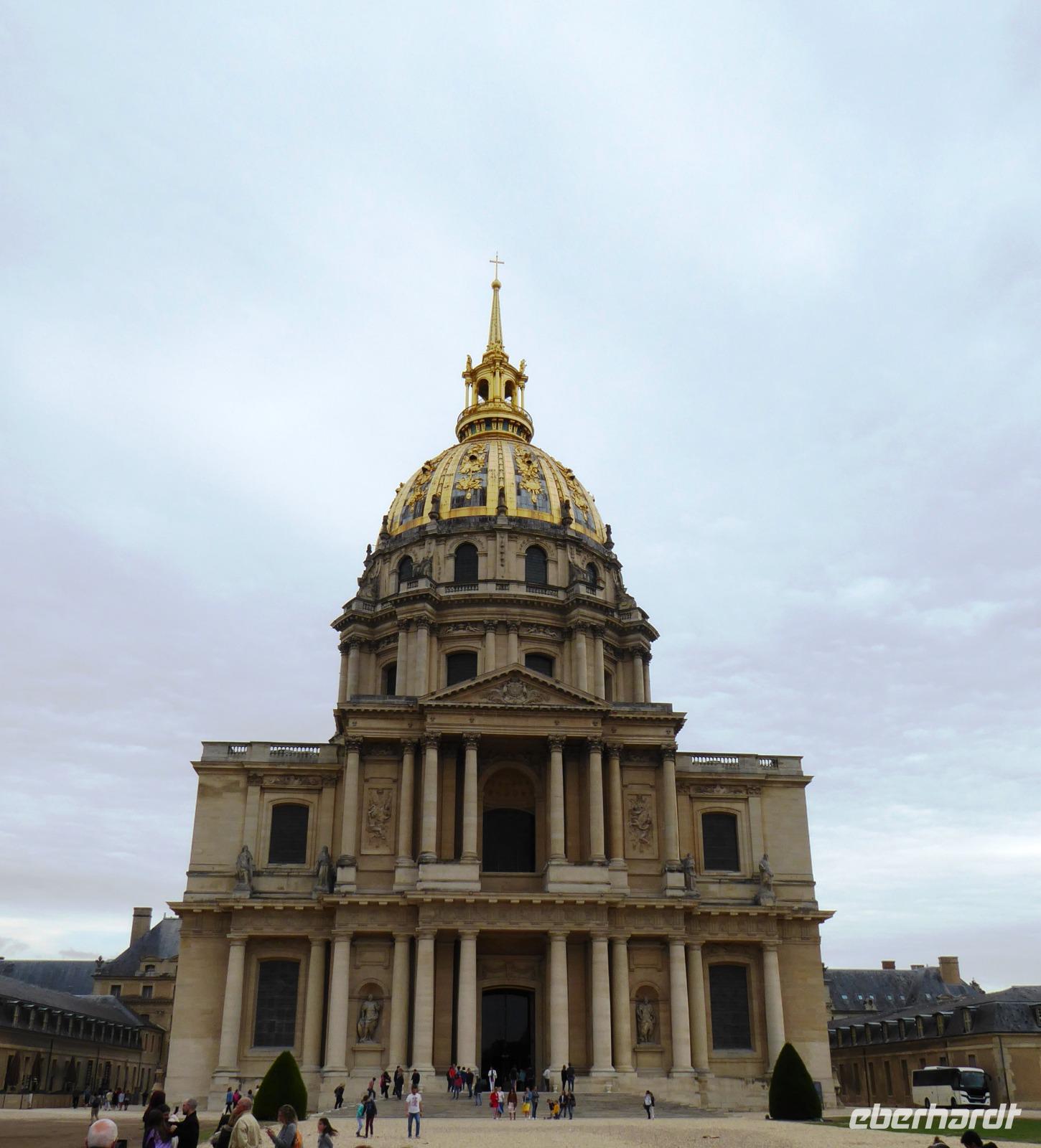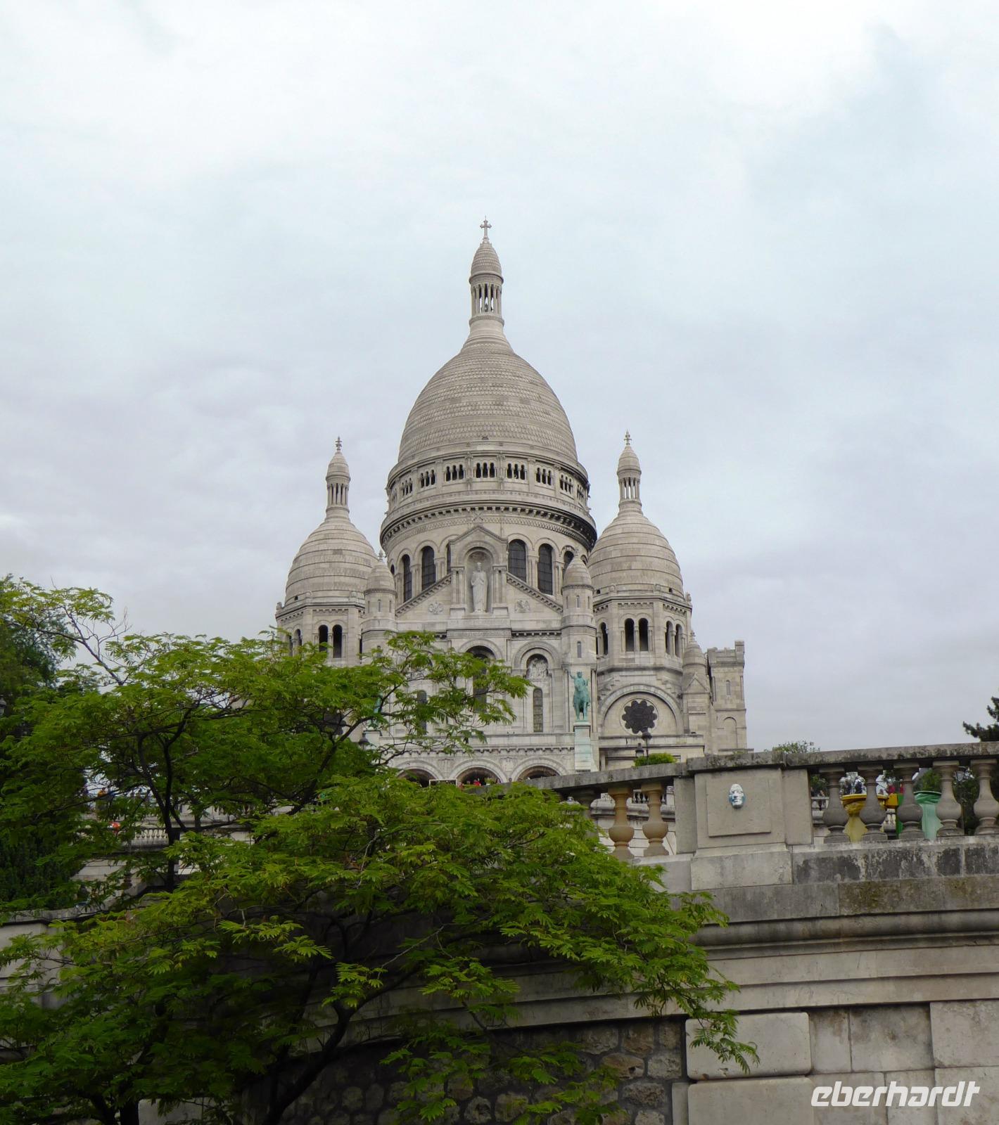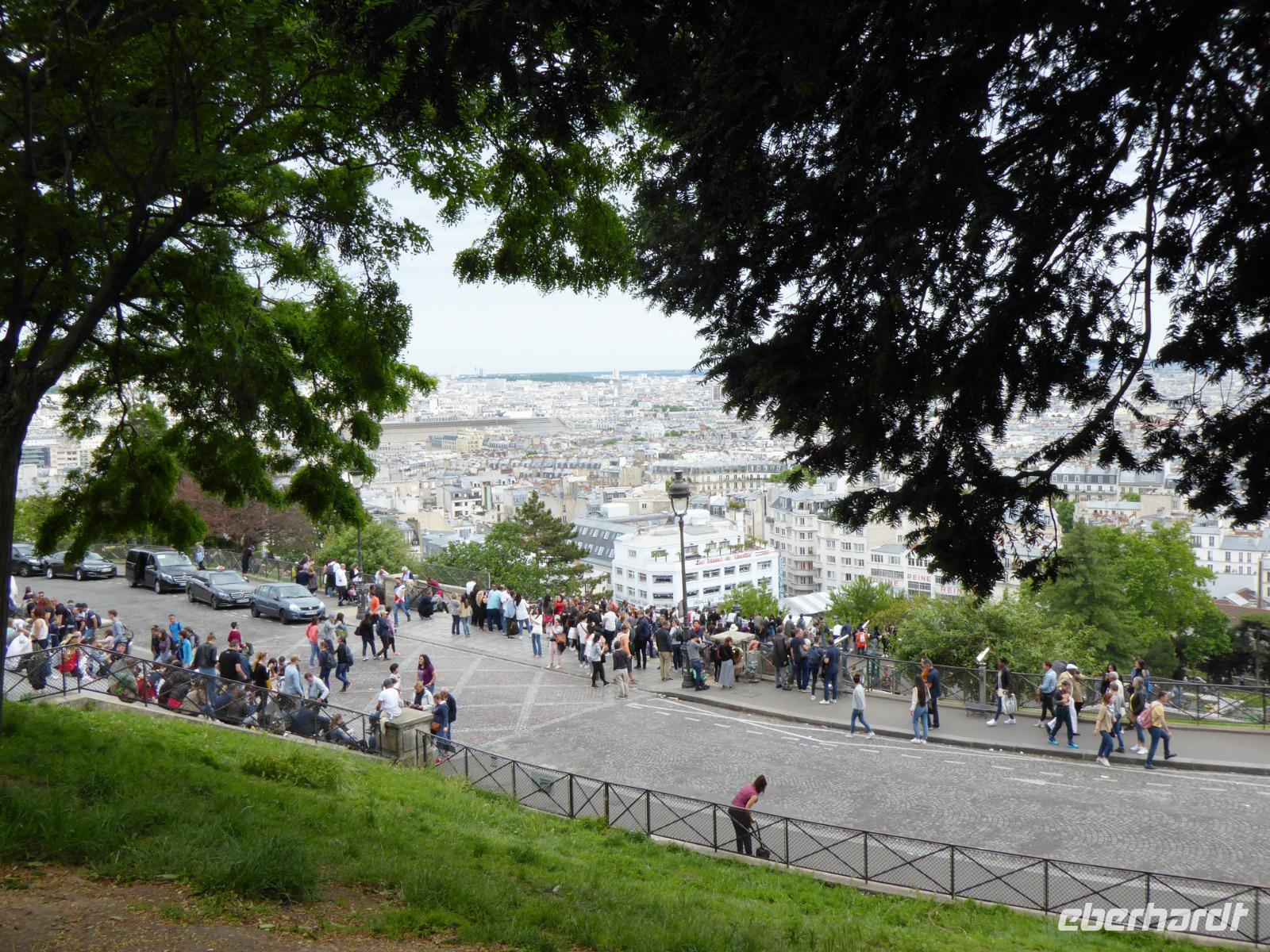 Von hier sahen wir auch das Grand Palais und das Petit Palais, beide zur Weltausstellung 1900 gebaut. Wir fuhren über die fast zwei km lange Champs-Elysées, Teil der großen historischen Achse zwischen dem Obelisken von Luxor und dem Arc de Triomphe, auf den wir zufuhren. Auf dieser Prachtstraße sind nach wie vor viele bekannte Automarken mit einem Geschäft vertreten, außerdem der Parfumhersteller Guerlain, Louis Vuitton, das Revuetheater Lido und Ladurée, der Spezialist für die leckersten Macarons! ;-), um nur einige wenige herauszugreifen. Vom Arc de Triomphe fuhren wir weiter zum sogenannten Trocadéro-Platz - nach dem gleichnamigen früheren Palais so benannt. Von hier aus hatten wir den besten Blick auf den Eiffelturm. Über den Invalidendom, an dem wir noch einmal einen Fotostop einlegten, fuhren wir nach einer kurzen Pause im Hotel weiter in das Montmartre-Viertel, wo wir individuell alle Zeit genug hatten, um den Tertre-Platz herum eine Mittagspause zu gestalten. Nachmittags fanden wir uns zum Rundgang mit unserer ausgezeichneten Stadtführerin Hilde alle wieder zusammen und besichtigten mit ihr die wunderschöne Sacré-Coeur, von deren Vorplatz aus man einen herrlichen Blick über das Pariser Häusermeer hat, den von kleineren und größeren Künstlern besiedelten Tertre-Platz, und spazierten weiter durch viele kleinere Straßen dieses bunten Viertels, von denen man immer wieder auch freien Blick auf die weiter unten gelegenen Viertel von Paris hatte.