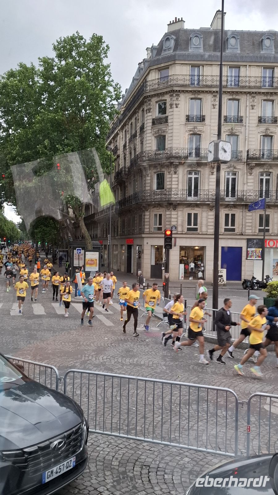 Heute ging es nach dem Frühstück zunächst in den historischen Stadtteil Marais - die ehemaligen Sümpfe von Paris. Michael und Astrid erwarteten uns schon, wir hatten die leeren Straßen des Pfingsmontags noch genutzt, um eine Runde am berühmten Kreisverkehr des Triumphbogens langzufahren und anschließend per Bus über die Chams-Elysees zu flanieren, ein kleiner Umweg, da wir wegen des Marathons diesen wichtigen Teil von Paris am Vortag noch nicht sehen konnten. In zwei Gruppen ging es anschließend kreuz und quer durch das Marais. Die alten Gebäude mit jüdischen Spuren und die kleinen Gassen begeisterten uns sehr. Michael und Astrid waren echte Marais Insider und legten wir eine erstaunliche Strecke an diesem Morgen zurück. Wir freuten uns auf die bequemen Sitze im Bus und genossen die Laufpause. Nun ging es zu unserem ersten Highlight Richtung Eiffelturm. Die Madame Brasserie in der ersten Etage erwartete uns zum Mittagessen. Wir schlenderten gemeinsam durch den Park zum Eiffelturm, mussten hier und da anstehen und warten. Doch alle waren sehr geduldig, genossen das schöne Wetter und die phantastische Aussicht schon von unten. Dann ging es mit dem Lift hinauf in die erste Etage, wo uns ein excellentes Lokal mit sehr freundlichem Service erwartete. Das Essen schmeckte uns phantastisch und es war eine beseelte Stimmung in der Luft. Nach dem Genuss des Windbeuteltraums zum Dessert und einem wunderbaren französischen Cafe hatten wir nun viel Zeit, um individuell den Eiffelturm auf der ersten Etage zu erkunden. Wir flanierten auf der Aussichtsplattform entlang, schossen zahlreiche Erinnerungsbilder und einige stiegen noch die Stufen zur zweiten Etage hinauf. Der Fußweg zum Bus durch den Garten war gar nicht so einfach. Aus welcher Richtung waren wir gekommen? Doch per Telefon konnten alle Gäste sehr schnell wieder zum Treffpunkt navigiert werden. Viele Gäste blieben am Eiffelturm und liefen von hier in Richtung Triumphbogen oder weiter an der Seine lang. Die Cabaret Gäste fuhren direkt ins Hotel zurück, um sich für den Abend vorzubereiten. Uns erwartete eine bunte Show mit spektakulärem Live Gesang, sehr gutem Essen und Getränken und den schönsten Mädchen von ganz Paris. Gegen Mitternacht erwarteten uns bereits die Chauffeure, welche uns mit Überraschungsstop am glitzernden Eiffelturm sicher ins Hotel brachten. Da glänzten unser Augen sehr. Paris - mon amour!
