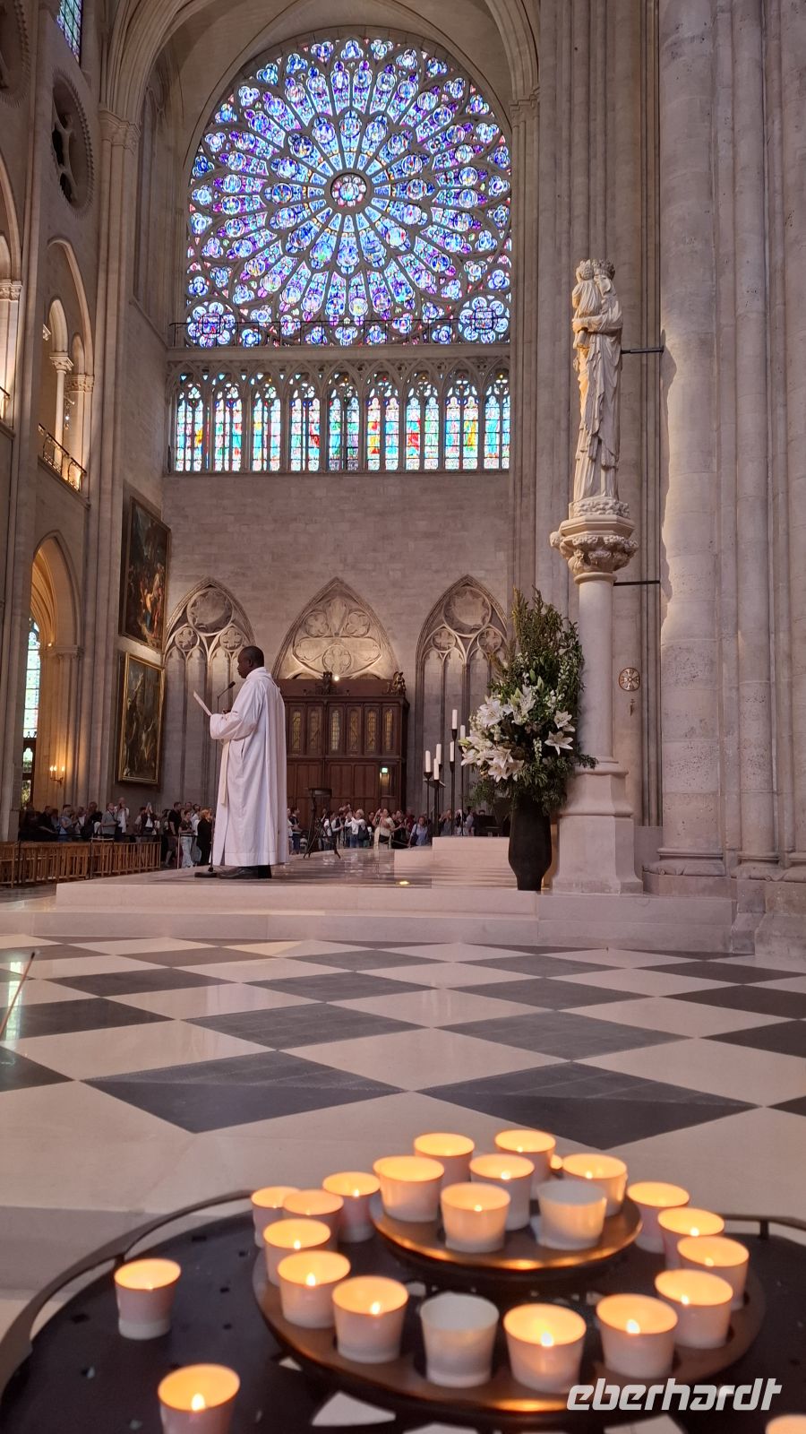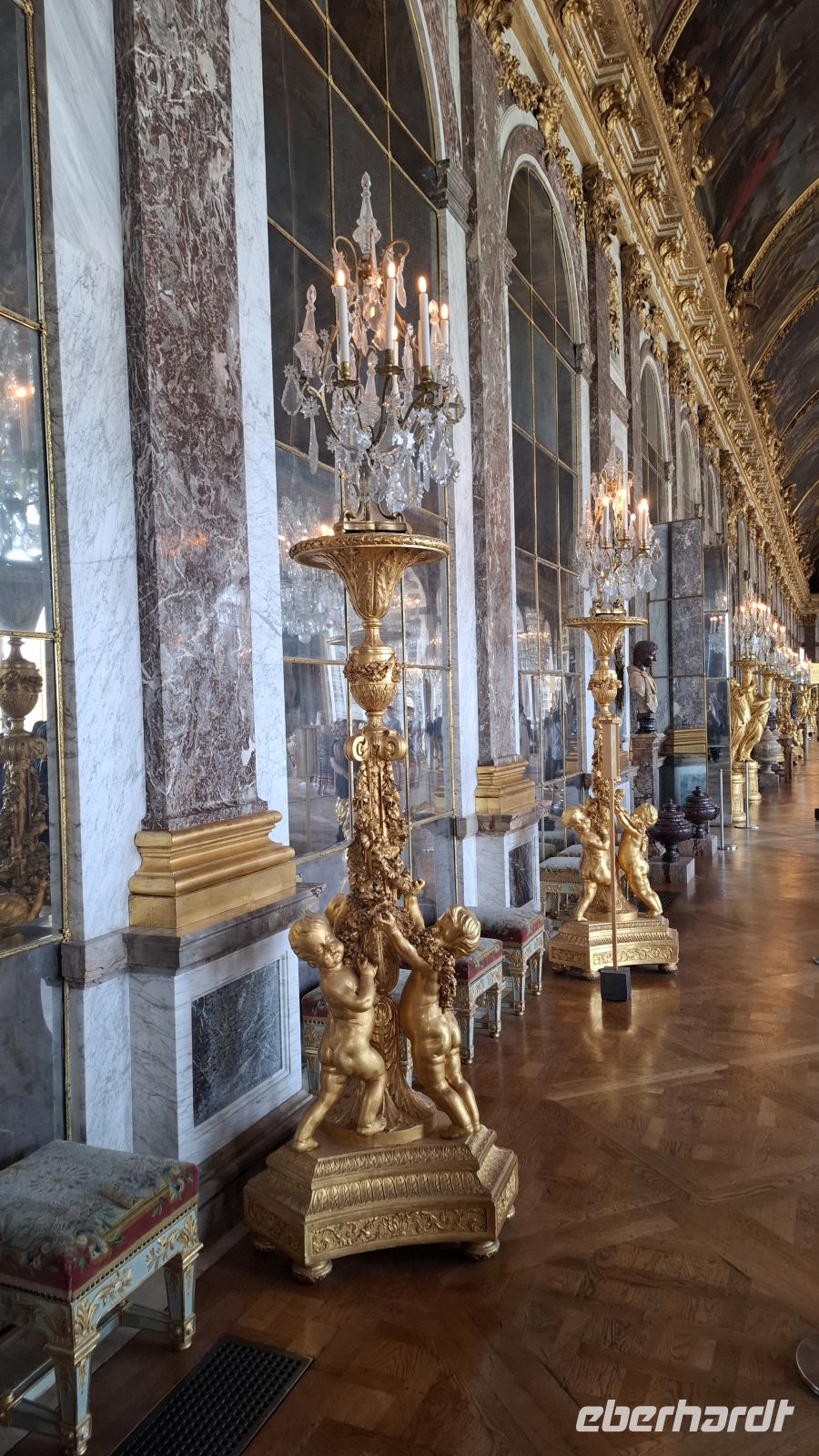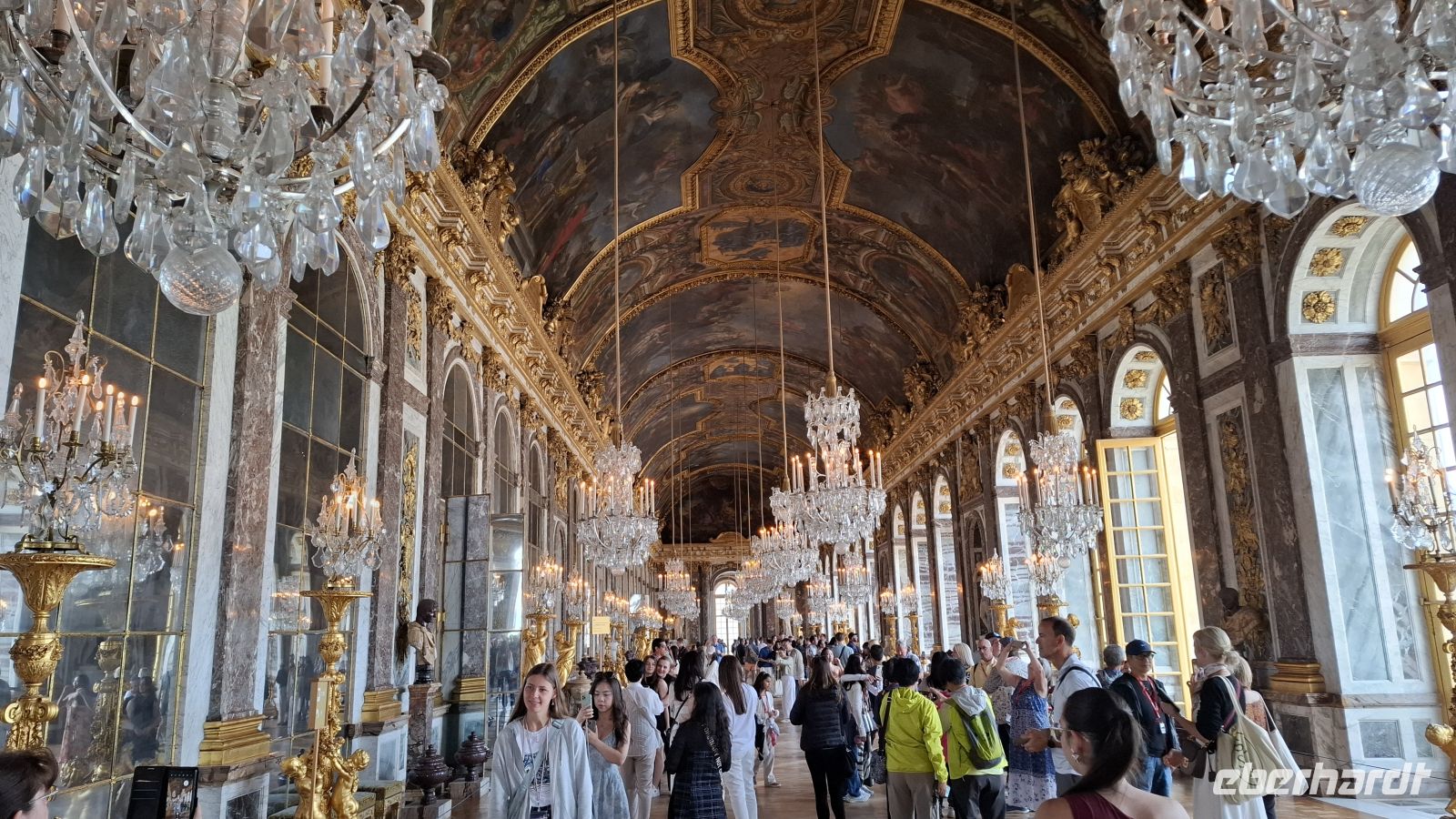 Auch heute wieder Baquette und französischer Camembert zum Frühstück - herrlich! Für die Cabaret-Besucher war es eine kurze Nacht. Doch wir hatten vor, in das Leben am Hofe des Sonnenkönigs einzutauchen. Da ist frühes Aufstehen wichtig! Und es hat sich gelohnt, denn auf dem riesigen Busparkplatz waren nur einige wenige Busse vor uns da. Die Sonne verwandelte den Hof des Sonnenkönigs in ein Meer aus glitzerndem Gold. Wir waren begeistert und konnten direkt und ohne Anstehen ins Schloss gehen. Das vertrieb den Gästen die Müdigkeit schnell aus den Beinen und alle schreiteten in Richtung Spiegelsaal. Wir waren begeistert von der üppigen Ausstattung des Schlosses, der prächtigen Kapelle und dem langen Spiegelsaal, in dem man heute sogar ein Tänzchen wagen konnte. Vor den Fenstern genossen wir die Ausblicke in den üppigen Garten. Da wir so früh da waren, nutzten einige die Zeit, sogar noch die Gärten und Wasserspiele zu besichtigen oder in den hübschen Ortskern von Versailles zu spazieren und in den Markthallen Leckereien für die Mittagspause und die Daheimgebliebenen zu erwerben. Gegen Mittag trafen wir uns am Bus wieder auf einen kleinen Imbiss, tauschten gutgelaunt unsere Entdeckungen aus und anschließend chauffierte uns unser Fahrer Evgenij zuück nach Paris. Heute Nachmittag wagten wir ein Experiment: Wir wollten mir der gesamten Reisegruppe die neueröffnete Kirche Notre Dame de Paris besichtigen. Doch wie lang die Besichtigungsschlange heute sein würde, ahnte keiner. Der halbe Vorplatz war voller Gäste aus aller Welt. Aber es ging rasend schnell voran und so erreichten wir das Kircheninnere schon nach unglaublichen zehn Minuten. Die Kirche empfing uns strahlend hell. Wir hatten sehr viel Zeit, um ganz in Ruhe all die wundervoll restaurierten Schätze im Innenraum zu genießen. Hier und da nahm man noch den Geruch von Rauch wegen des Brandes wahr. Wir waren sehr überwältigt von der monumentalen Kraft der Kirche. Anschließend konnten wir noch auf der Seine Insel bummeln, einige zog es bis an die Pyramide vom Louvre, viele genossen widerum den Nachmittag im Schatten eines hübschen Bistros mit Blick zur Seine und zum Eiffelturm. Frisch gestärkt ging es nun in Richtung Palais Royal, dem ehemaligen Wohnpalais der Königsfamilie, bevor sie nach Versailles umzogen. Der Fußgweg dorthin gestaltete sich aufgrund der Hitze etwas anstrengend, doch die Ausblicke im hübschen Rosengarten des Palais und der Springbrunnen entschädigte. Wir pausierten im Schatten und liefen anschließend weiter in Richtung Operette. Unser Ziel war das Operettenrestaurant "Les Noces de Jeannette". Hier genossen wir sichtlich geschafft von dem langen Tag ein wunderbares Boef Bourgignon und begrüßten unseren Chauffeur Evgenij als Überraschungsgast im Lokal.