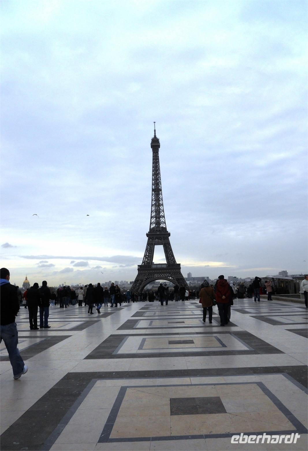 Nächstes Ziel war der Trocadéro-Platz, an dem ursprünglich auch ein Trocadéro-Palais stand, das zur großen Ausstellung von 1937 durch das heutige Chaillot-Palais ersetzt worden ist. In der Mitte der erhöhte Vorplatz, von dem aus wir einen wunderschönen Blick über das Gartengelände auf die andere Seine-Seite, den Eiffelturm und das Marsfeld hatten.