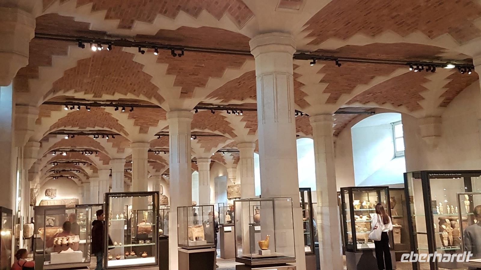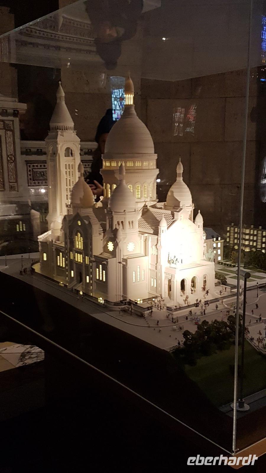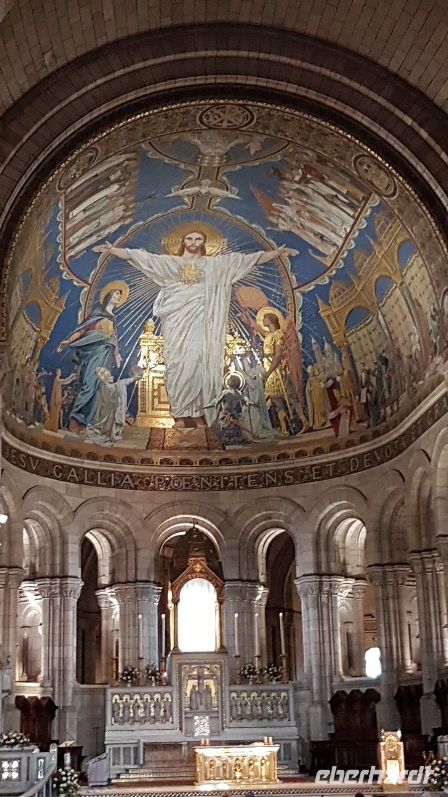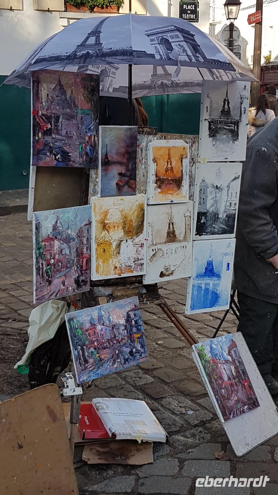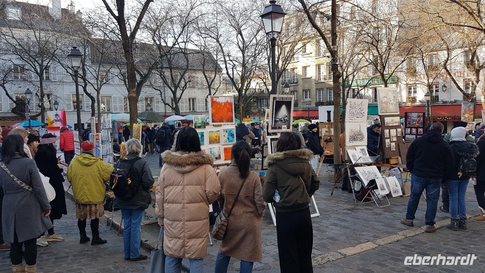 Vor dem Sacré Coeur genießt man eine schöne Aussicht auf Paris, wir können einige Gebäude erkennen, die wir schon gestern aus der Nähe gesehen haben. Nach der Besichtigung der Kirche mit einem Goldmosaik an der Apsis sehen wir gleich daneben Saint-Pierre de Montmartre, eine der ältesten Kirchen von Paris. Dort ist viel weniger los, obwohl es sehr schön ist. Dann sind wir schon am Place du Tertre, wo die heutigen Maler unterschiedlicher Begabung ihre Werke zeigen. Eine kleine Pause ist dort sehr willkommen.
