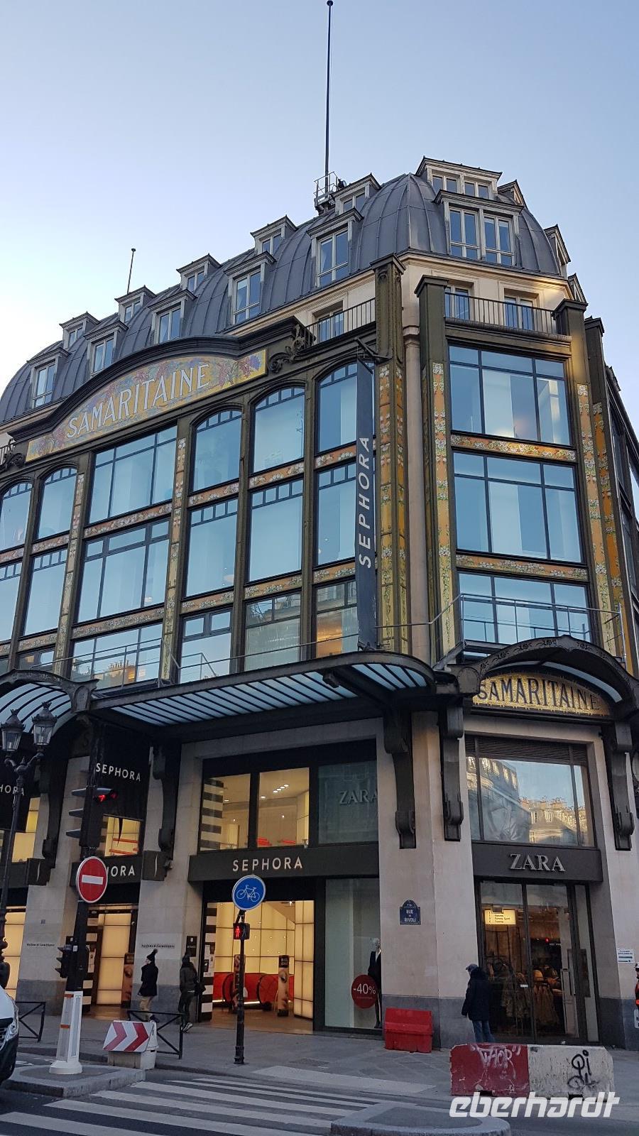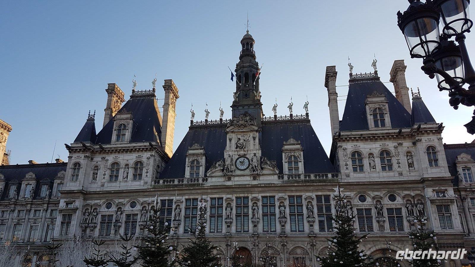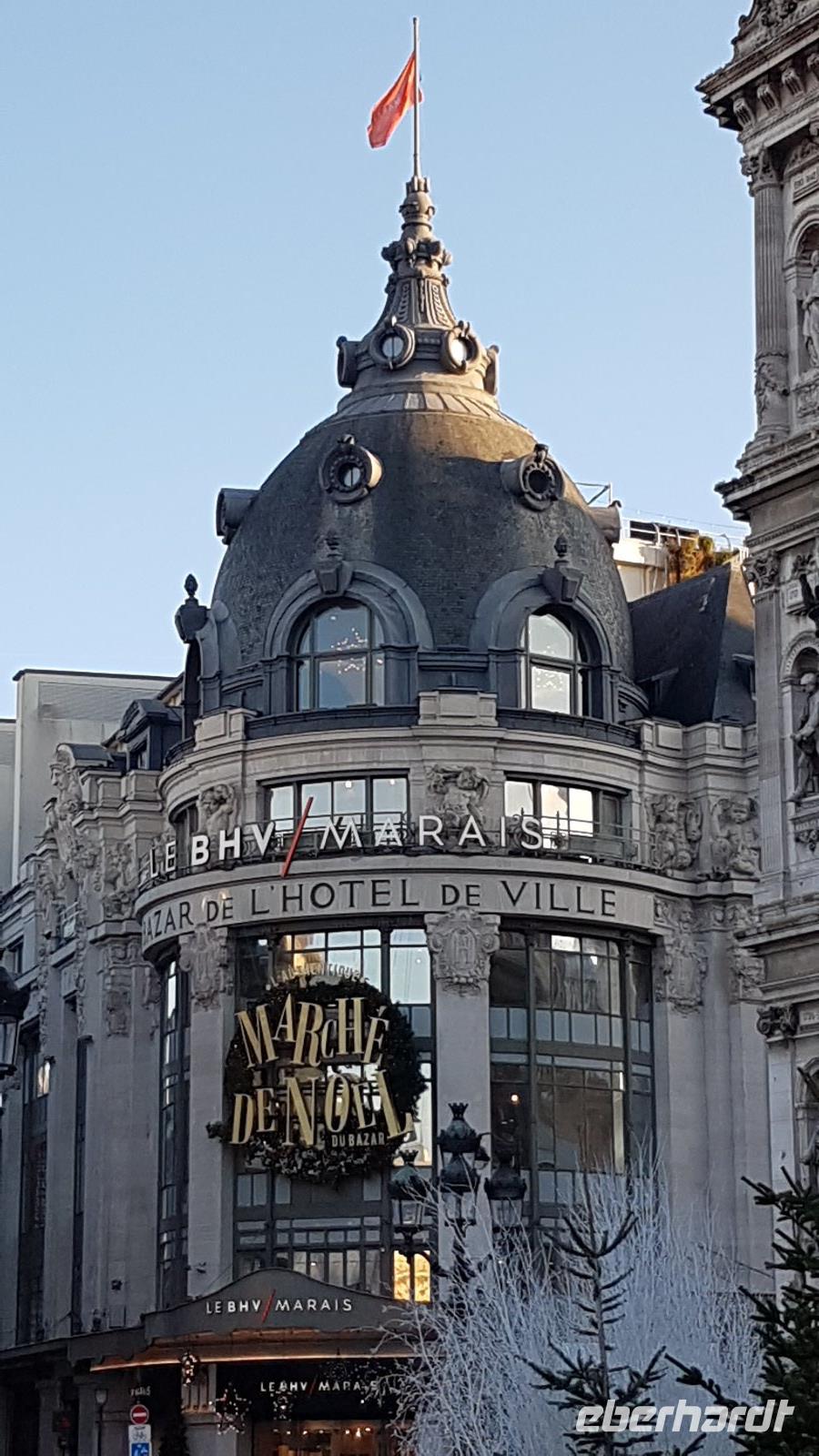 Bald sind wir vor dem Rathaus von Paris, ein imposanter Renaissance-Bau, der nach dem Brand durch die "Communards" in 1871 im gleichen Stil wiederaufgebaut wurde. Die Statue von Etienne Marcel, "prévot des marchands de Paris", erinnert uns, dass sein gescheiterter Versuch im Jahre 1358 die politische Rolle von Paris zu fördern, dazu geführt hat, dass erst im 1974 ein Bürgermeister von Paris gewählt werden durfte (der spätere Präsident Jacques Chirac war der erste Inhaber, zur Zeit ist Anne Hidalgo im Amt). Auf der Fassade des Rathauses sehen wir die Wappen von Paris, ein Schiff mit dem lateinischen Spruch "Fluctuat nec mergitur" (Sie schwankt, aber sie geht nicht unter), das auf die historische Bedeutung der Handelsschifffahrt auf der Seine hinweist. Wir sehen auch auf dem Weg die Fassaden von historischen Einkaufszentren "Bazar de l'Hôtel de Ville (BHV)" und "La Samaritaine".