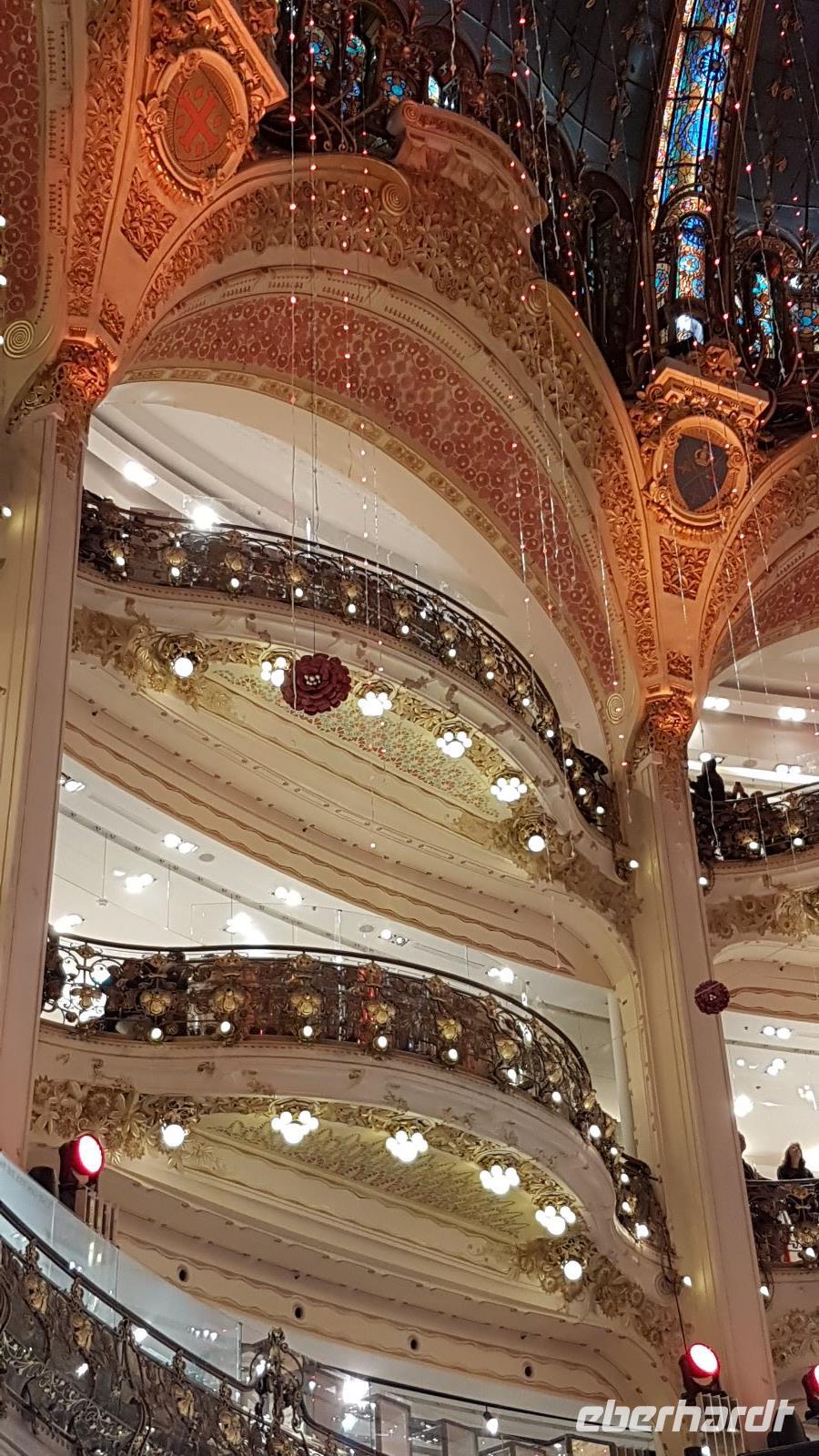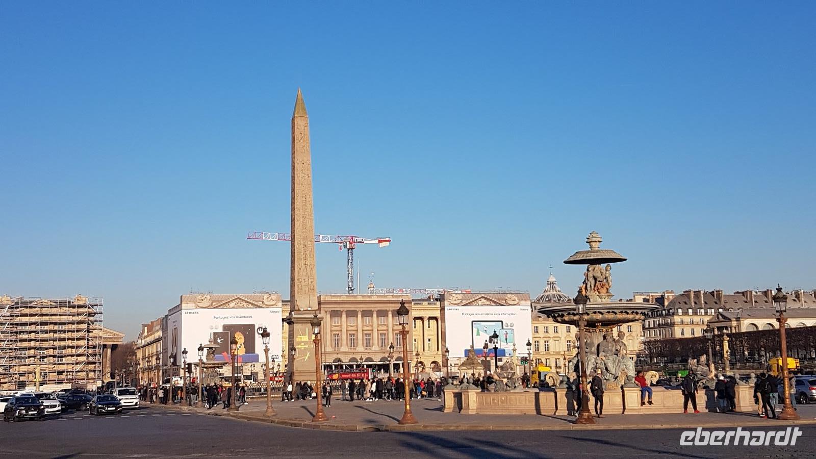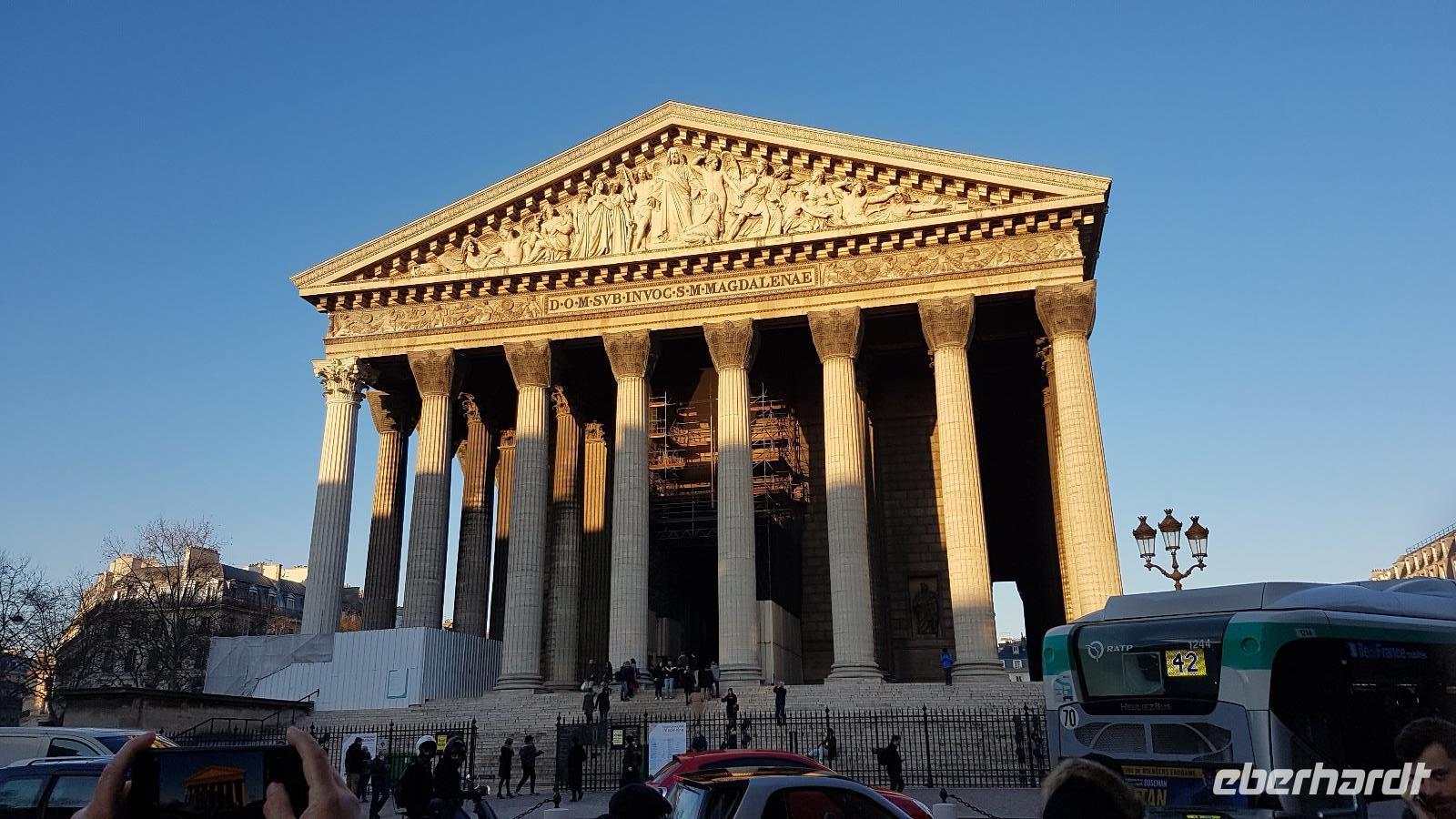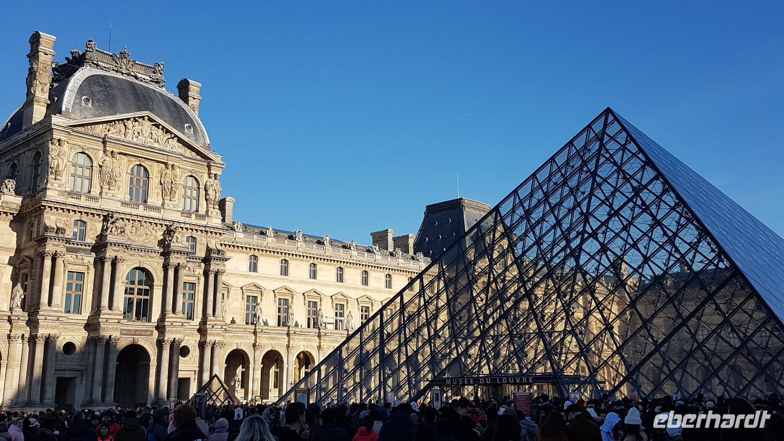 Unser Termin für die Besichtigung für den Louvre ist um 11 Uhr, durch unsere Karten ist der Eingang reibungslos. Es gibt 3 Stunden individuelle Entdeckungen in diesem Riesenmuseum mit so vielen Meisterwerken der Weltkultur (Mona Lisa, die Venus von Milo, die Nike von Samothrake, das Gemälde "Die Freiheit führt das Volk" von Delacroix, und so viele andere...). Nach all diesen Eindrücken wollen wir die "Metro" (Pariser U-Bahn) nehmen. Es gibt zwar schon seit 3 Wochen Bahn- und Metrostreik, aber Gott sei Dank sind 2 Metrolinien (von 14) automatisiert und fahren planmäßig. Wir erreichen ziemlich schnell und ohne Mühe den "Arc de Triomphe" (Triumphbogen), ein Vorhaben von Kaiser Napoleon I., das auch ein Wahrzeichen von Paris geworden ist. Nach einer kleinen Promenade auf den Champs Elysées, wo wir auch das berühmte Revuetheater Lido sehen, nehmen wir wieder die Metro bis zum Place de la Concorde, mit dem ägyptischen Obelisk. Von dort kann man nicht nur den Tuileries-Garten sehen, sondern auch die Brücke Alexander III., nach dem russischen Zaren genannt, und die "Assemblée Nationale" (Parlament). Jetzt geht es wieder los zu Fuß Richtung Madeleine, eine tempelartige Kirche, um eine kleine Pause am Place de la Madeleine bei dem berühmten Feinschmeckergeschäft Fauchon zu machen. Wir sitzen bequem bei Köstlichkeiten im ersten Stock und können sogar durch ein Fenster die Konditoren bei ihrer Arbeit beobachten. Danach drehen wir auch eine Runde im benachbarten Fauchon Champagnegeschäft, bevor wir die schönen Glasfenster mit Automaten der "Grands Magasins" bewundern. Wir können auch den tollen Weihnachtsbaum des Kaufhauses "Galeries Lafayette" sehen, mit der wunderbaren geschmückten Kuppel. Die Garnier-Oper ist danach auf dem Programm, und der schöne Place Vendôme mit den vielen Juweliergeschäften. Die Metro führt uns danach weiter zum Place de la Bastille, wo die Französische Revolution am 14. Juli 1789 durch die Eroberung der dortigen Gefängnis-Festung begonnen hatte. Jetzt stehen dort die neue Oper und die Juli-Säule. Wir schauen uns danach ein bisschen das Marais-Viertel an, mit dem wunderschönen Place des Vosges, unter König Henri IV im Renaissance-Stil errichtet, aus grauem Stein und rotem Backstein.