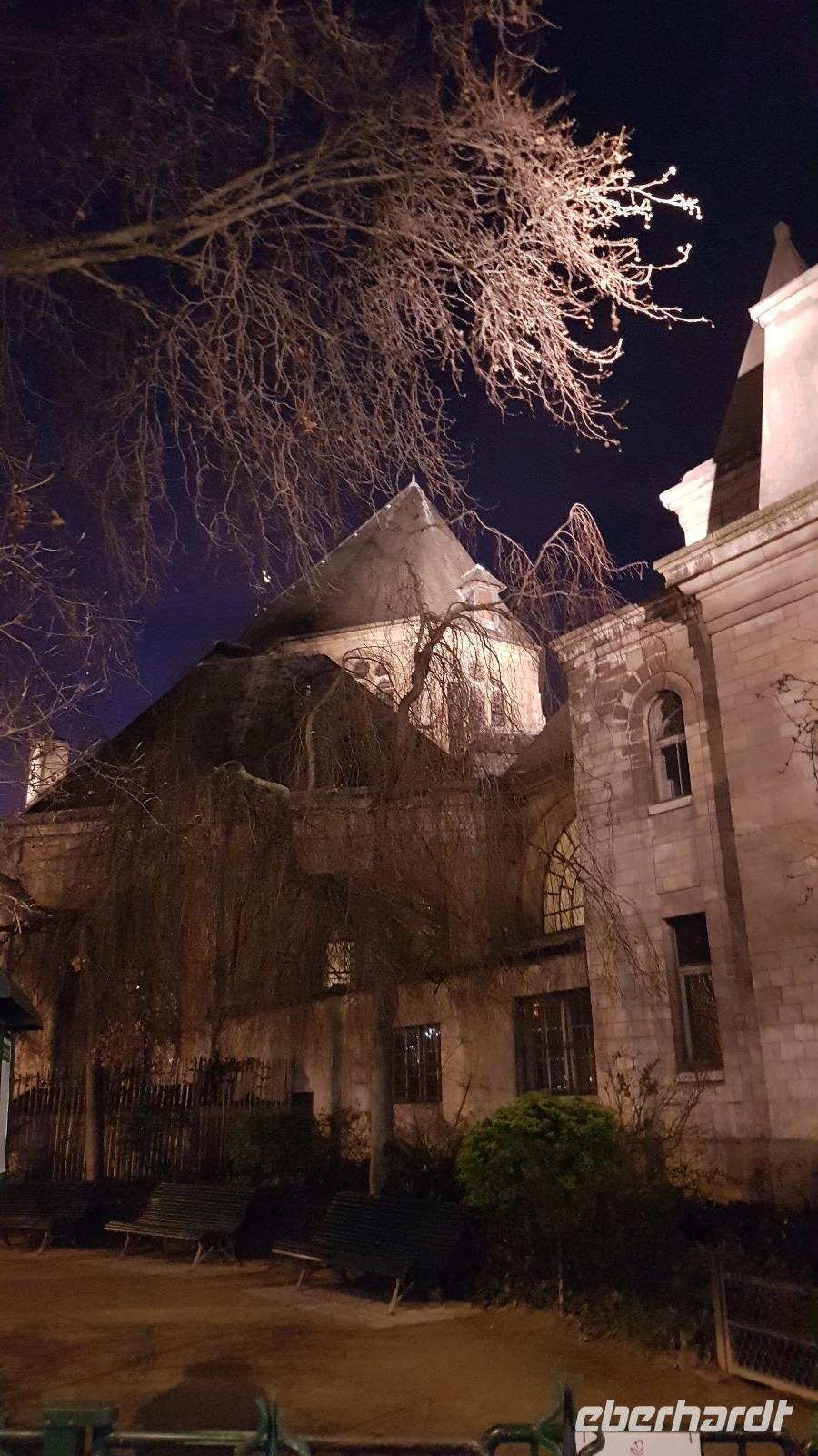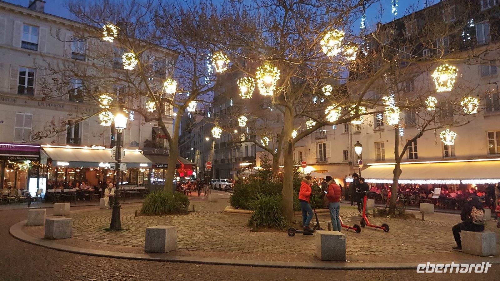 Anschließend laufen wir durch die belebte Rue Mouffetard, mit Restaurants aus vielen Ecken der Welt. Wir sehen auf dem Weg die schöne beleuchtete Place de la Contrescarpe, bevor wir die Kirche Saint-Médard erreichen. Dann ist es Zeit zum Abendessen im Restaurant "Le Vin qui Danse" ("Der tanzende Wein"). Wir genießen dort leckere klassische Gerichte, aber auch zum Beispiel mit "Rougail Saucisse", eine Spezialität aus dem französischen Übersee-Gebiet "La Réunion", eine Insel im Indischen Ozean. Dann geht es zu Fuß zurück zum Hotel.