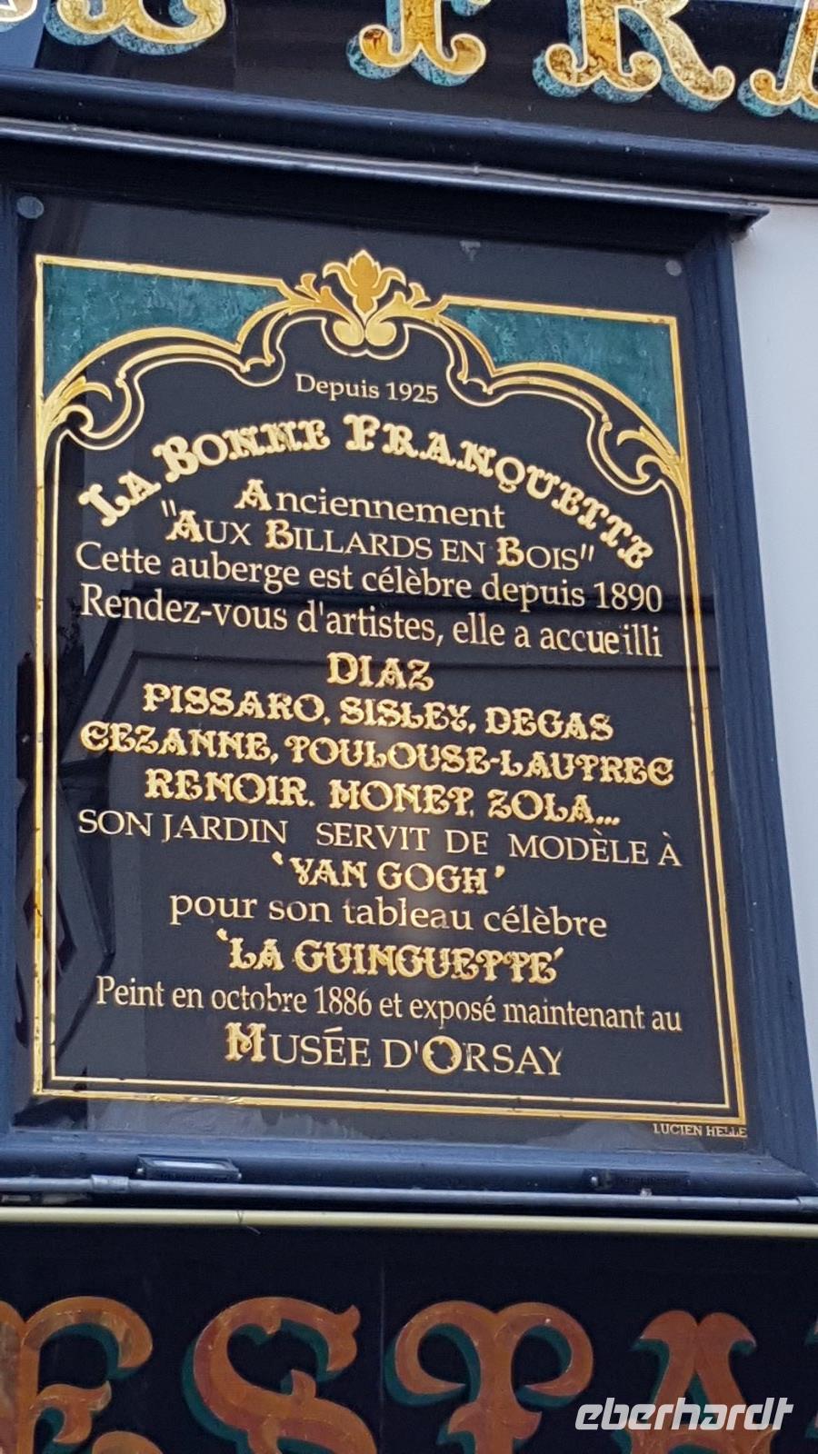 Danach sehen wir die Statue von dem Chevalier de la Barre, der im Jahr 1766 Opfer eines religiös motivierten Justizmordes wurde, und ursprünglich vom antiklerikalen Staat 1905 direkt vor dem Sacré Coeur errichtet wurde. Auf unserem Weg gibt es das historische Gasthaus "A La Bonne Franquette", wo man unter anderem die Maler Pissaro, Degas, Cézanne, Toulouse-Lautrec, Renoir und Monet treffen konnte...Unweit ist auch das jetzige Museum von Montmartre, wo u. a. Renoir und Suzanne Valadon gelebt haben. Diese starke Persönlichkeit war Modell für die berühmten Maler der Zeit und ist danach auch selbst eine anerkannte Malerin geworden. Ihr Sohn Maurice Utrillo (natürlich auch Maler) hat selbst im rosaroten Haus an der Ecke gewohnt. Aber schon ist der (sehr kleine!) Weinberg von Montmartre in Sicht. Daraus wird tatsächlich Rotwein produziert, die Qualität hat sich mittlerweile verbessert und es gibt sogar ein Weinfest im Oktober. Wir sehen dann die Büste der Sängerin Dalida, die in der Nähe gelebt hat, und den Brunnen in dem sich der heilige Dionysius seinen Kopf gewaschen hätte. Eine Statue des "Passe-Muraille" (Der durch die Wand geht) erinnert an die Novelle des Schriftstellers Marcel Aymé, der auch in Montmartre gelebt hat. Dann gibt es die berühmte "Moulin de la Galette", wo die Künstler sich beim Weintrinken und Vergnügung trafen. Wir nehmen danach die rue Lepic, mit dem "Café des deux Moulins" aus dem Film "Die fabelhafte Welt der Amelie". Schon sind wir vor dem Kabarett "Moulin Rouge", und nach Pigalle mit einer hohen Dichte von Sex-Shops fahren wir zum Musée d´Orsay. Es gibt doch wie üblich eine Riesenschlange, aber Dank des kooperativen Geistes des Personals können wir sofort hinein.