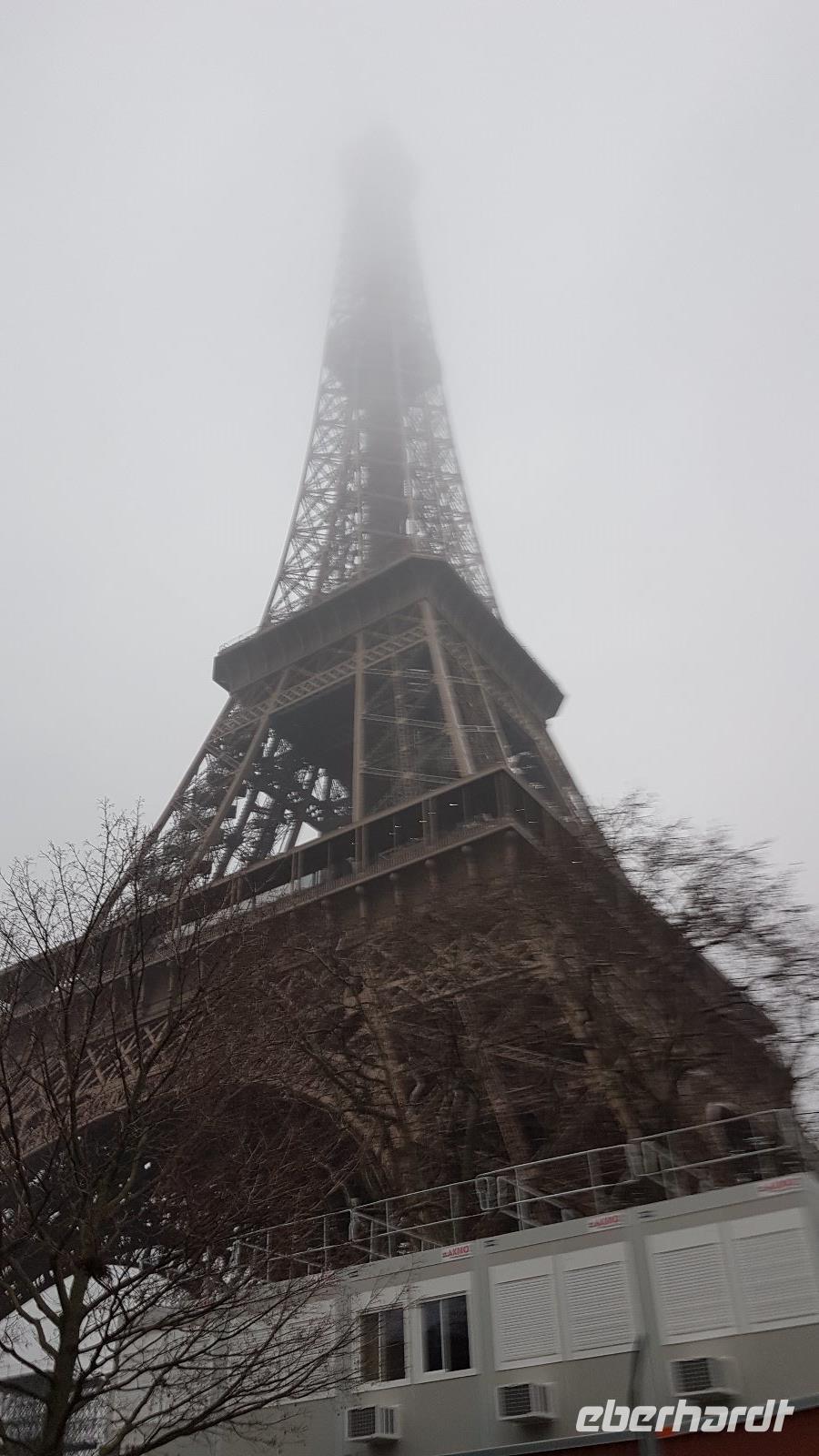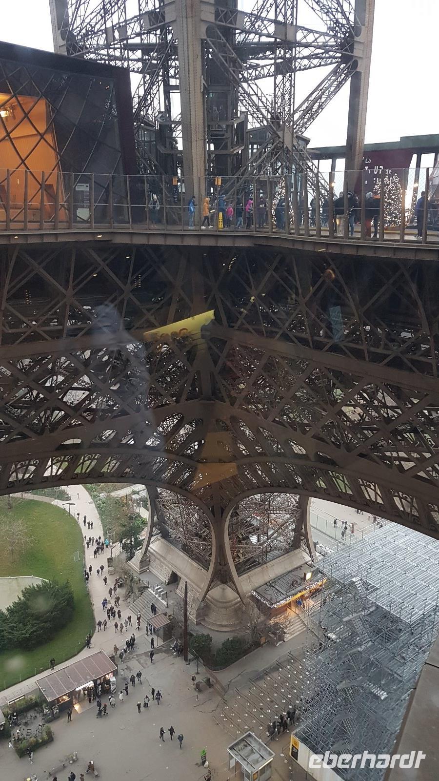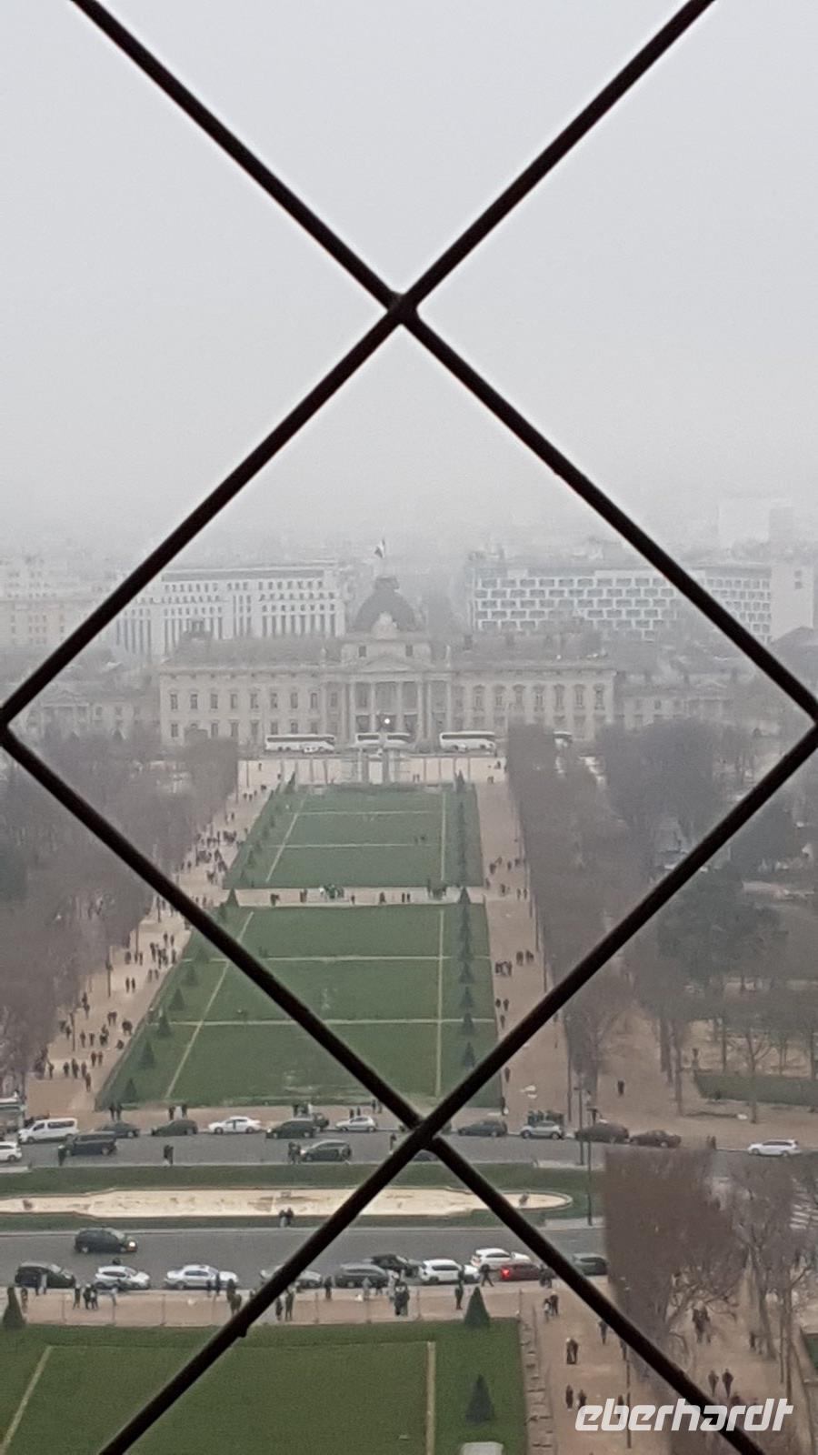 Dann fahren wir mit dem Stadtbus Richtung Eiffelturm, wir nehmen dort wieder einen Lift, der uns zum 2. Stock führt. Die Sicht ist zwar begrenzt, aber man kann sehr gut das "Palais de Chaillot" (Weltausstellung 1937), die "Ecole Militaire" und sogar den Invalidendom erkennen. Im 1. Stock gibt es sehr interessante Informationen über das Bauwerk, ursprünglich nur als provisorisches Ausstellungsstück im Rahmen der Weltausstellung 1889 gedacht. Inzwischen ist der "Tour Eiffel" ein Wahrzeichen von Paris geworden und von der Stadtlandschaft nicht wegzudenken. . .