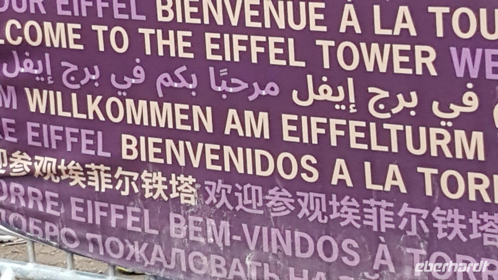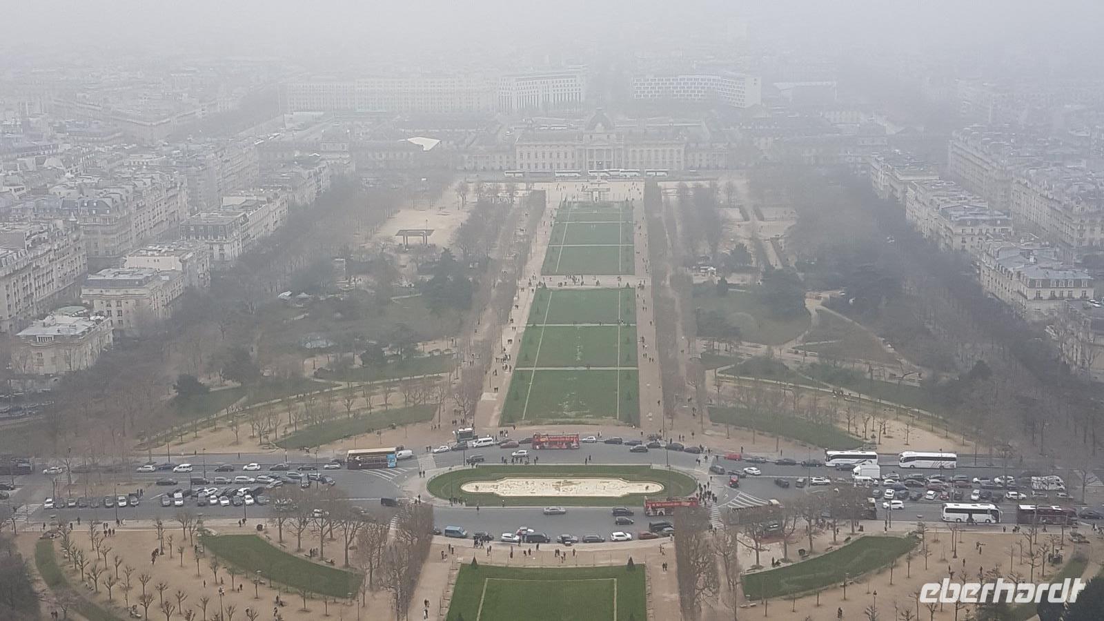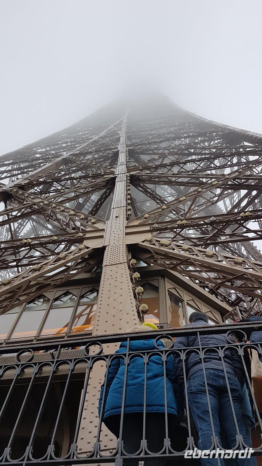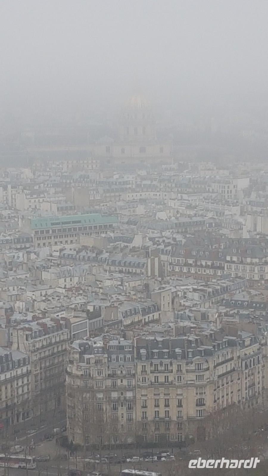 Dann fahren wir mit dem Stadtbus Richtung Eiffelturm, wir nehmen dort wieder einen Lift, der uns zum 2. Stock führt. Die Sicht ist zwar begrenzt, aber man kann sehr gut das "Palais de Chaillot" (Weltausstellung 1937), die "Ecole Militaire" und sogar den Invalidendom erkennen. Im 1. Stock gibt es sehr interessante Informationen über das Bauwerk, ursprünglich nur als provisorisches Ausstellungsstück im Rahmen der Weltausstellung 1889 gedacht. Inzwischen ist der "Tour Eiffel" ein Wahrzeichen von Paris geworden und von der Stadtlandschaft nicht wegzudenken. . .