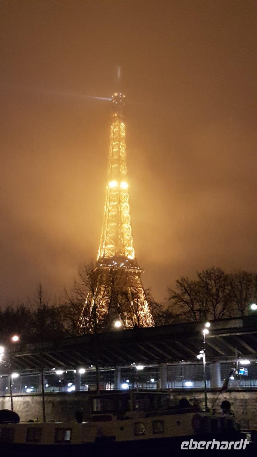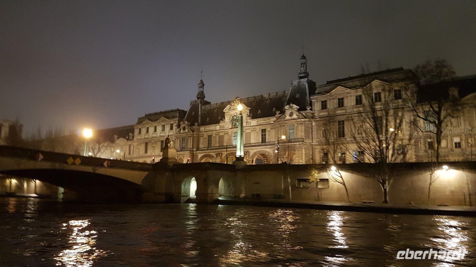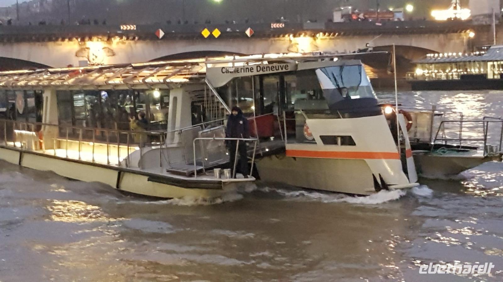 Wir werden im Hotel abgeholt und zu den Bateaux Parisiens am Eiffelturm gebracht. Leider kann wegen Hochwasser die übliche Kreuzfahrt durch das Zentrum von Paris nicht gefahren werden, sie wird stattdessen westlich der Stadt stattfinden. Wir bekommen als Entschädigung einen Gutschein (1 Jahr gültig) für eine Kreuzfahrt mit einem kleineren, tiefer gelegeneren Schiff, das die Brücken Richtung Paris passieren kann.