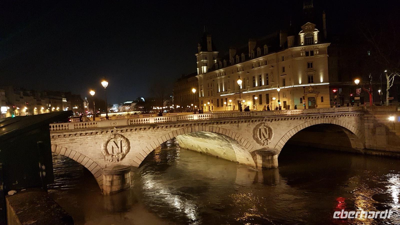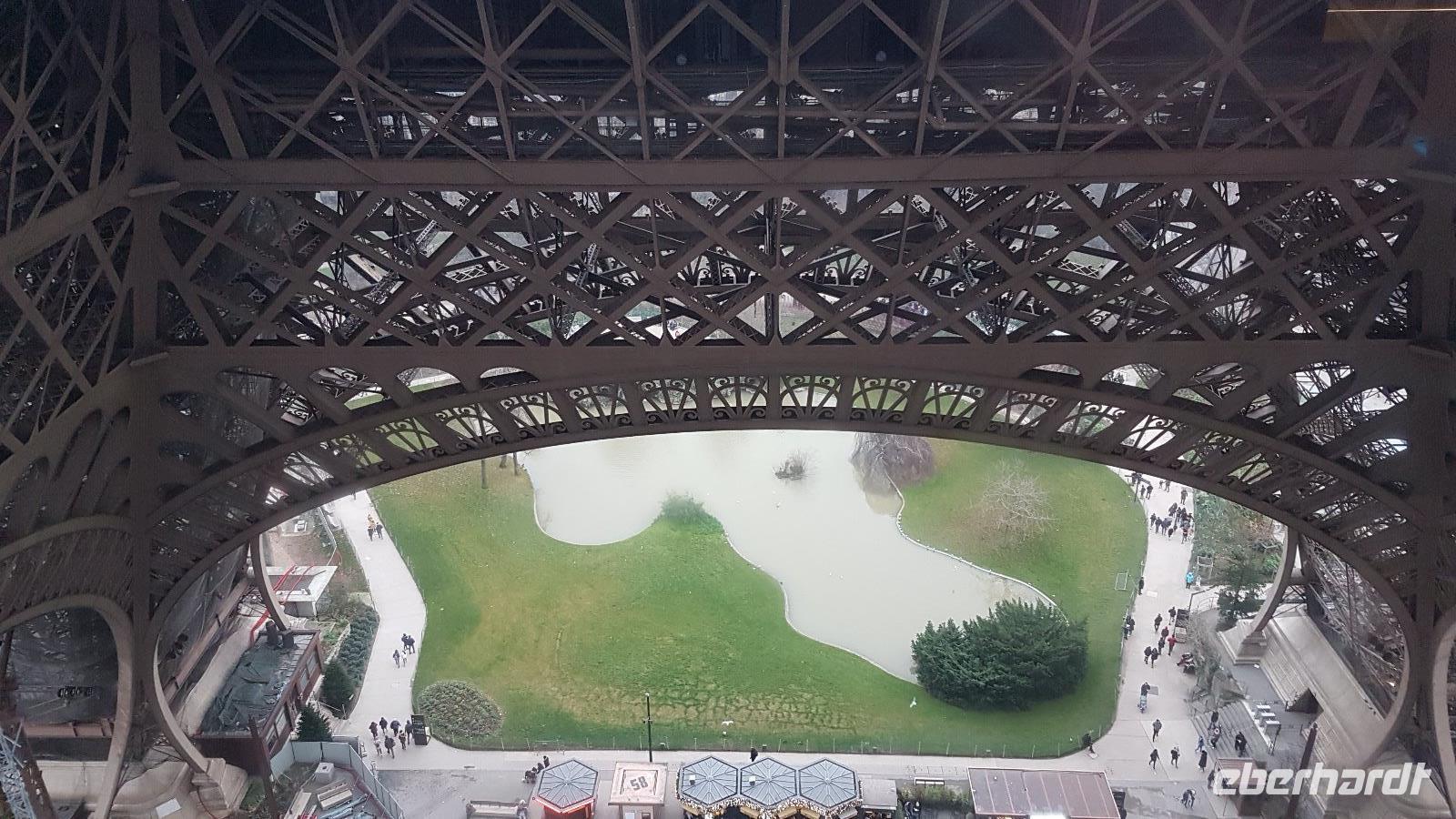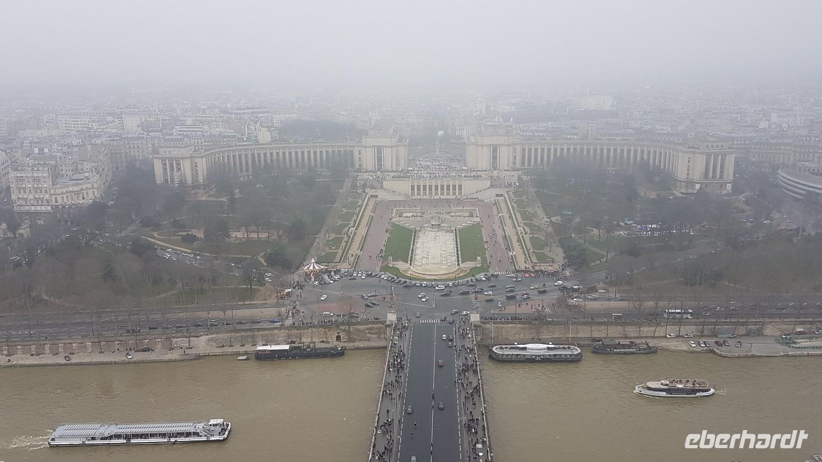 Wir werden im Hotel abgeholt und zu den Bateaux Parisiens am Eiffelturm gebracht. Leider kann wegen Hochwasser die übliche Kreuzfahrt durch das Zentrum von Paris nicht gefahren werden, sie wird stattdessen westlich der Stadt stattfinden. Wir bekommen als Entschädigung einen Gutschein (1 Jahr gültig) für eine Kreuzfahrt mit einem kleineren, tiefer gelegeneren Schiff, das die Brücken Richtung Paris passieren kann.
