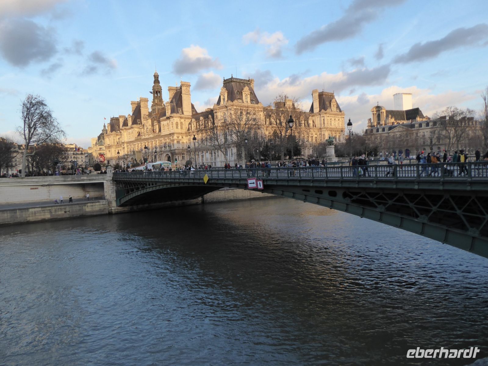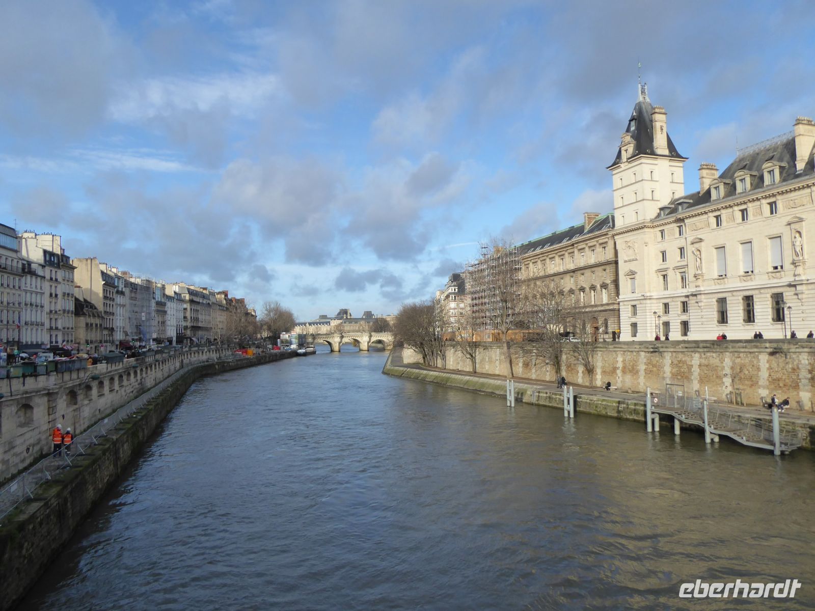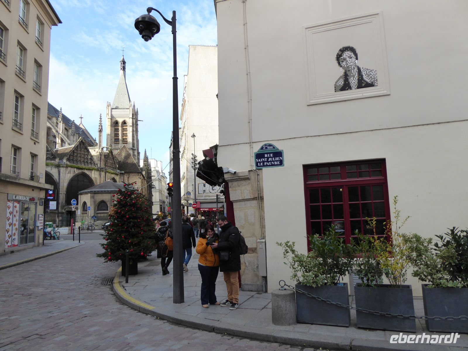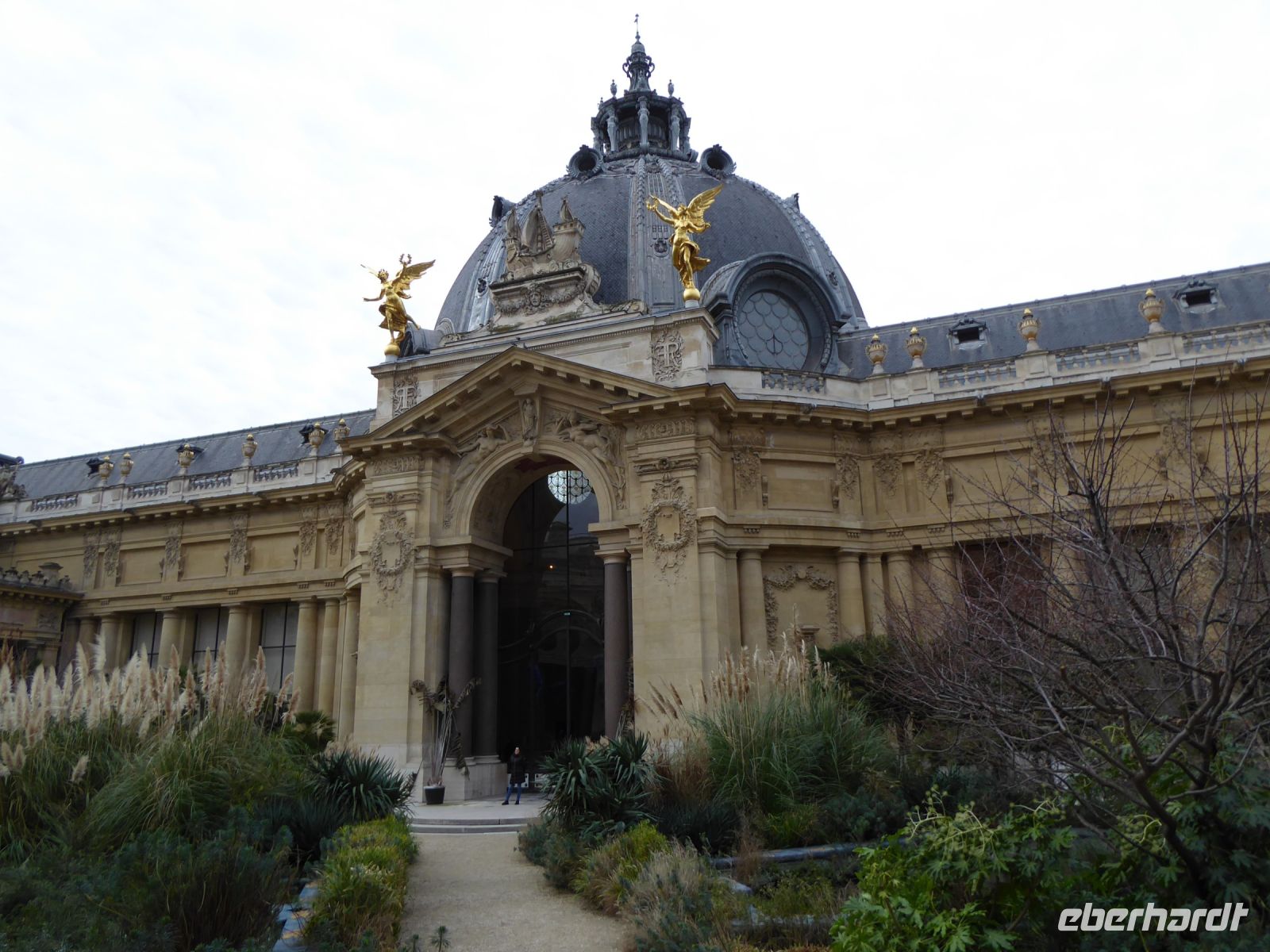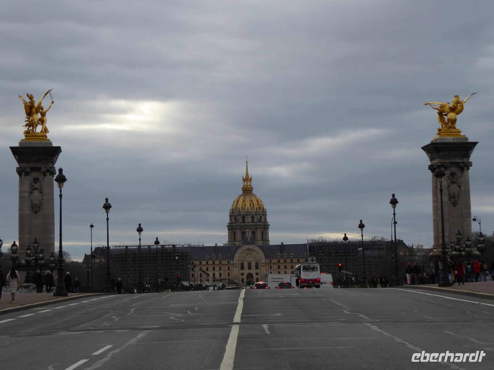 Mit Temperaturen im unteren zweistelligen Bereich war uns das Wetter hold und so begannen wir unseren Besichtigungsrundgang wieder am Boulevard St. Michel, bewunderten die vielen kleinen gepflegten Parkanlagen unterwegs und kamen schließlich wieder an die Seine. Heute Morgen war es noch ruhig an den zu anderen Tageszeiten Menschen überfluteten Plätzen auf der Île de la Cité. Wir ließen die Blicke schweifen und entdeckten dabei auch immer wieder die kleinen witzigen Kunstwerke der Streetart Künstler. Paris ist eine Stadt der Kunst. Überall begegnen dem aufmerksamen Betrachter große und kleine Kunstobjekte aus allen Zeiten. In der Concièrgerie, dem Herzstück des mittelalterlichen Paris, richtete Hugo Capet die königliche Verwaltung ein. Ein Fenster in das Kellergeschoss des gewaltigen Gebäudes gestattete uns einen Blick auf den großen gotischen Festsaal der Palastwachen. Nach der französischen Revolution wurde der mittelalterliche Königspalast umfunktioniert: Er wurde zum Revolutionstribunal und Gefängnis, unter anderem für Marie Antoinette. In der sich gleichwohl in diesem Gebäudekomplex befindlichen Kapelle St. Chapelle, einer der schönsten gotischen Kirchen, gebaut um die von Ludwig IX nach Paris verbrachten Christus Reliquien zu bergen, betete Marie Antoinette den letzten Rosenkranz, bevor sie im Oktober 1793 zur Guillotine auf der Place de la Concorde geführt wurde. Über die Brücke der Geldwechsler, Pont au Change, gelangten wir auf das rechte Ufer der Seine, Rive Droite und überquerten die belebte Place du Châtelet. Dort, wo im Mittelalter zwei Befestigungen die Brücke über die Seine sicherten, stehen heute zwei imposante Theatergebäude. Ein goldener Friedensengel segnet hoch über den Köpfen die durcheilenden Massen. Mit dem Bus gelangen wir schnell entlang der Rue Rivoli über die Place de la Concorde zur Brücke Pont Alexandre III. Von dort hat man den schönsten Blick auf den Invalidendom, in dem sich das Grabmal Napoleons befindet: ein Muss für einen ersten Besuch in Paris, wie auch der Blick auf den Eiffelturm mit der Seine im Vordergrund. Im Petit Palais ließen wir uns von den großformatigen Ölgemälden in die nicht immer so gloriose Vergangenheit der Stadt Paris entführen. Die Bilder zeigen das einfache, ja armselige Leben der Wäscherinnen, der Marktleute, Arbeiter und Schausteller am Ende des 19. Jahrhunderts sowie Szenen aus dem bürgerlichen Leben der sogenannten Belle Époche. Hier befindet sich auch das Modell der Bronzestatue des französischen Bildhauers Louis-Ernest Barrias, La Défense, die Verteidigung, die dem modernen Geschäfts- und Hochhausviertel von Paris seinen Namen gab. Lange bevor das Viertel, am Rand von Paris gelegen, ein Mekka aktueller Hochhausarchitektur und Kunst wurde, stand hier diese Skulptur, die zu Ehren der Verteidigung der Stadt Paris nach dem Französisch – Deutschen Krieg 1870/71 errichtet wurde. Mit der Metrolinie 1, die in La Défense endet, kamen wir schnell an unser Ziel: La Grande Arche, der große Bogen, in La Défense. Das Gebäude aus dem Jahr 1989 ist ein Meisterwerk des dänischen Architekten Johan Otto von Spreckelsen, der mit der Neuinterpretation eines Triumphbogen die historische Achse in der Ära Mitterand vollendet hat. Verlockt durch ein günstiges Angebot entschieden wir uns die Stadt von oben anzuschauen und fuhren bequem mit dem Aufzug auf die wahrlich luftige Höhe von knapp 111 Metern nach oben zur Aussichtsplattform. Ganz Paris lag uns so am letzten Tag des Jahres zu Füßen!