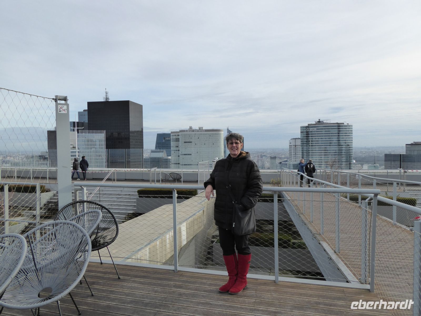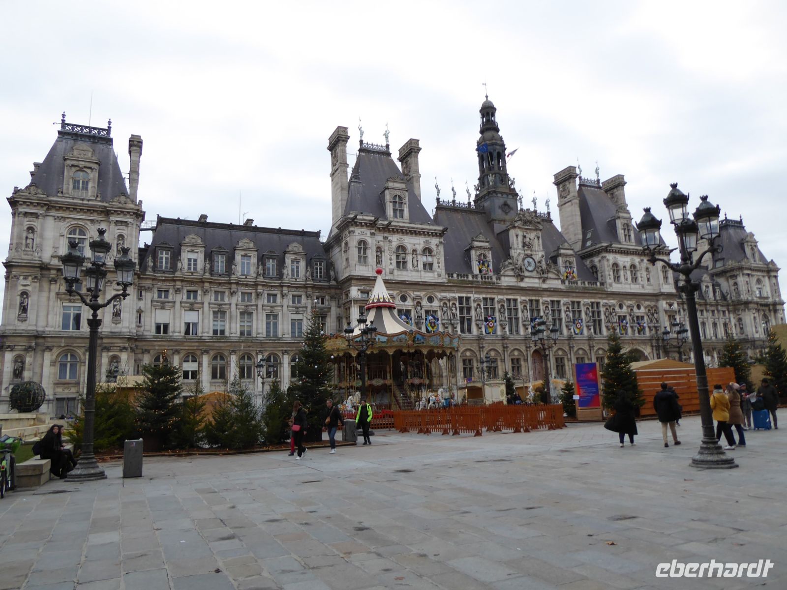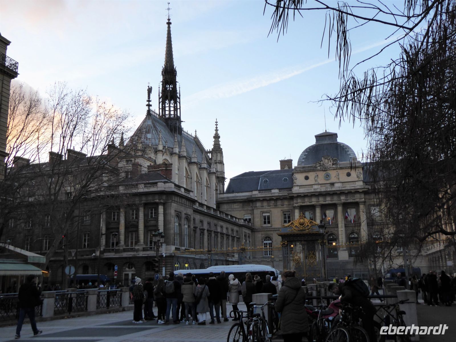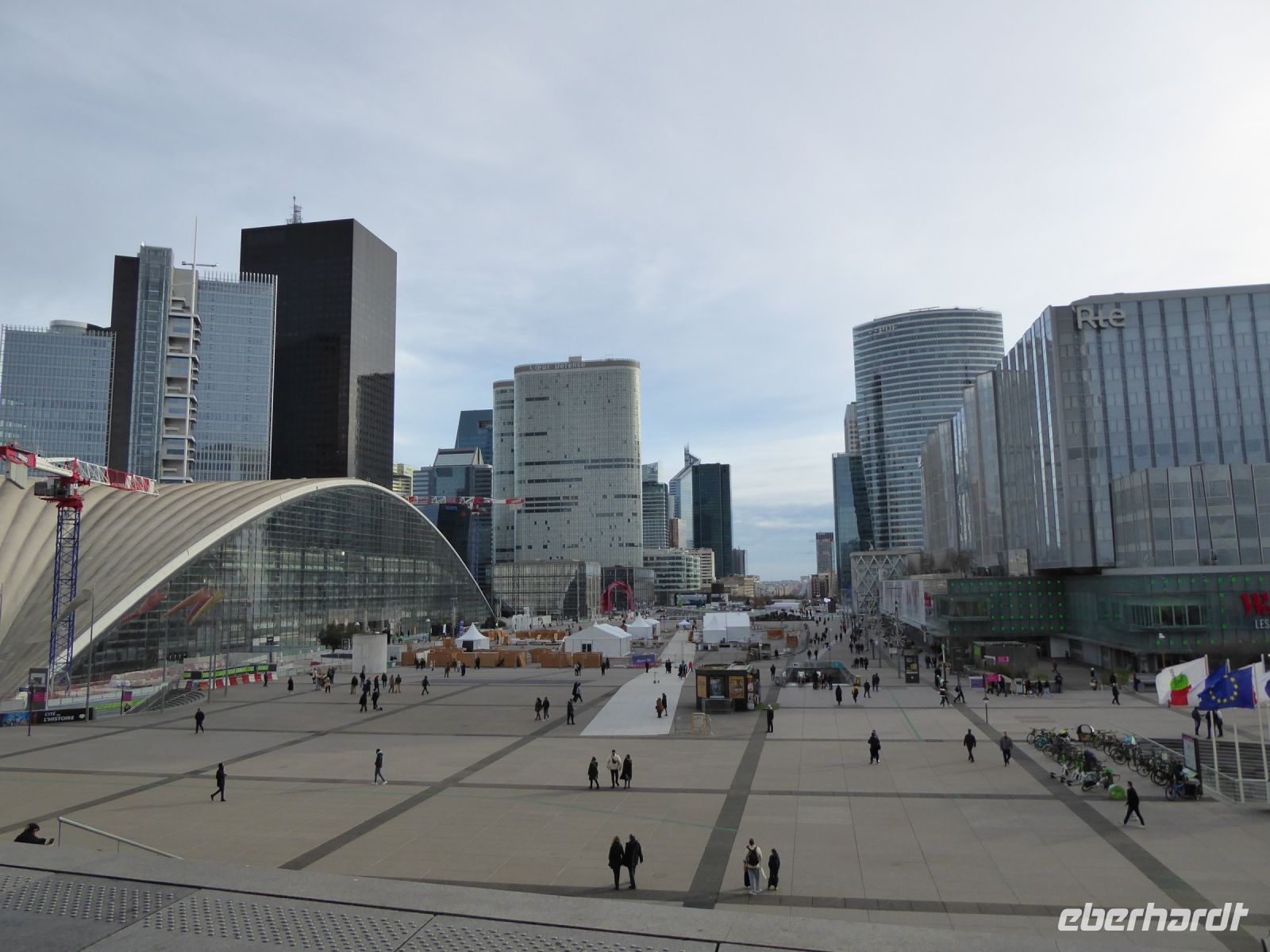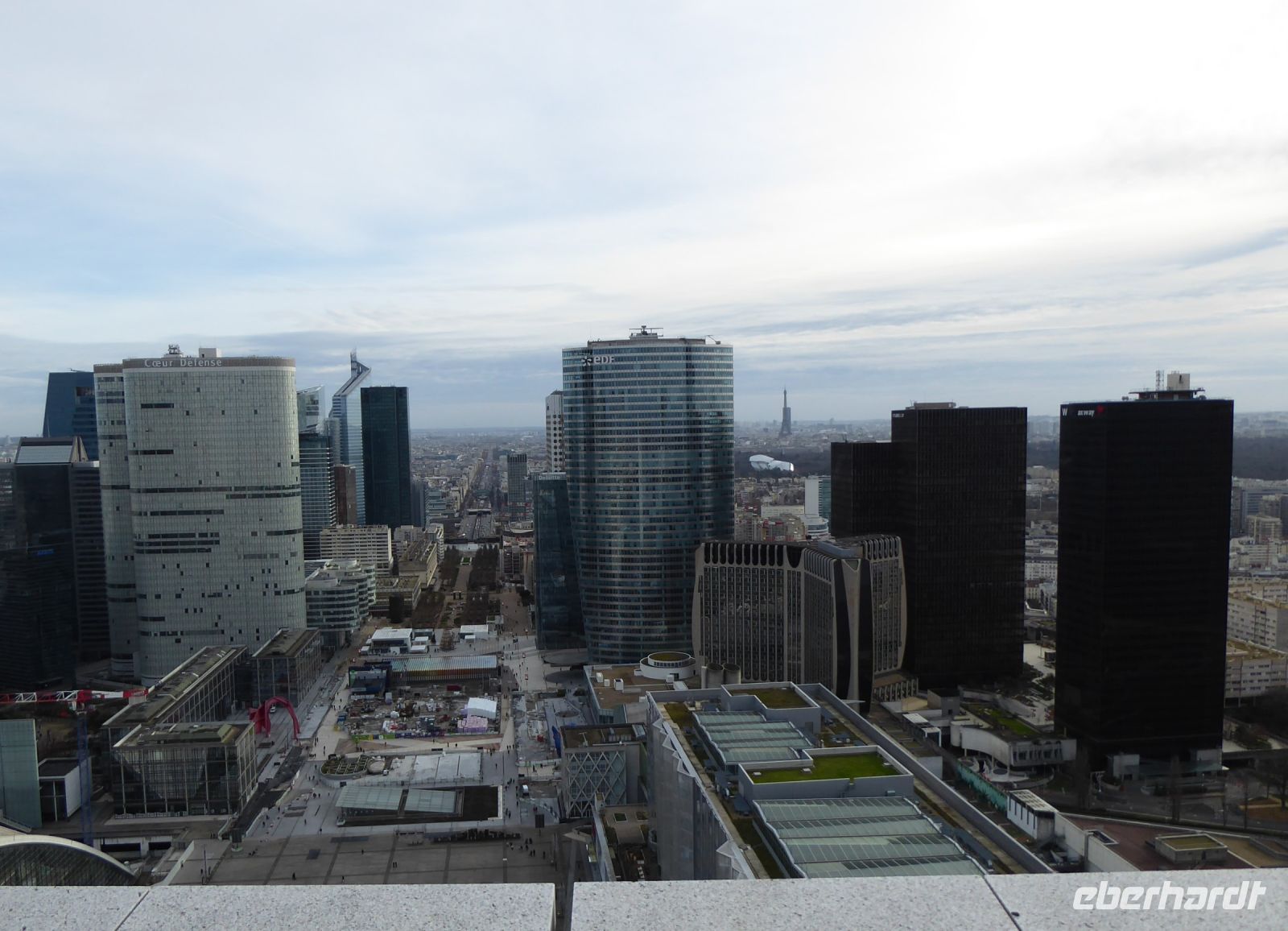 Mit Temperaturen im unteren zweistelligen Bereich war uns das Wetter hold und so begannen wir unseren Besichtigungsrundgang wieder am Boulevard St. Michel, bewunderten die vielen kleinen gepflegten Parkanlagen unterwegs und kamen schließlich wieder an die Seine. Heute Morgen war es noch ruhig an den zu anderen Tageszeiten Menschen überfluteten Plätzen auf der Île de la Cité. Wir ließen die Blicke schweifen und entdeckten dabei auch immer wieder die kleinen witzigen Kunstwerke der Streetart Künstler. Paris ist eine Stadt der Kunst. Überall begegnen dem aufmerksamen Betrachter große und kleine Kunstobjekte aus allen Zeiten. In der Concièrgerie, dem Herzstück des mittelalterlichen Paris, richtete Hugo Capet die königliche Verwaltung ein. Ein Fenster in das Kellergeschoss des gewaltigen Gebäudes gestattete uns einen Blick auf den großen gotischen Festsaal der Palastwachen. Nach der französischen Revolution wurde der mittelalterliche Königspalast umfunktioniert: Er wurde zum Revolutionstribunal und Gefängnis, unter anderem für Marie Antoinette. In der sich gleichwohl in diesem Gebäudekomplex befindlichen Kapelle St. Chapelle, einer der schönsten gotischen Kirchen, gebaut um die von Ludwig IX nach Paris verbrachten Christus Reliquien zu bergen, betete Marie Antoinette den letzten Rosenkranz, bevor sie im Oktober 1793 zur Guillotine auf der Place de la Concorde geführt wurde. Über die Brücke der Geldwechsler, Pont au Change, gelangten wir auf das rechte Ufer der Seine, Rive Droite und überquerten die belebte Place du Châtelet. Dort, wo im Mittelalter zwei Befestigungen die Brücke über die Seine sicherten, stehen heute zwei imposante Theatergebäude. Ein goldener Friedensengel segnet hoch über den Köpfen die durcheilenden Massen. Mit dem Bus gelangen wir schnell entlang der Rue Rivoli über die Place de la Concorde zur Brücke Pont Alexandre III. Von dort hat man den schönsten Blick auf den Invalidendom, in dem sich das Grabmal Napoleons befindet: ein Muss für einen ersten Besuch in Paris, wie auch der Blick auf den Eiffelturm mit der Seine im Vordergrund. Im Petit Palais ließen wir uns von den großformatigen Ölgemälden in die nicht immer so gloriose Vergangenheit der Stadt Paris entführen. Die Bilder zeigen das einfache, ja armselige Leben der Wäscherinnen, der Marktleute, Arbeiter und Schausteller am Ende des 19. Jahrhunderts sowie Szenen aus dem bürgerlichen Leben der sogenannten Belle Époche. Hier befindet sich auch das Modell der Bronzestatue des französischen Bildhauers Louis-Ernest Barrias, La Défense, die Verteidigung, die dem modernen Geschäfts- und Hochhausviertel von Paris seinen Namen gab. Lange bevor das Viertel, am Rand von Paris gelegen, ein Mekka aktueller Hochhausarchitektur und Kunst wurde, stand hier diese Skulptur, die zu Ehren der Verteidigung der Stadt Paris nach dem Französisch – Deutschen Krieg 1870/71 errichtet wurde. Mit der Metrolinie 1, die in La Défense endet, kamen wir schnell an unser Ziel: La Grande Arche, der große Bogen, in La Défense. Das Gebäude aus dem Jahr 1989 ist ein Meisterwerk des dänischen Architekten Johan Otto von Spreckelsen, der mit der Neuinterpretation eines Triumphbogen die historische Achse in der Ära Mitterand vollendet hat. Verlockt durch ein günstiges Angebot entschieden wir uns die Stadt von oben anzuschauen und fuhren bequem mit dem Aufzug auf die wahrlich luftige Höhe von knapp 111 Metern nach oben zur Aussichtsplattform. Ganz Paris lag uns so am letzten Tag des Jahres zu Füßen!