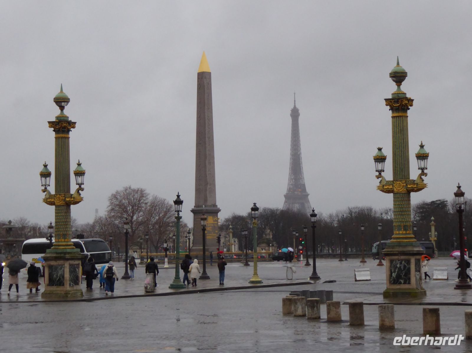 Nach einem für französische Verhältnisse sehr reichhaltigen Frühstück trafen wir uns alle zusammen in der gemütlichen Lobby des Hotels zu einer kleinen Vorstellungsrunde. Es stellte sich heraus, dass es für die Reiseteilnehmer, außer für unsere Gästin aus dem Saarland, der erste Besuch in der Weltmetropole Paris war. Ausgestattet mit den wichtigsten Informationen, einem gut lesbaren Métro Plan und unseren Eintrittskarten, starteten wir zu unserer ersten Stadterkundung mit der Métro. Mit der Linie 4 fuhren wir bis zur Station Châtelet, wo sich fünf Métrolinien kreuzen und man Anschluss an drei RER Linien hat. Tagtäglich kommen hier 40.000 Menschen durch- glücklicherweise ist es zu dieser Vormittagsstunde noch sehr ruhig. Wir wählen die Linie eins und fahren weiter bis zur Place de la Concorde. Mit einer Fläche von fast 70.000 m² ist dieser Platz der zweitgrößte Platz in Frankreich. Er ist einer der fünf königlichen Plätze von Paris und befindet sich am unteren Ende der Tuileriengärten. Nach der französischen Revolution stand hier die Guillotine, unter deren Fallbeil 1345 Personen jeglichen Geschlechts, sozialen Standes und Herkunft hingerichtet wurden. Seit knapp 200 Jahren zieren ein Obelisk des Tempels von Luxor, der als Geschenk des ägyptischen Vizekönigs Mohammad Ali Paschas nach Paris kam sowie zwei gusseiserne Brunnen und zwanzig Kandelaber des Architekten Jakob Ignaz Hittdorff den Platz. Die Spitze des über 23 Meter hohen Monolithen aus dem Alten Ägypten krönt seit bald fünfundzwanzig Jahren ein Pyramidion aus vergoldeter Bronze. In fast jedem französischen Kinofilm wird dieser Platz in Szene gesetzt und im Star-Trek-Universum ist er sogar das Hauptquartier der Präsidentschaft der Vereinigten Föderation der Planeten. An seiner Westflanke beginnt die berühmte Prachtstraße Champs-Élysées.
