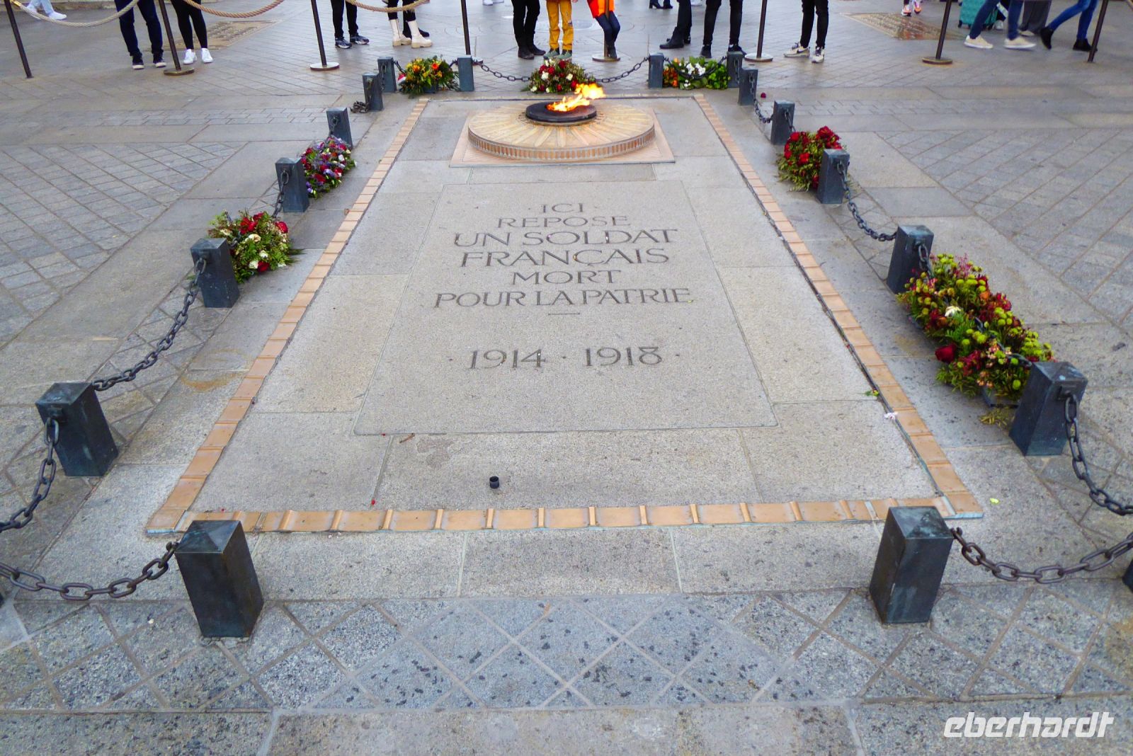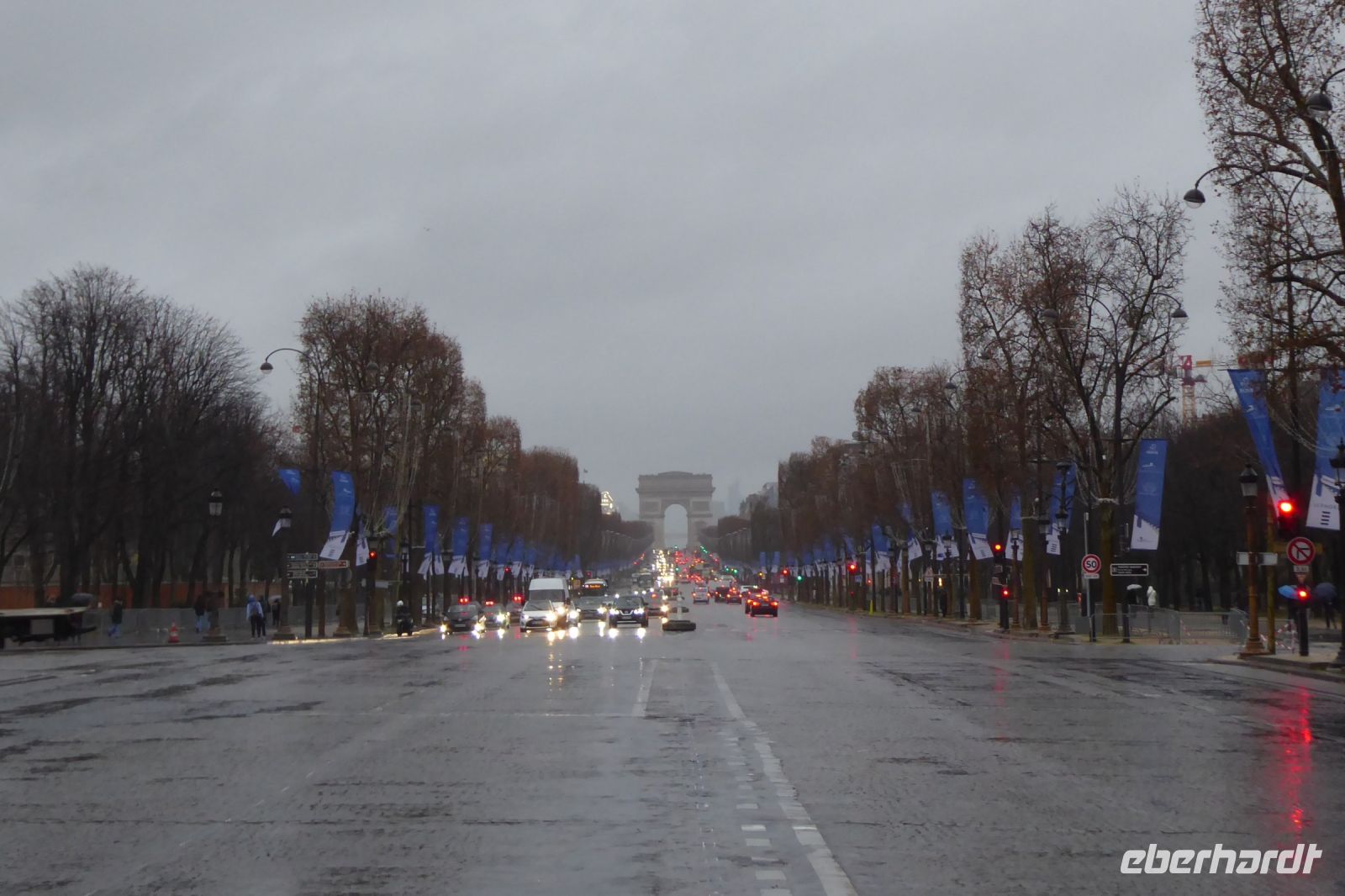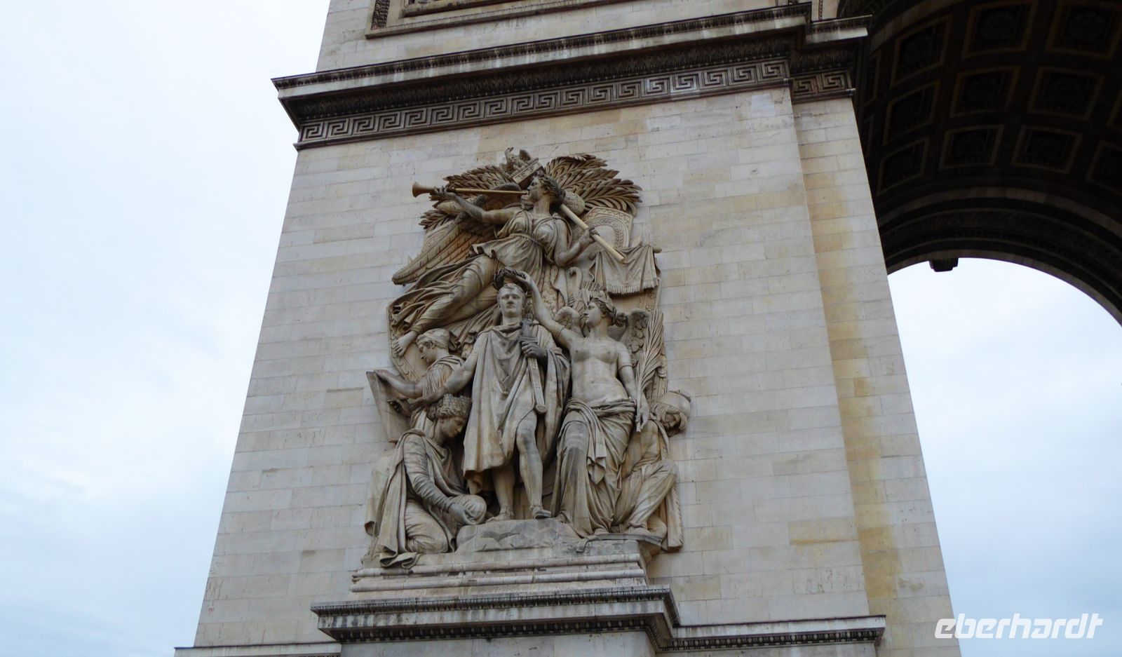Heute ließen wir unser Besichtigungsprogramm gemütlich angehen. Mit der Métro fuhren wir zum Arc de Triomphe. Die städtischen Straßenkehrer waren schon früh auf den Beinen, um die Stadt ihren Touristen im neuen Jahr picobello zu präsentieren. Von der gestrigen Silvesterfeier auf den Champs-Élysées mit einer Million Menschen und dem Feuerwerk war nichts mehr zu sehen. Der beste Standort für ein schönes Foto des Triumphbogens ist genau von der Mitte der Champs-Élysées und so stürzten auch wir uns auf der Jagd nach dem besten Bild in den rauschenden Verkehr. Für Fußgänger ist übrigens das Überqueren der Ringstraße um das Monument strengstens verboten. Eine Unterführung bringt sie gefahrlos in die Mitte des Platzes, an dem sternförmig zwölf große Avenuen zusammenkommen. Daher rührt der Namen des Platzes: Place d´ Ètoile, Sternenplatz; seit 1970 heißt der Platz offiziell 'Place Charles de Gaulle'. In seinem Zentrum steht der berühmte Arc de Triomphe, ein von 1806 bis 1836 errichtetes Denkmal zu Ehren der siegreichen Schlachten Napoleons. Das Monument ist auch ein Teil der historischen Achse von Paris. Von dem leicht erhöhten Ort sieht man auf der einen Seite über die Prachtstraße der Champs-Élysées, die Place de la Concorde mit dem Obelisken, bis zum Louvre und auf der anderen Seite über die Avenue de la Grande Armée zur Grande Arche in La Défense. Der Triumphbogen, pathetisch als „Altar des Vaterlandes“ bezeichnet, wurde zwar von Napoleon I in Auftrag gegeben, aber erst lange nach seinem Tod fertiggestellt. Seit 1921 befindet sich unter dem Bogen das Grabmal des unbekannten Soldaten aus dem Ersten Weltkrieg mit der ewigen Flamme im Gedenken an die nicht identifizierten Toten. An diesem Ort finden feierliche staatliche Zeremonien statt, häufig führen Festumzüge daran vorbei, Paraden beginnen oder enden dort und auch die jährlich stattfindende Tour de France findet hier ihren glanzvollen Höhepunkt.