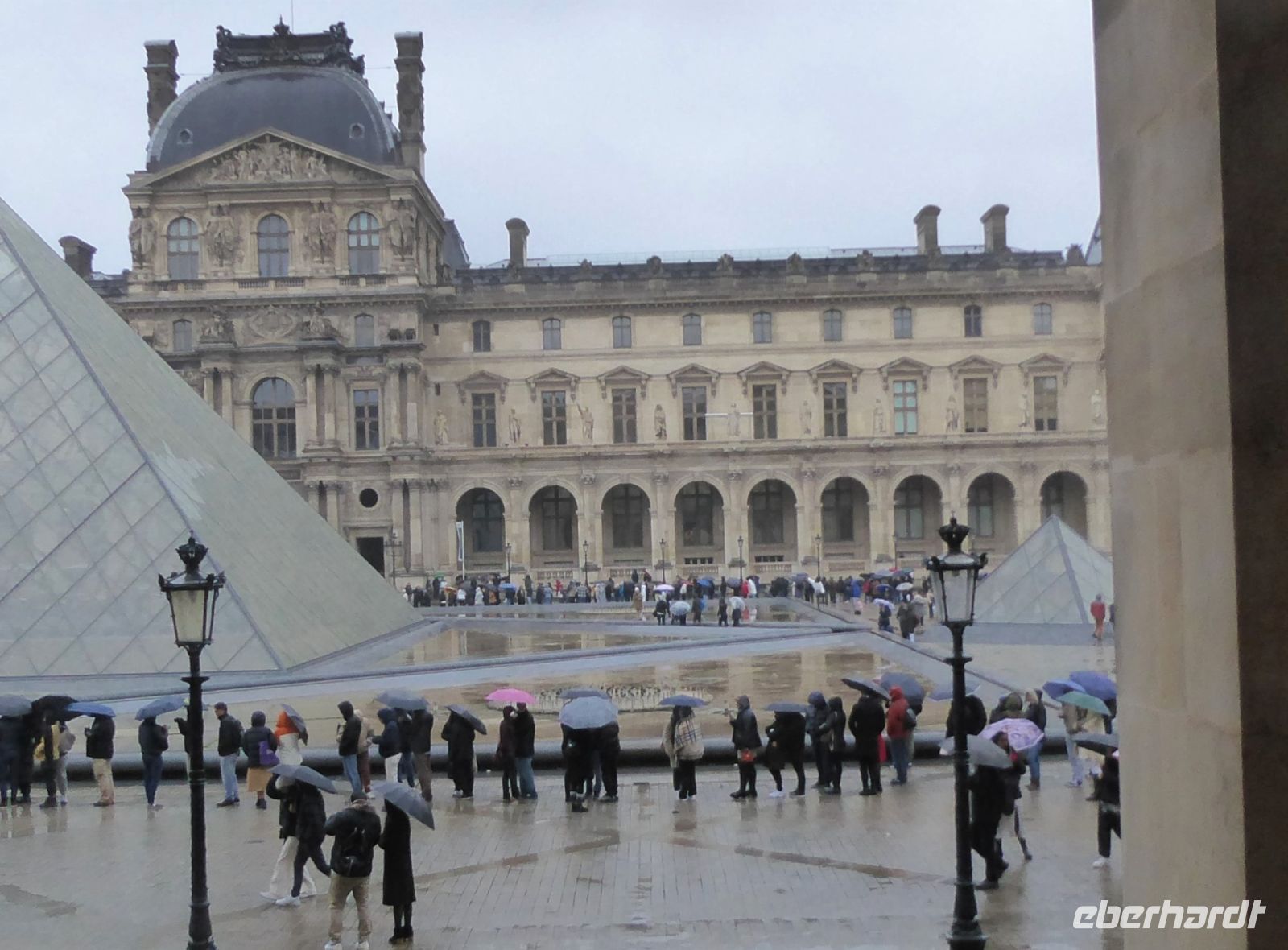 Leider regnete es mittlerweile in Strömen und so kürzten wir unseren Spaziergang ab. Triefend nass stiegen wir am Grand Palais wieder in die Métro, um auf dem schnellsten Weg zum Louvre zu gelangen. Vorbei an Heerscharen geduldig wartender Kulturbeflissener schlängelten wir uns direkt zum Einlass an der Sicherheitskontrolle, wo uns, wie durch Zauberhand, von einem freundlichen Mitarbeiter die Schranke geöffnet wurde. Pünktlich um elf Uhr starteten wir unseren Rundgang und gelangten zügig zur Hauptsehenswürdigkeit, für die die meisten Besucher lange Warteschlangen auf sich nehmen: La Joconda, die Mona Lisa von Leonardo da Vinci. Die Fülle der Ausstellungsstücke ist überwältigend - obzwar nur 10% der immensen Sammlungen ausgestellt sind - und so reichte die Zeit gerade mal, um sich einen Überblick zu verschaffen oder zu seinen Lieblingswerken zu eilen. Zur Mittagszeit trafen wir wieder zusammen und ergatterten einen Platz in einem kleinen Restaurant in der Nähe, wo wir, ganz landestypisch, zum Mittagsimbiss ein Glas Chablis genossen, der unsere Lebensgeister für die zweite Runde Kunst an diesem Tag wieder weckte. Da es nur noch leicht regnete, wählten wir den direkten Weg durch den Jardin des Tuileries und erreichten nach einem erfrischenden Spaziergang das Musée d' Orsay. In einem anlässlich der großen Weltausstellung der Jahrhundertwende errichteten Bahnhof befindet sich seit 1986 die weltweit einzigartige Sammlung französischer Impressionisten. Gemälde, Skulpturen, Grafiken und Fotografien, Entwürfe der Baukunst, ja sogar Möbel, alles aus der Zeit zwischen dem Beginn der zweiten Republik 1848 bis zum Beginn des Ersten Weltkriegs 1914 kann hier bewundert werden. Wo früher Reisende auf die Züge warteten, warten heute Skulpturen namhafte Künstler auf ihre Bewunderer. Gemeinsam entschieden wir uns, die Sonderausstellung einer großen Künstlerin des neunzehnten Jahrhunderts, Rosa Bonheur (1822-1899) zu besuchen. Mit einer kleinen Einführung in die interessante Biografie und das Werk der Malerin machten wir uns an die Betrachtung der Werke dieser interessanten Frau, die ein für ihre Zeit ungewöhnliches Leben führte, das sie öffentlich mit einer Frau teilte. Von der Pariser Polizei bekam sie 1857 eine Sondererlaubnis zum Tragen von Männerhosen mit Urkunde ausgestellt: „Erlaubnis zum Transvestismus“!