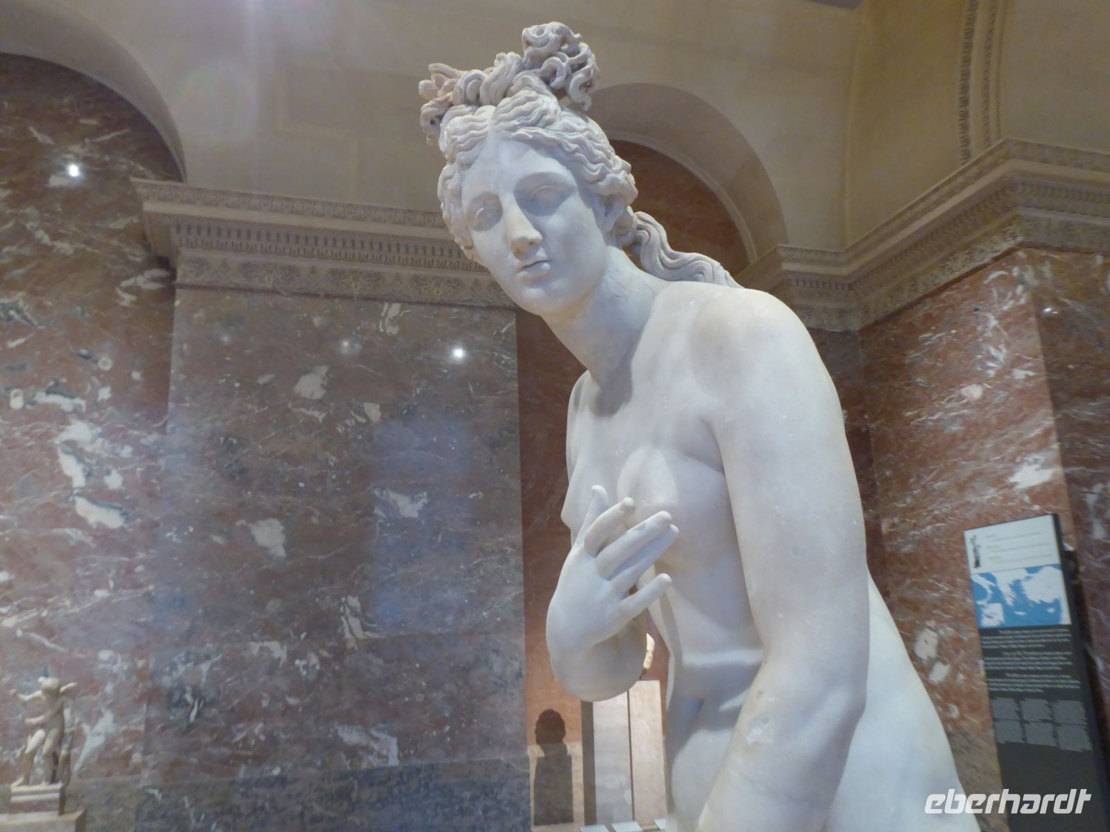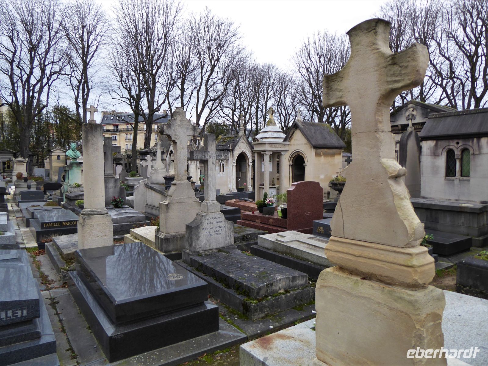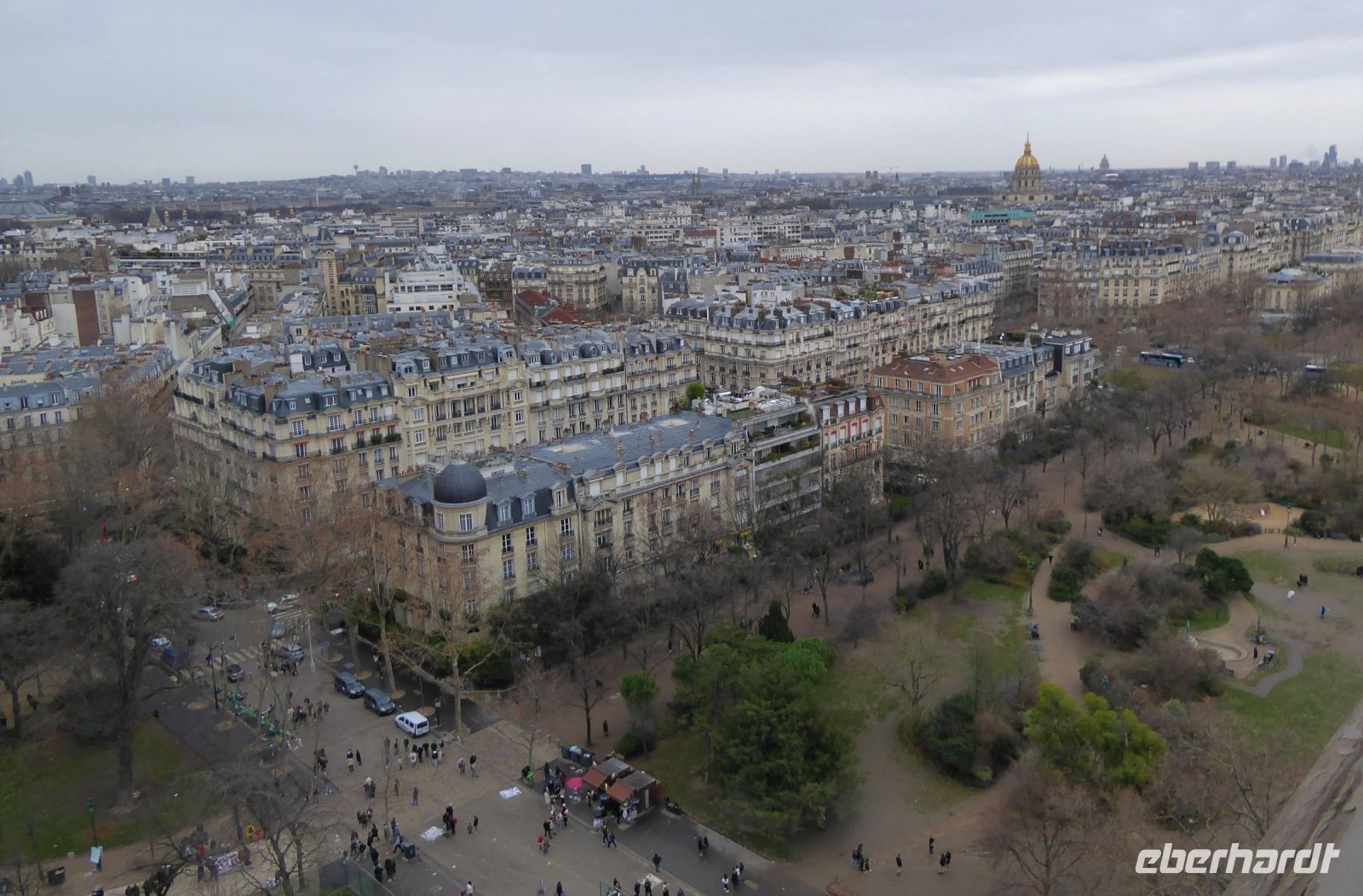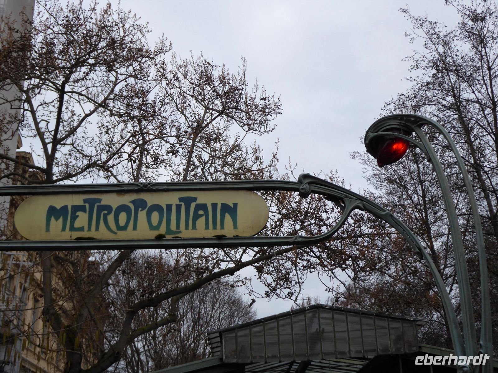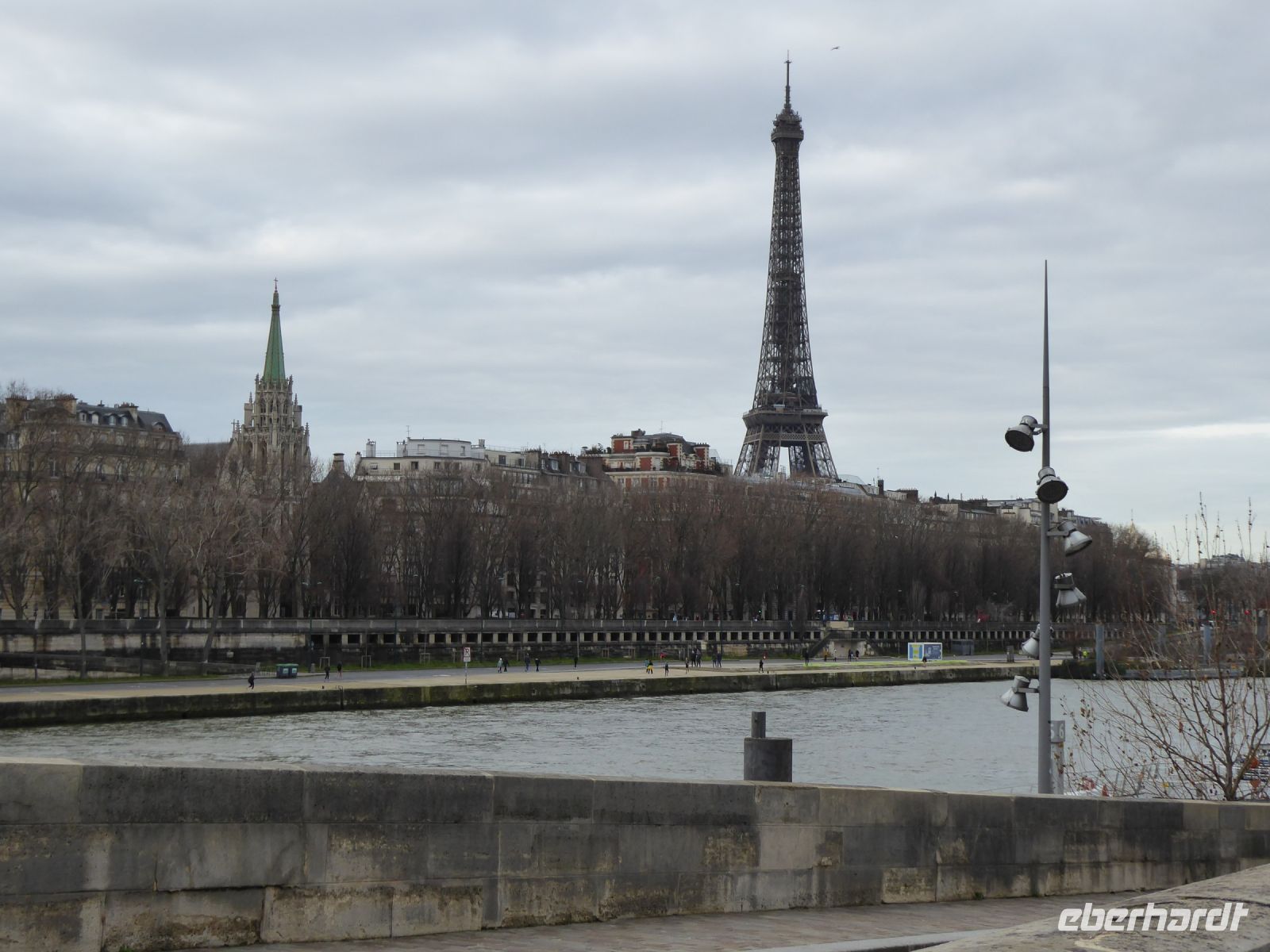 Unser nächstes Etappenziel lag oberhalb der Métrostation Trocadéro. Doch zuerst warfen wir einen kurzen Blick in den von einer hohen Mauer umfriedeten Friedhof Passy. Die Bestattungskultur in Frankreich erinnert an alte römische Traditionen: Den Toten werden kleine Häuser gebaut, die Grabstätten mit massiven Steinplatten abgedeckt. Der 1997 verstorbene letzte Kaiser von Vietnam, Bao Dai, hat hier seine letzte Ruhestätte. Berühmte Künstler, Komponisten, Schauspieler, Politiker und Unternehmer beiderlei Geschlechts sind auf diesem Friedhof beerdigt. Wenige Schritte davon entfernt stand das ehemalige Palais du Trocadéro. Für die Weltfachausstellung Paris 1937 wurde das Palais weitgehend abgetragen, geblieben sind die beiden Seitenflügel, die nun nur noch durch eine große Freifläche verbunden sind, von der aus man den schönsten Blick auf den Eiffelturm hat. Eine Grünanlage mit Springbrunnen verbindet die Plattform mit dem Seineufer. Über die Brücke d´Iéna erreicht man in wenigen Metern die gläserne Absperrung, die zur Sicherung vor Attentaten den Eiffelturm, das geliebte und gehasste Wahrzeichen der Metropole, umgibt. Da wir es etwas eilig hatten, denn wir waren zum Mittagessen in dem vor kurzem neu eröffneten Restaurant, Brasserie Madame' in luftiger Höhe von 56 Metern verabredet, hasteten wir an den Wartenden vorbei. Durch ein kleines Pförtchen gelangten wir direkt zur Sicherheitsschleuse am Eingang, und schon wenige Minuten später brachte uns der restaurierte historische hydraulische Aufzug in die erste Etage des Stahlkolosses: 364 Stufen gespart! Gemütlich betrachteten wir den Rundum-Ausblick, den die erste Etage bietet. Nichts für zarte Nerven sind die begehbaren Glasplatten, durch die man die ameisenkleinen Menschen zwischen den vier gewaltigen Pfeilern scheinbar planlos hin und her wuseln sieht. Passend zum neuen Jahr startete unser Menu mit einem Glas Champagner. Salat mit Ziegenkäse, eine leckere Kürbiscremesuppe, gefolgt von Rochenflügeln oder Geflügelfilet und zum Dessert eine Süßspeise aus echt französischem Reis aus der Camargue - es verstand sich von selbst, dass wir uns für den Rückweg nach dieser Schlemmerei für die Treppe entschieden!