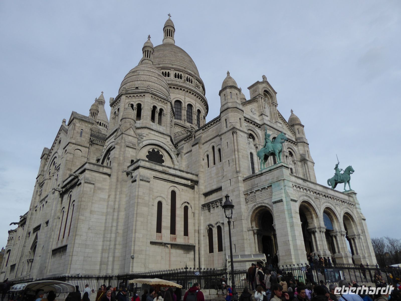 An unserem nächsten Ziel, dem Montmartre herrschte, wie bereits vermutet, reges Treiben. Tausende Touristen drängten sich durch die engen Straßen und so hielten wir unseren Besuch entsprechend kurz. Der Funiculaire, der Schrägaufzug, brachte uns schnell nach oben und nur noch wenige Treppenstufen trennten uns von Sacré-Cœur. Wir bestaunten die helle, strahlend weiße Kirche, deren imposante neobyzantinische Kuppeln die Anhöhe des immerhin 130 Meter hohen Hügels zu verlängern scheinen. Die Vorhalle des Gebäudes wird von zwei monumentalen Reiterstandbildern flankiert: Ludwig IX, der Heilige und Jeanne d´Arc. Mit dem Bau der Kirche wollte der katholische Klerus ein Zeichen setzen für die moralische und politische Erneuerung der dritten Republik Frankreichs. Auf der übervollen Place de Tertre flüchteten wir in ein gemütliches Restaurant und genossen eine späte Mittagspause, bei der wieder ein Glas Wein nicht fehlen durfte. Nach einem kleinen Rundgang durch die fabelhafte Welt der Amélie warfen wir noch einen kurzen Blick auf die berühmte blaue Wand, wo in über 250 Sprachen die unsterblichen drei Worte: je t´aime, ich liebe dich, geschrieben stehen.