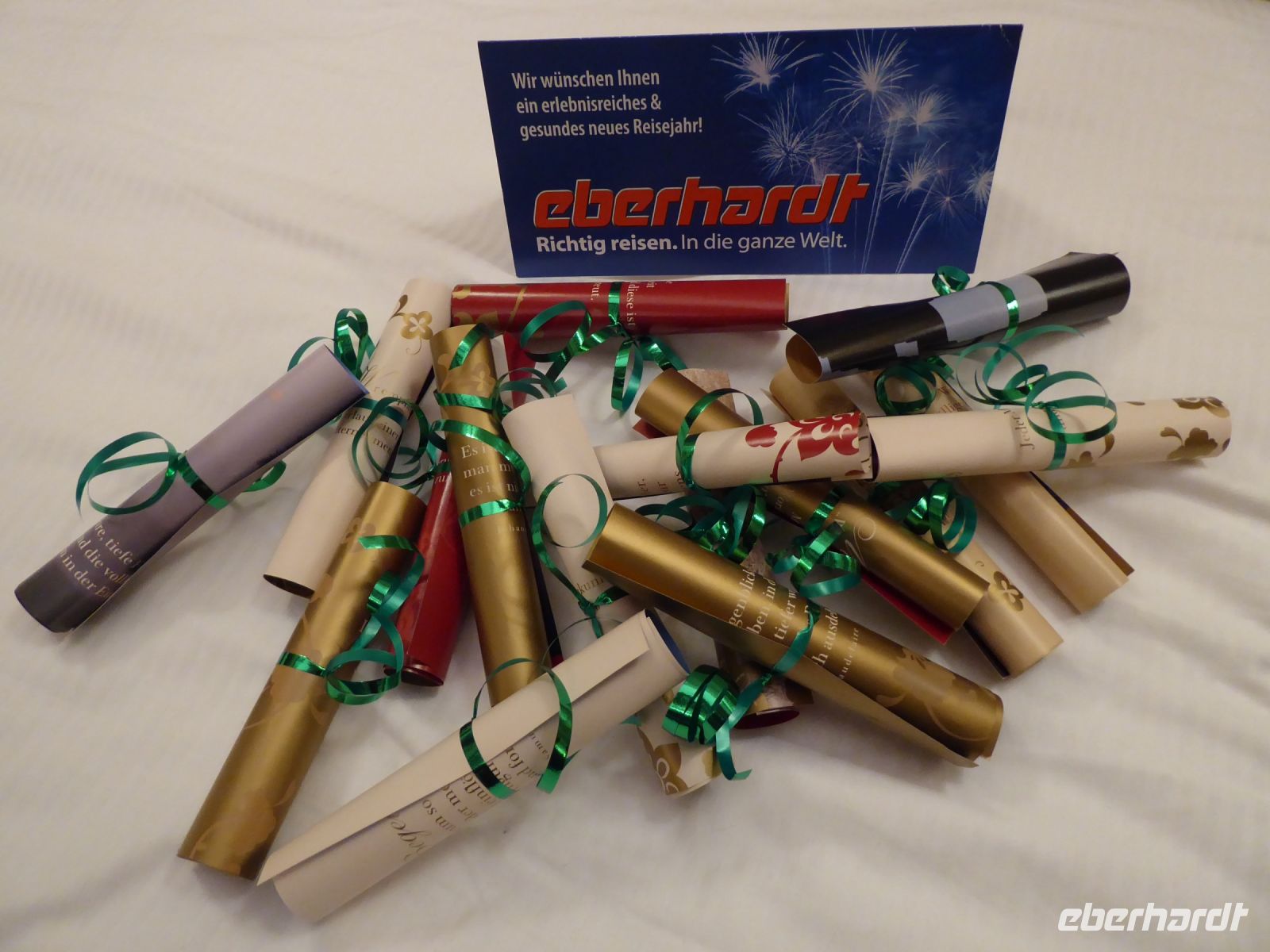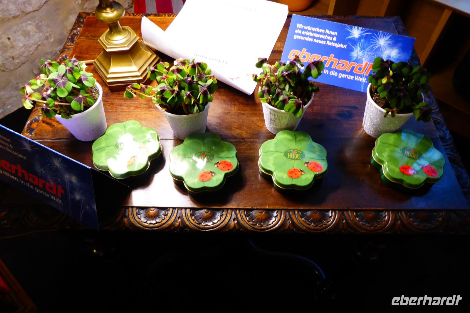 Nach einer kurzen Nacht galt unser Interesse am ersten Tag des neuen Jahres zuerst einem kräftigen Frühstück mit Kaffee und frischen Säften, bevor wir uns wieder in der Lobby des Hotels trafen. Dort erwarteten meine Gäste bereits die Neujahrsglückwünsche von Eberhardt Travel und die extra aus dem Saarland importierten Töpfchen Glücksklee - ich hoffe, die Pflänzchen haben den Rückflug annähernd so gut überstanden wie die Zuganreise!