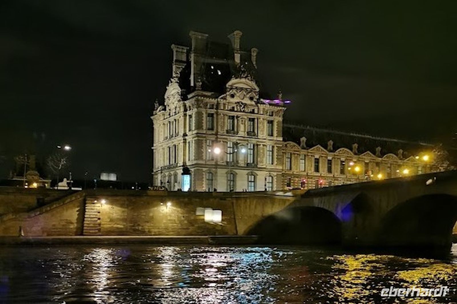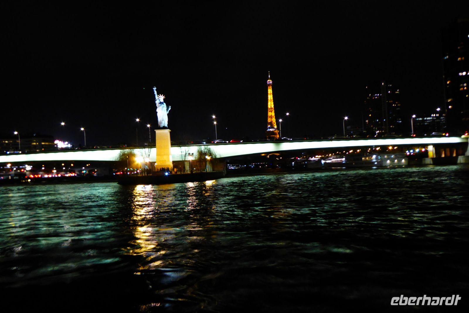 Am Spätnachmittag kehrten wir zurück ins Hotel und nutzten die Pause, um uns auf den festlichen letzten Abend des Jahres vorzubereiten. Mit dem Taxi gelangten wir in wenigen Minuten zum Schiffsanleger unterhalb des Eiffelturms, wo wir auch gleich an Bord der „Bretagne“ gehen konnten, einem Schiff aus der Flotte der Bateaux Parisiens. Freundlich empfangen, wurden wir zu unseren Plätzen geführt und genossen über vier Stunden bei einer herrlichen Kreuzfahrt über die Seine die festliche Atmosphäre, die köstlichen Speisen und den exzellenten Service. Zwei Sängerinnen begleiteten unsere Fahrt durch die Nacht mit französischen Chansons und internationalen Evergreens. Für Gänsehautmomente sorgte ein glockenklares `Ave Maria`, als unser Schiff gerade an Nôtre-Dame vorbeizog. Um Mitternacht perlte prickelnder Champagner im Glas, die Freiheitsstatue hob ihre Fackel in den Himmel und der Eiffelturm glänzte mit unseren Augen um die Wette. Mit guten Wünschen, Küsschen und ausgelassenen Tänzen starteten wir ins neue Jahr. Bonne année à vos tous!